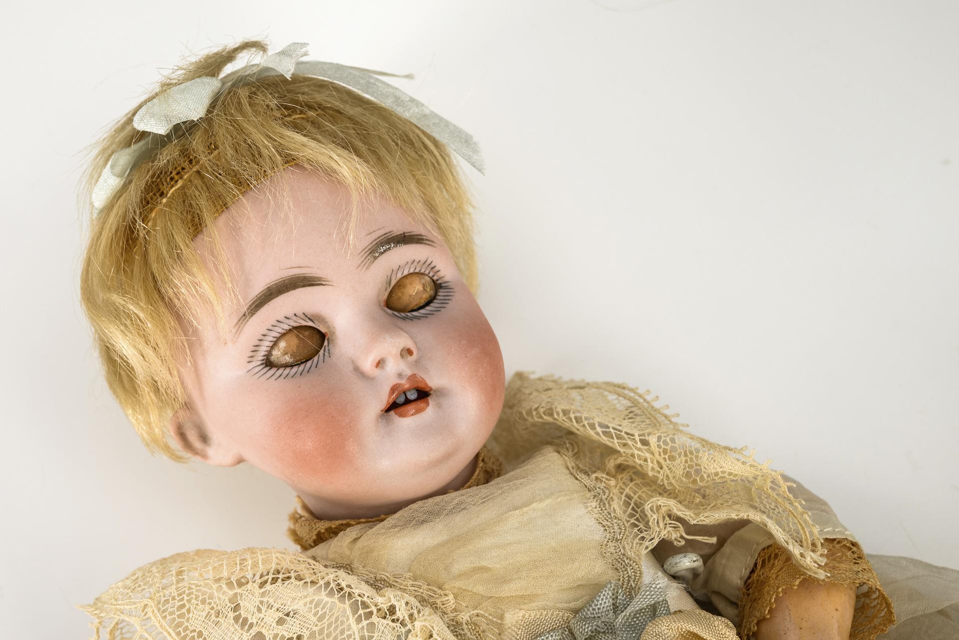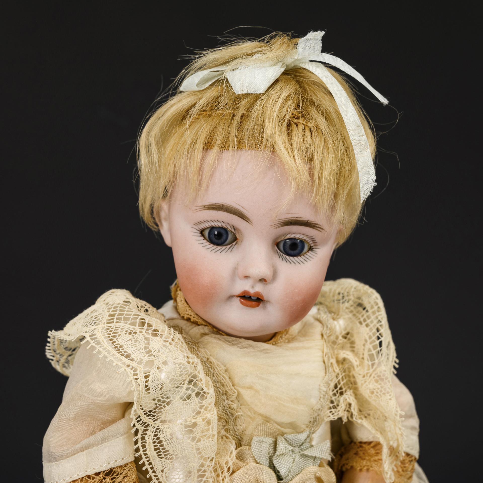 Cranked head, blue sleeping eyes, blonde mohair beads. 9-part jointed body. Light-colored dress. Head x-rayed: without defects.
