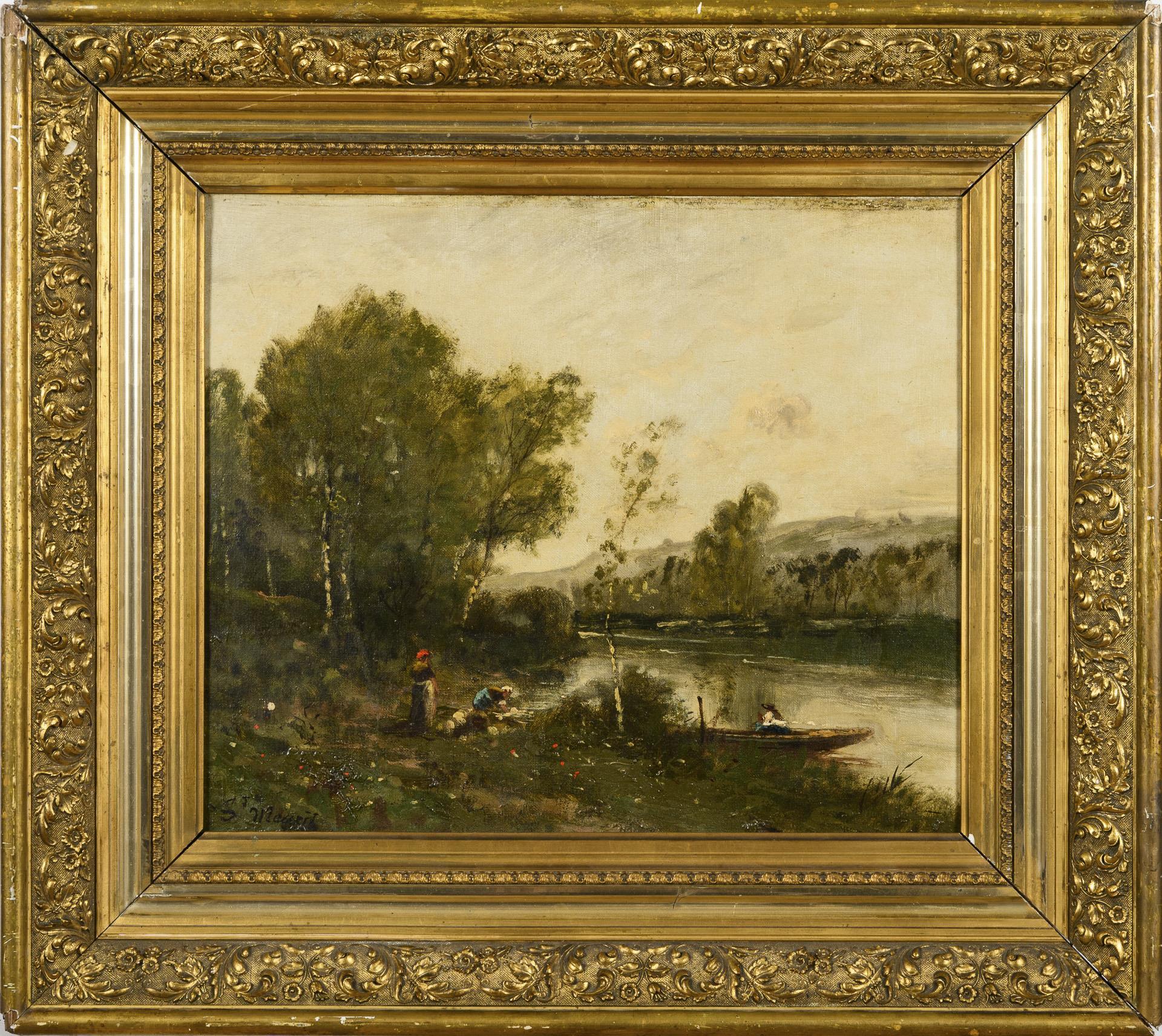 French river landscape with washerwomen by the river under a cloudy sky. Restored with backing.