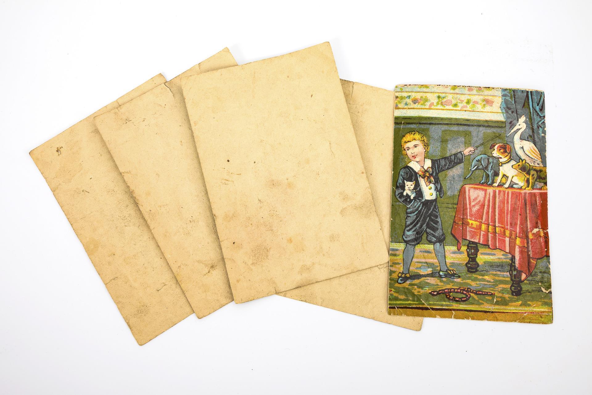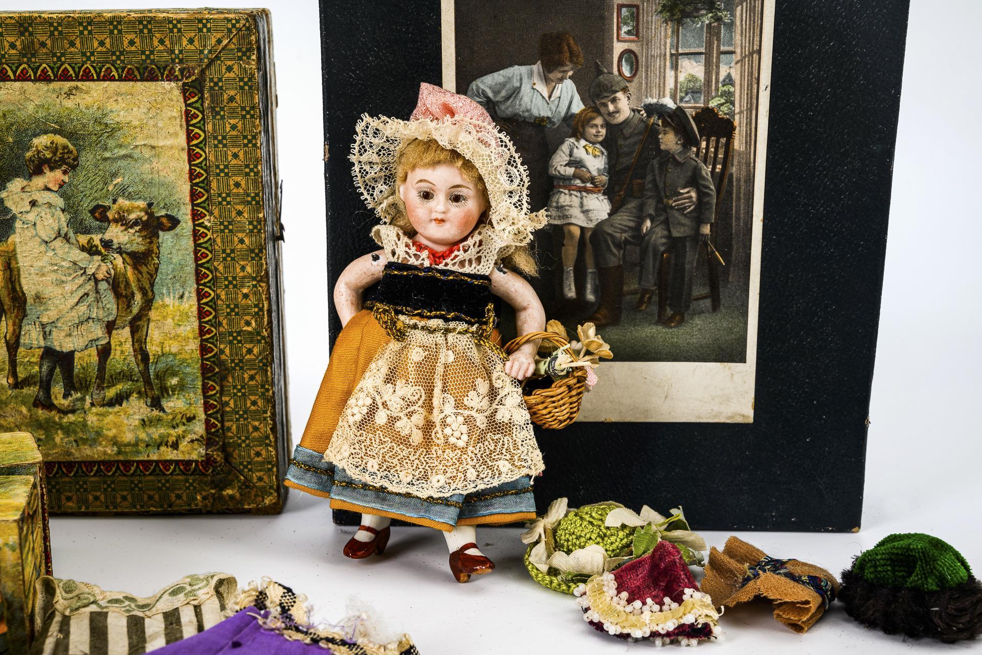 Small all-bisque doll (L 13 cm) with fixed head, clothes and accessories, in cardboard box with old postcard "Father on vacation" on the lid. Small chips to the arm cotter pins. / Old puzzle with 6 dice and 5 templates, all lithographed in color. In original box. Small defects and strong signs of age, 5 x 11.5 x 15 cm.