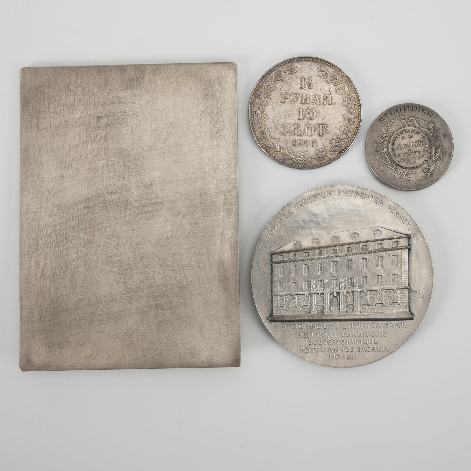 Large Swedish plaque: Officer on horseback in front of standing soldiers "Kong. Norr a Skanska Infanterieregementes Officerscorps"; inscribed with monogram KH. Stockholm 1957, master S&Co hallmarked. / 3 portraits of men from the Wallenberg family. On the reverse palace view "Stockholms Enskilda Bank... 1956"; inscribed Ivar J-son. Swedish silver hallmarks, Sporrong & Co. / Portrait of a woman titled Rossia in Cyrillic, Ad. Rives inscribed. On the reverse angel and branch on the attached plate "Le Commerce et l'Industrie 1897", engraved name above. Argent hallmarked. / "1 1/2 rouble 10 zlotys 1836". Double-headed eagle with Cyrillic inscription on the reverse. Cyrillic letters and numbers on the edge. Ruble strong signs of age/use, otherwise minimal.