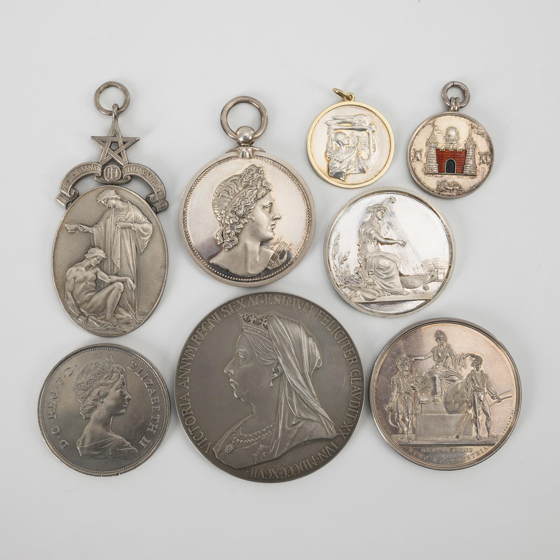 Portrait of Victoria on the occasion of the 60th coronation anniversary "Victoria Annum Regni Sexagesimum Feliciter Claudit" 1907; TB inscribed. On the reverse portrait as a young woman ""Longitudo Dierum in dexterabius et in sinistra Gloria 1837". Unpunched, silver? Ø 5.6 cm, 84 g. / Woman playing the harp. On the reverse laurel wreath with English dedication from the "Trinity Coll. of Music" 1924. Indistinct English hallmarks on the edge, master JAR. / Oval plaque with eyelet (Silver Permanent Steward's Jewel): Standing allegory with crouching sick person; banner "Aegros Sanat Humanitas" with monogram FH (Freemasons Hospital) under pentagram (Masonic star). Inscribed CLD (Doman). Engraved on the reverse "Bro. W. S. Wood No. 4606". London 1928 R.S (Robert Arthur Johnson) hallmarked. 38 g. / Small silver plaque pendant: Pierrot playing the mandolin. Co-cast hallmarks Birmingham 1902, Master JC&Co Ld. / Football pendant medal: city gate with red enamel; indistinctly inscribed. On the reverse inscription "Surrey Country Football Association", engraved in the center "The Youths' Cup Winners 1926-27". Co-cast hallmark Birmingham, Master V&S. / Enthroned allegory wreathing farmers and workers "Semper Armis Nunc et industria"; Lizars inv., Ingram sc. inscribed. On the reverse inscription "Highland and Agricultural Society of Scotland", engraved in the wreath with name and date 1830. On the rim English engraving for the sheep exhibition in Dufries. Not hallmarked. / Medal with suspension loop: portrait of Apollo. On the reverse inscription "Royal Academie of Music. Instituted 1822", in the laurel wreath engraving for G. Wendolyn and M. Webster 1915. unstamped. / Portrait "D.G.Reg.F.D. Elizabeth II.". Double portrait on reverse "H.R.H, The Prince of Wales and Lady Diana Spencer. 1981"; PN inscribed. Fluted edge. Not hallmarked. 28 g. Parts signs of age/use.