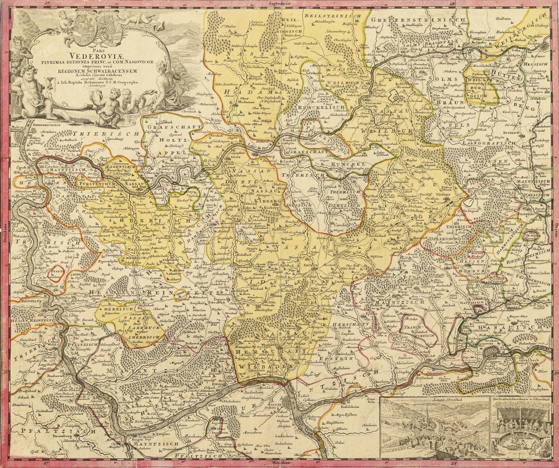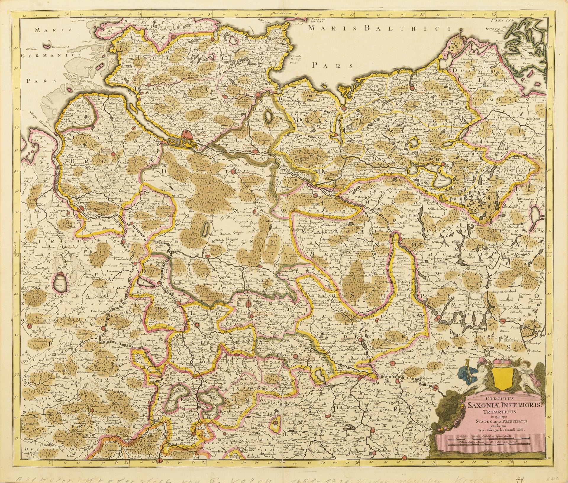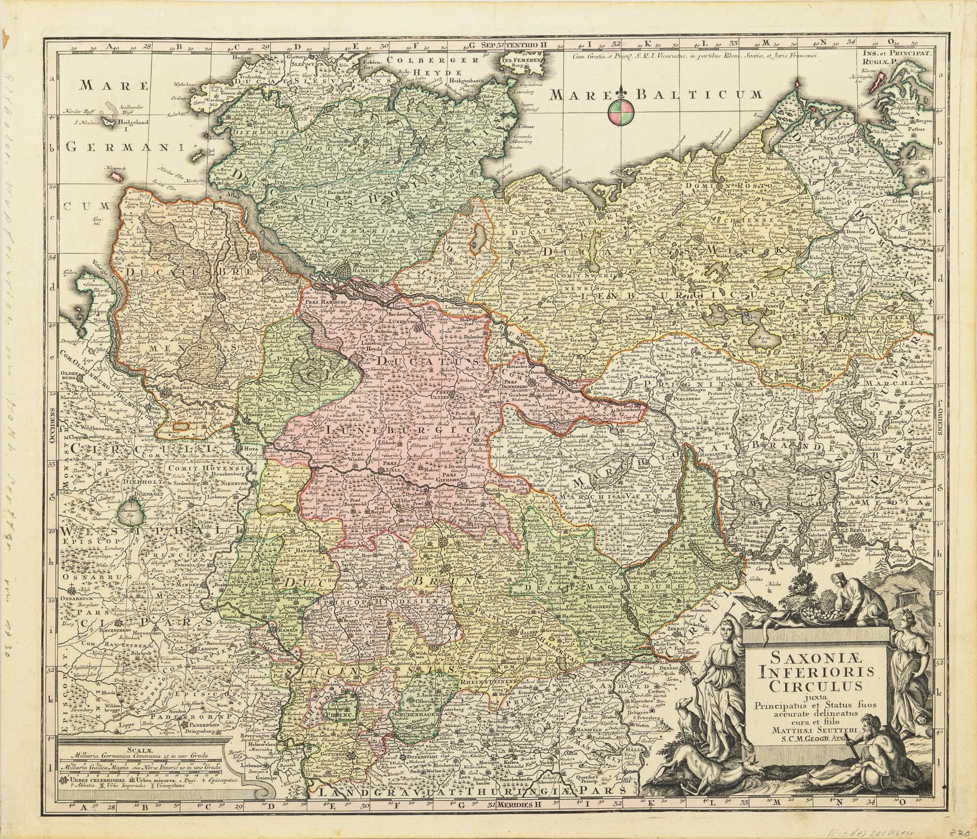 "Nassovia Comitatus", colored copper engraving, typography with Latin description of the area on the reverse. (38 x 49 cm, framed 61 x 73.5 cm). / Seutter: "Saxoniae Inferioris Circulus", Lower Saxony, (sheet 54 x 63 cm) / Valck: "Circulus Saxoniae Inferioris Tripartitus", Lower Saxony, (sheet 52 x 61 cm). / Homann: "Pars Vederoviae ... Schwalbacensem ...", (sheet 47 x 56 cm). / Person: "Ampt Neustatt in Hessen", (sheet 43 x 60 cm). / Jaillot: "Le cercle de Franconie", (sheet 54 x 64 cm). / Homann: "Totius Marchionatus Lusatiae", (sheet 55 x 64 cm). / "Carte du Duché de Silesie", 1779, (sheet 53 x 63 cm). .