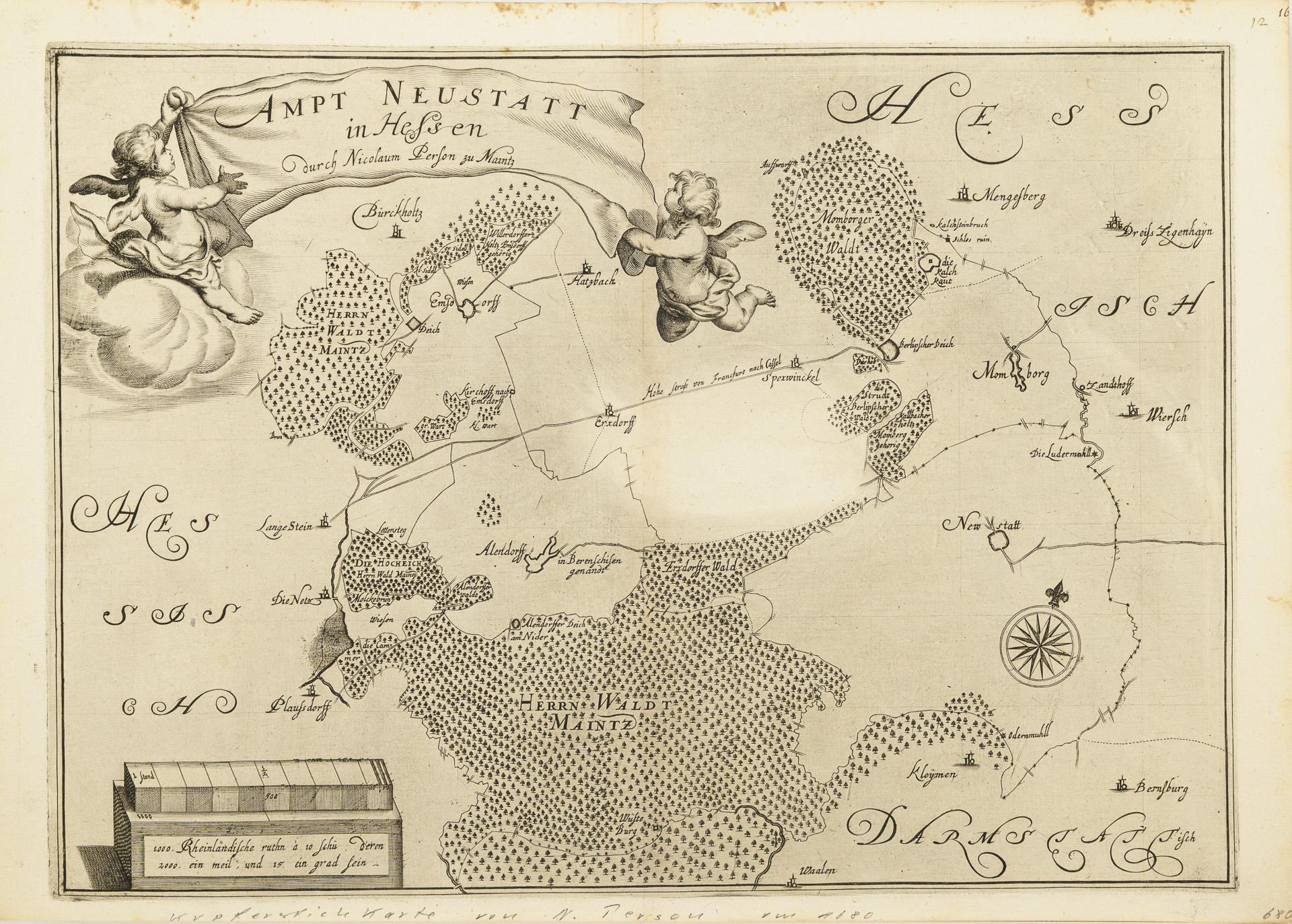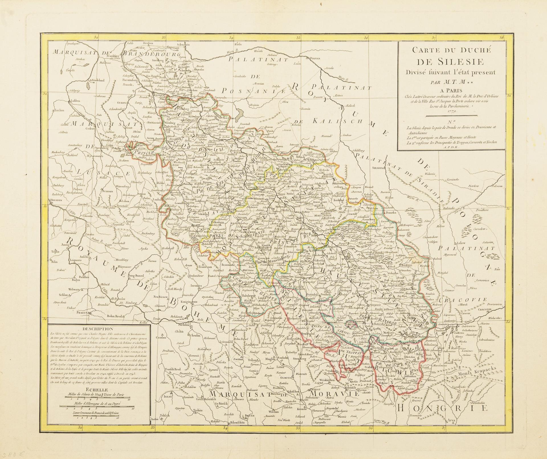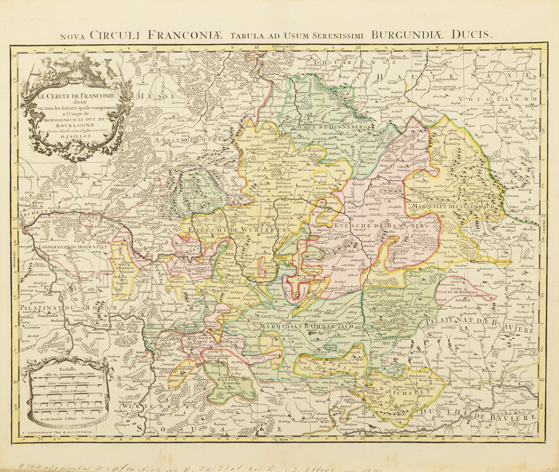 "Nassovia Comitatus", colored copper engraving, typography with Latin description of the area on the reverse. (38 x 49 cm, framed 61 x 73.5 cm). / Seutter: "Saxoniae Inferioris Circulus", Lower Saxony, (sheet 54 x 63 cm) / Valck: "Circulus Saxoniae Inferioris Tripartitus", Lower Saxony, (sheet 52 x 61 cm). / Homann: "Pars Vederoviae ... Schwalbacensem ...", (sheet 47 x 56 cm). / Person: "Ampt Neustatt in Hessen", (sheet 43 x 60 cm). / Jaillot: "Le cercle de Franconie", (sheet 54 x 64 cm). / Homann: "Totius Marchionatus Lusatiae", (sheet 55 x 64 cm). / "Carte du Duché de Silesie", 1779, (sheet 53 x 63 cm). .