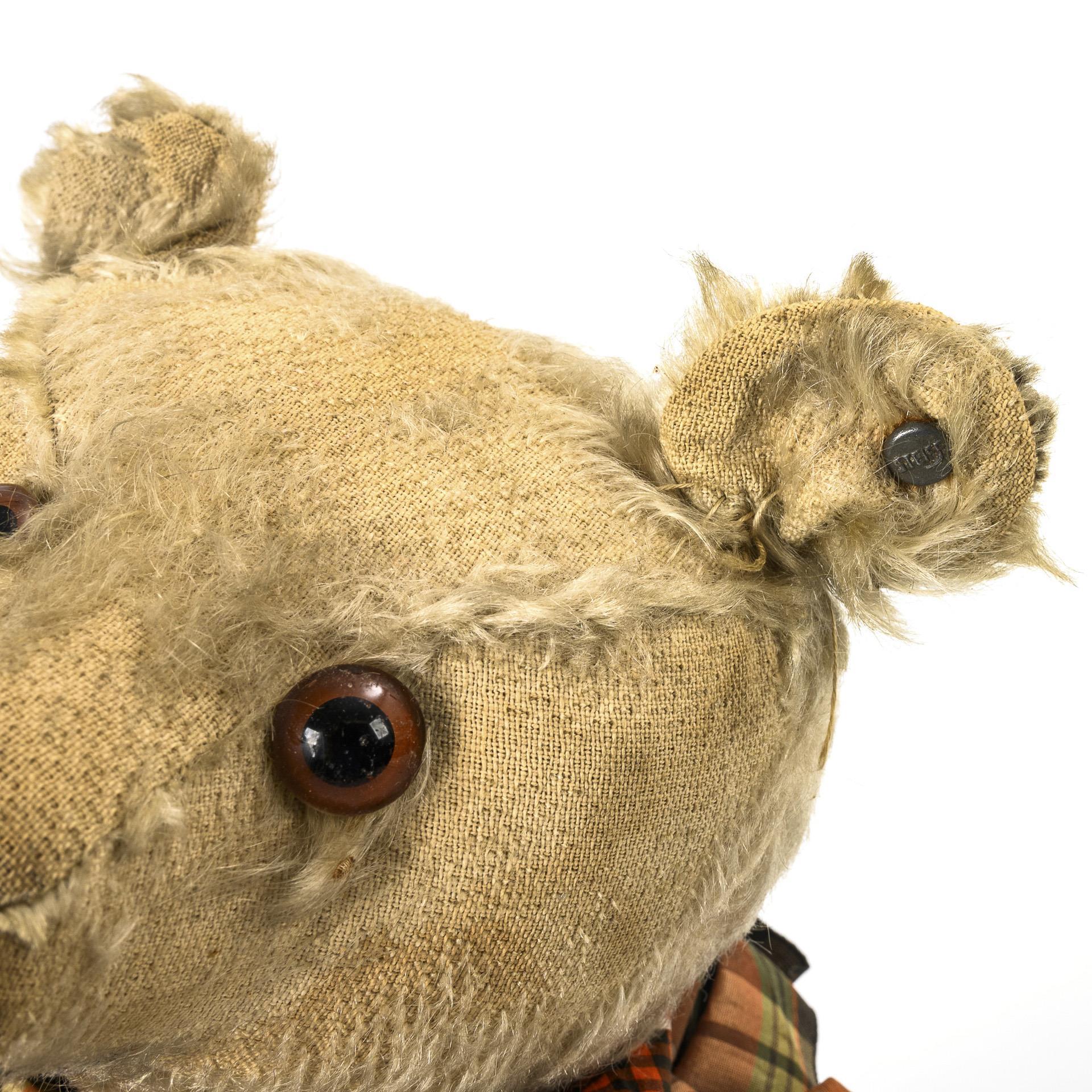 White Steiff teddy (possibly a teddy clown) with dark embroidery, front paws sewn over with fabric, loose stuffing, checkered fabric bow, button with long "F", L 45 cm. / High quality Thuringian? Teddy with very pointed muzzle, blond, glass eyes, black embroidery, one of the felt paws overstitched, l 49 cm. / Wheeled dog with high-quality frame, shoe button eyes, red felt inner ears, nose garnish and 3 claws, bald patches of fur, 34 x 40 cm. Comes with an old children's accordion, marked "Victorian Squeeze Box". All animals with strong signs of age and repairs, bald patches.