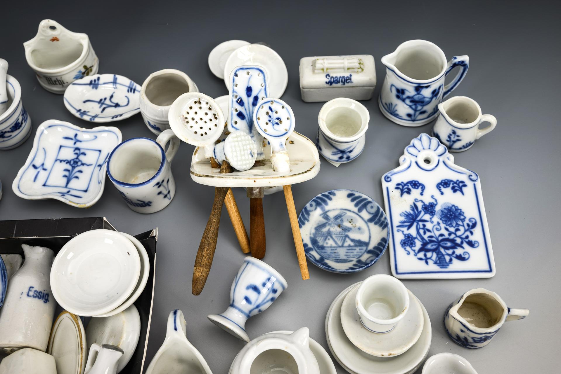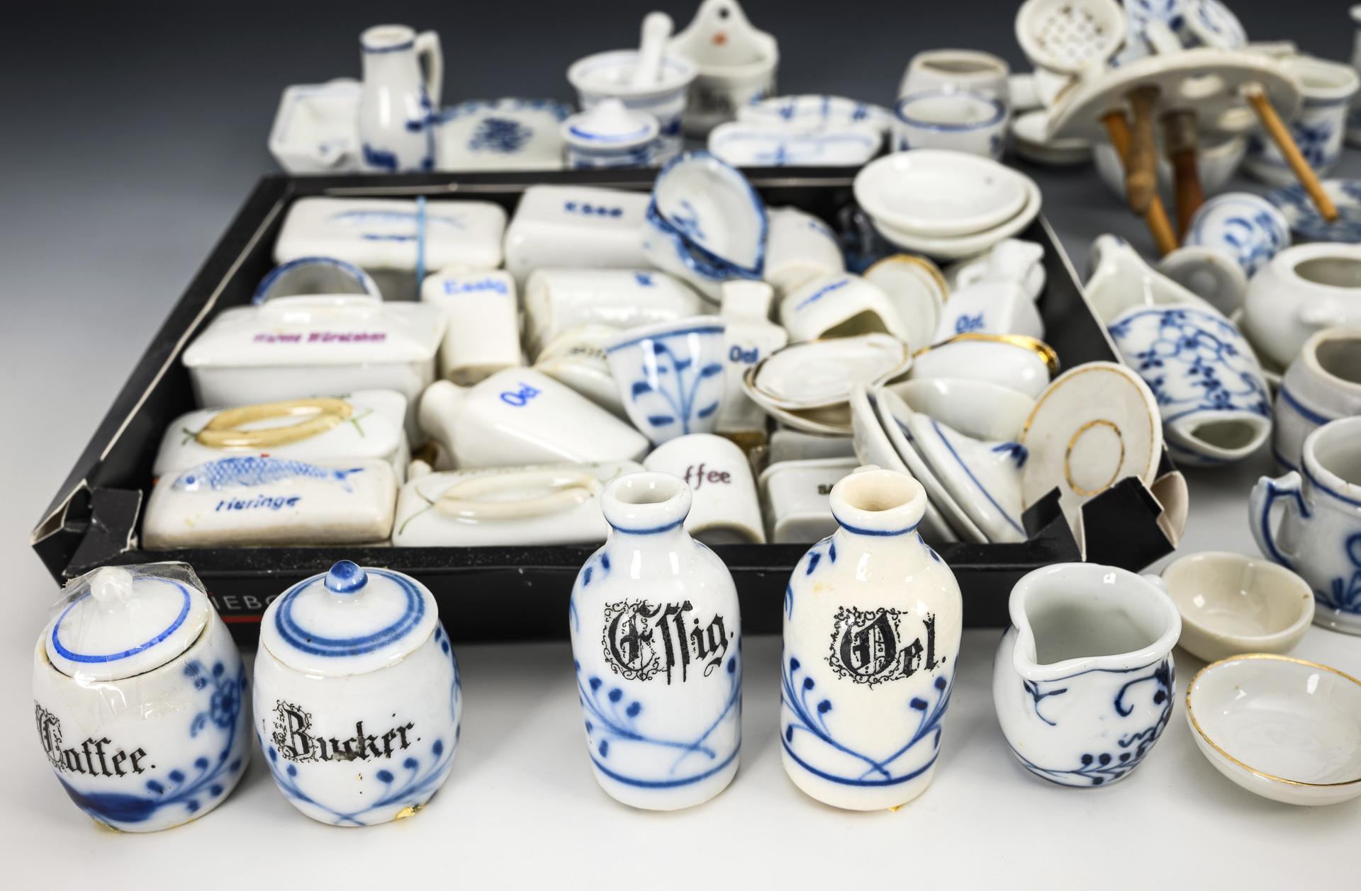 Numerous pieces of crockery with onion pattern and strawflower decoration, some white with gold rim. Including 4 tins of "Warme Würstchen" and "Heringe". Small defects and areas of repair.
