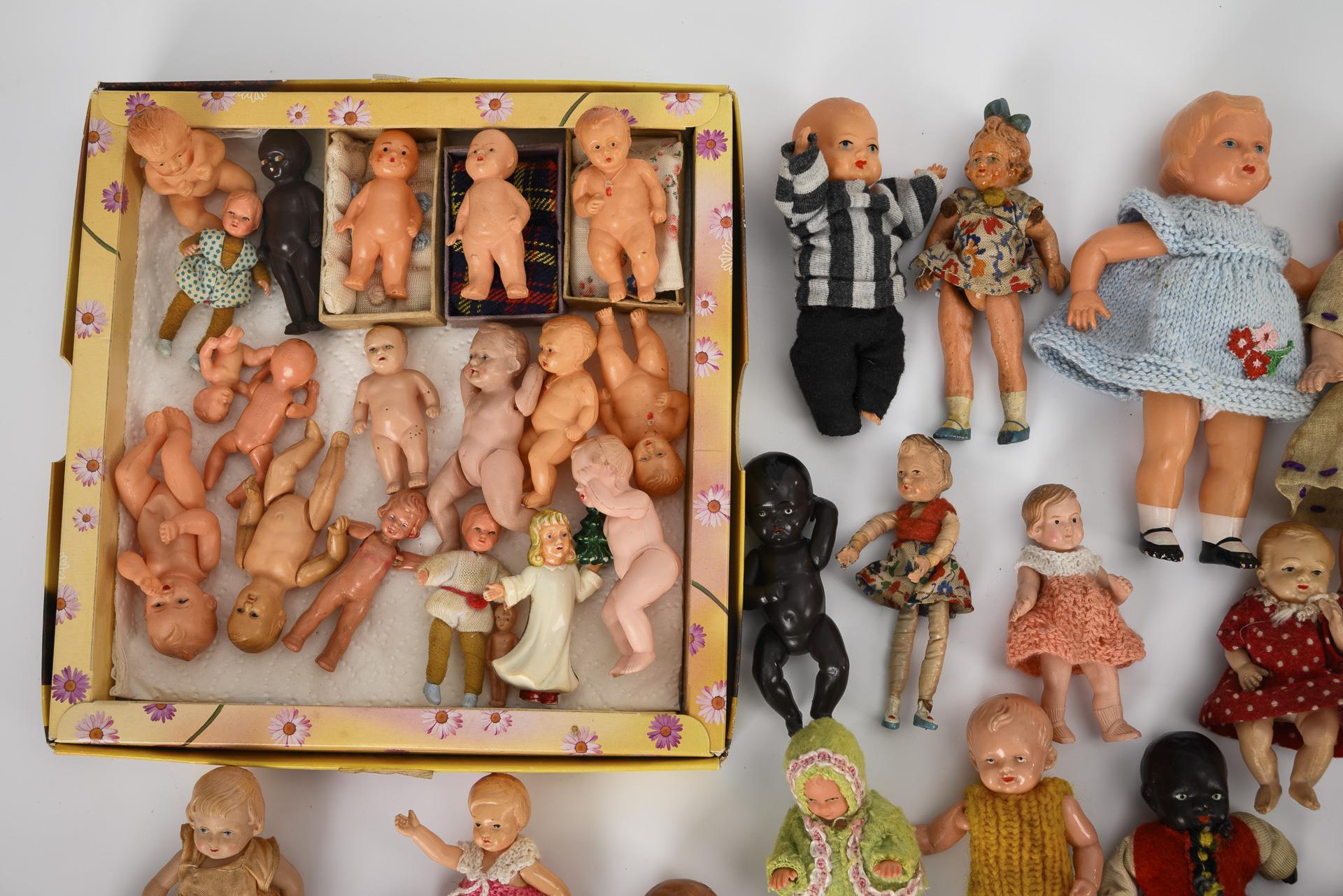 Numerous nude and clothed dolls, mostly made of celluloid. Some with small defects.