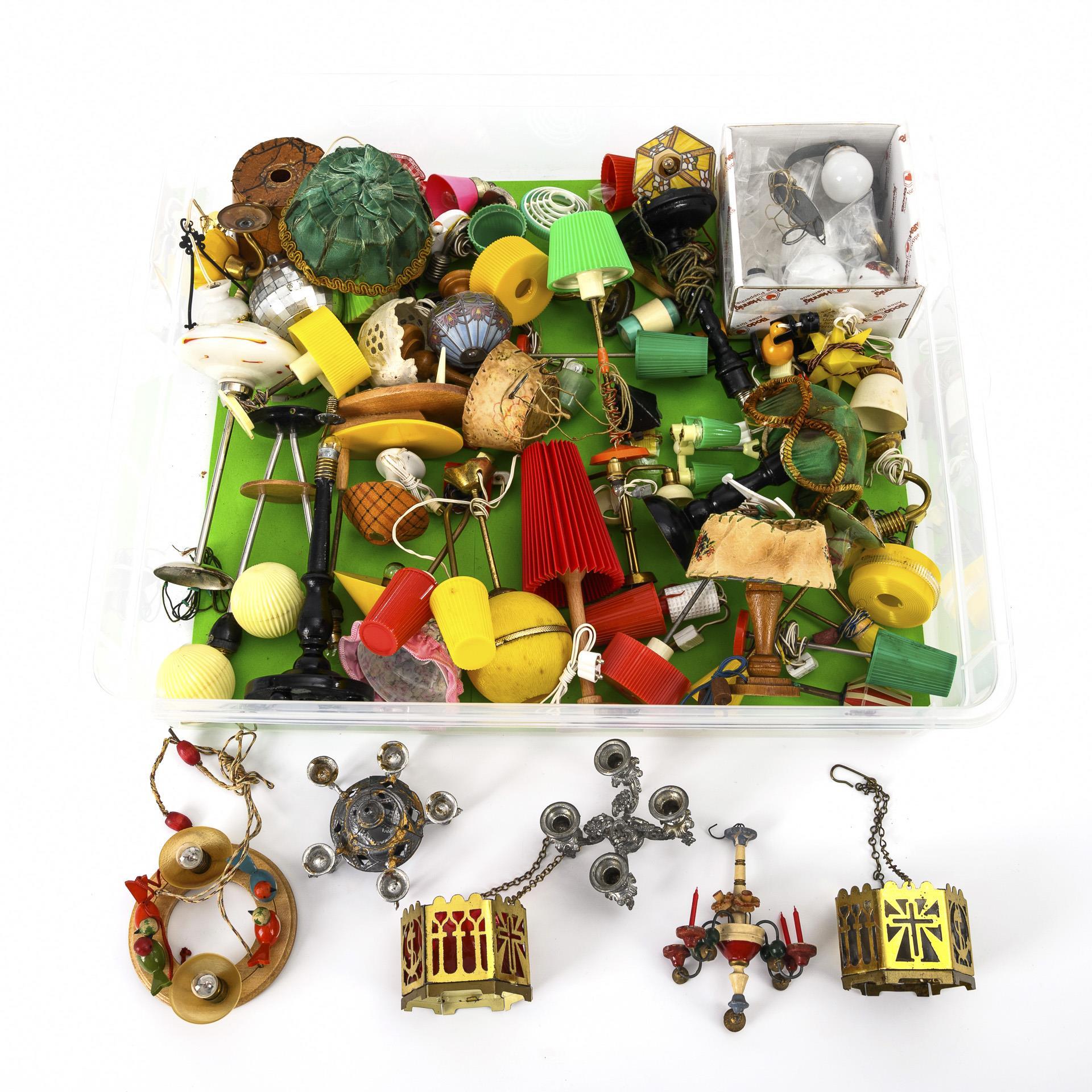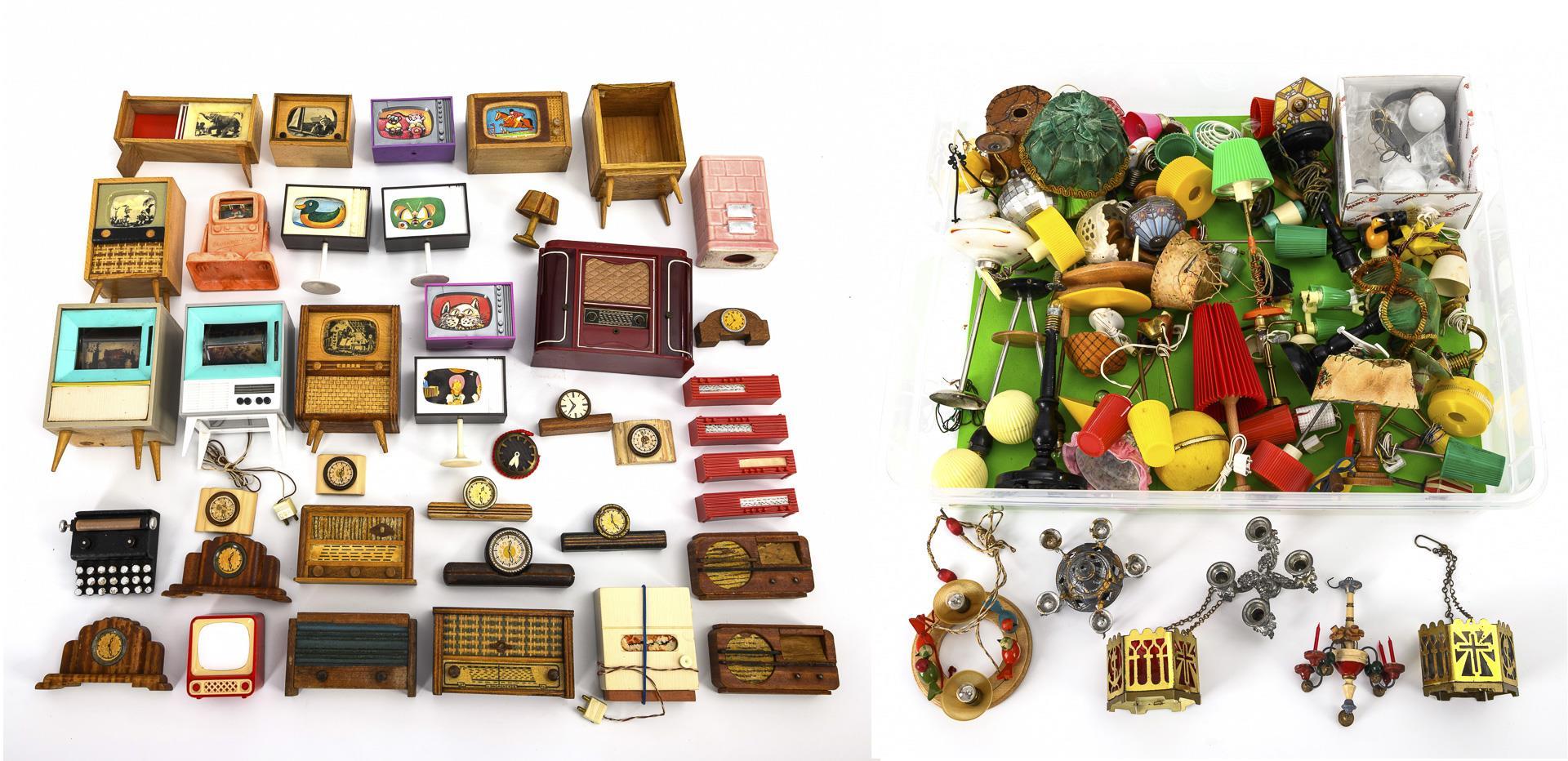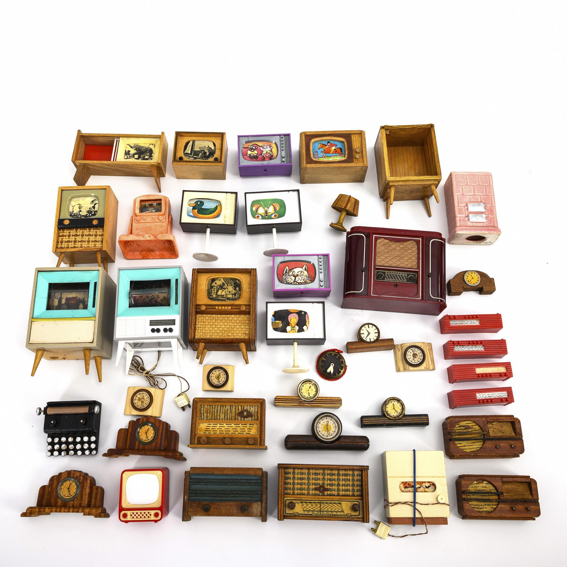 A collection of radios, televisions, clocks and lamps for the doll's house.