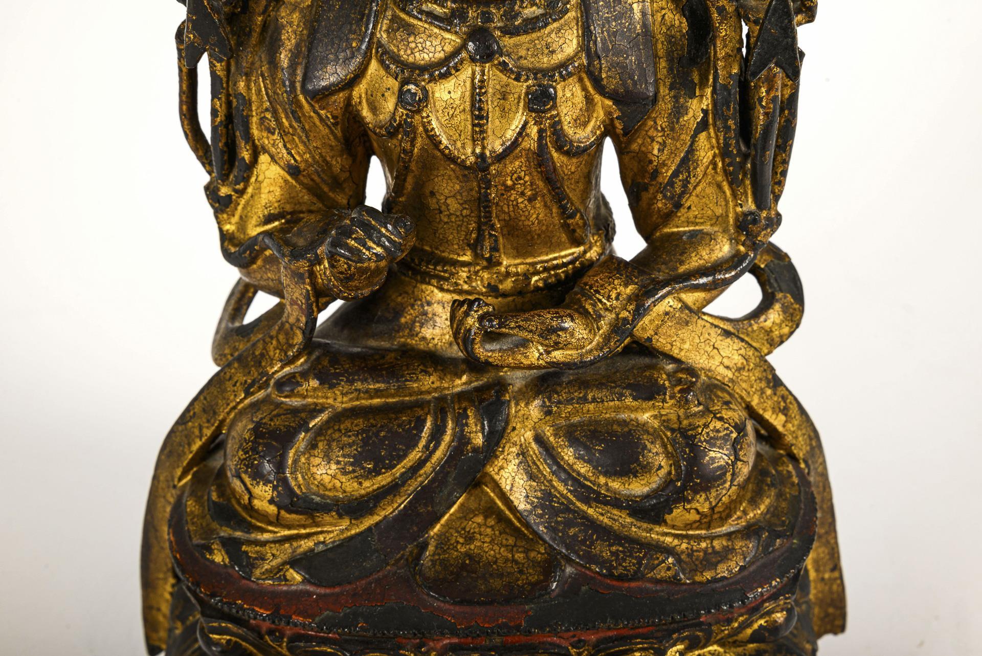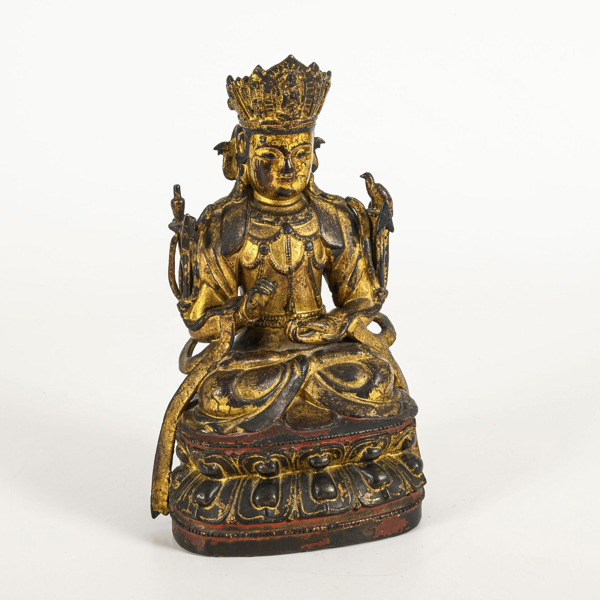 Guanyin, seated in meditation, on a double lotus throne. The palms in vitarka mudra, from which lotus stems grow, carrying a vase and a bird (parrot) on the shoulders. A tiny Buddha figure on the crown. Large parts of the gold and reddish-brown paint preserved. Hollow inside and also set in dark red.