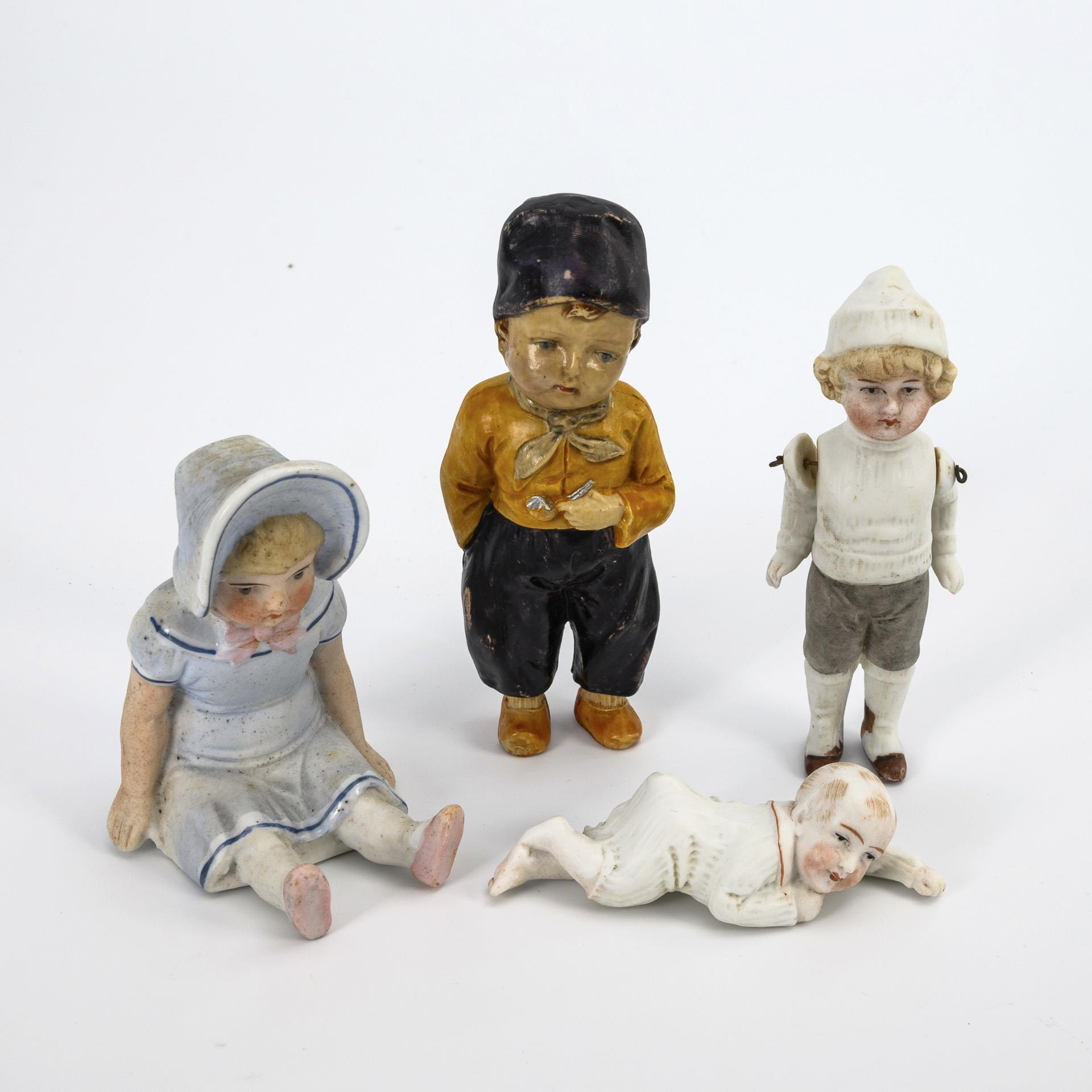 8 different whole bisque dolls, 1 Schiel doll with mass body, 1 Minerva doll as a Dutch boy, 1 defective snow child's chest head and approx. 21 glazed miniature dolls. Parts with minor defects and restorations.
