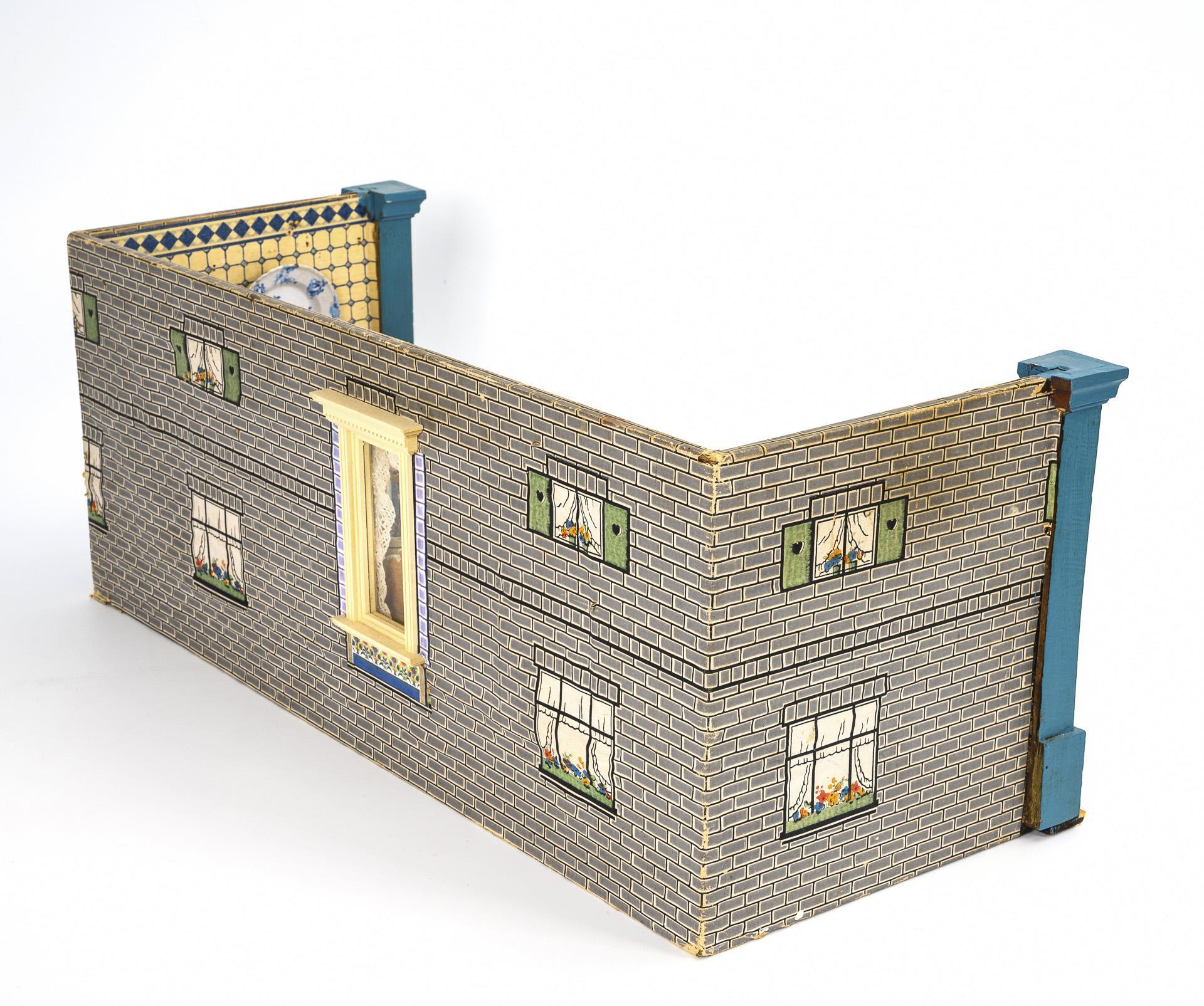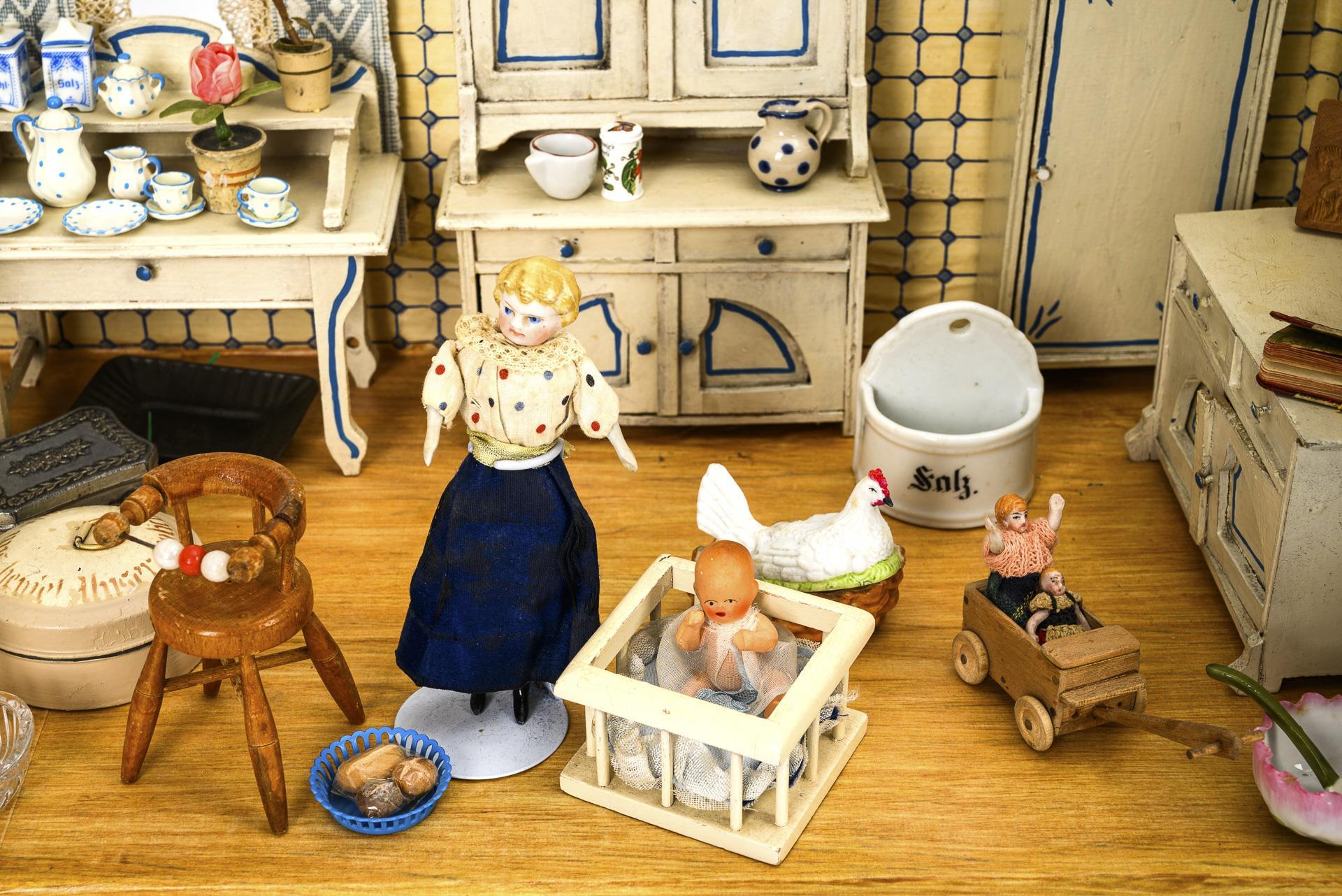 One-room room with one window, curtains, tile-look wallpaper and wood-look floor paper. Furnished with 5 blue and white furniture, white tin stove and some accessories made of porcelain, wood and tin. Comes with 4 dolls. Worn, with signs of age and additions.