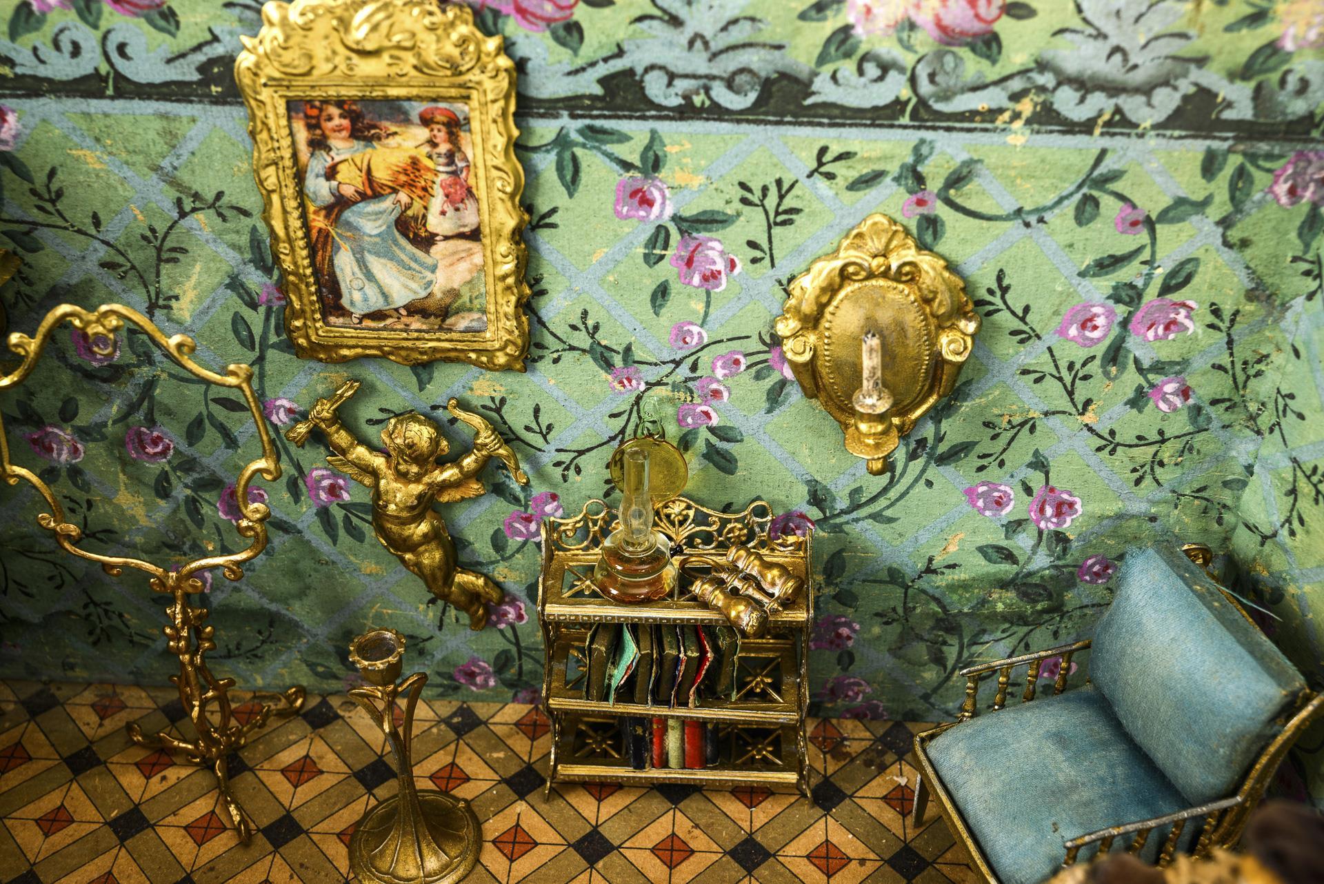 Trapezoidal one-roomed room, furnished as an elegant doll's parlor. Comes with 2 dolls and small cookie dog. Worn, with signs of age.
