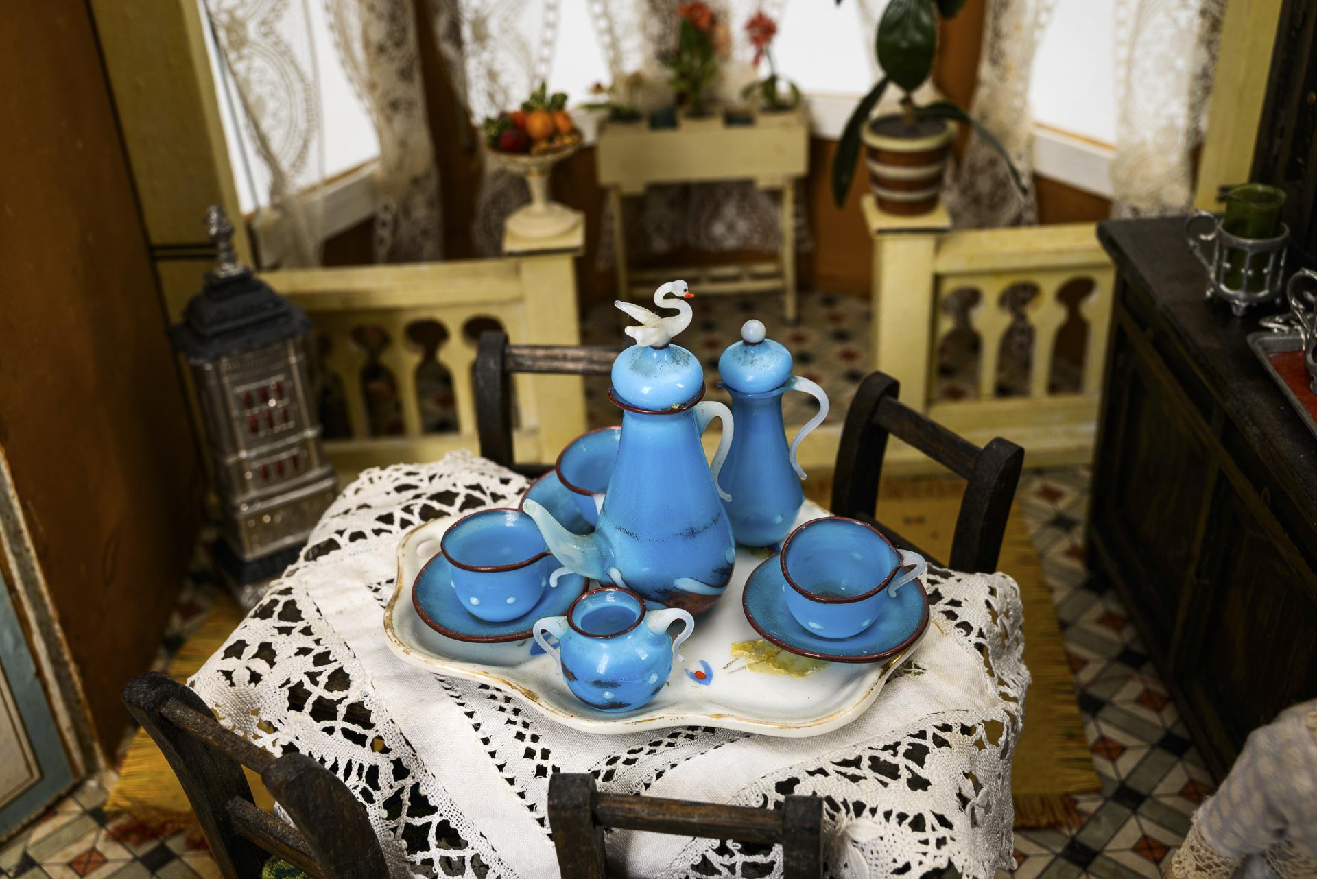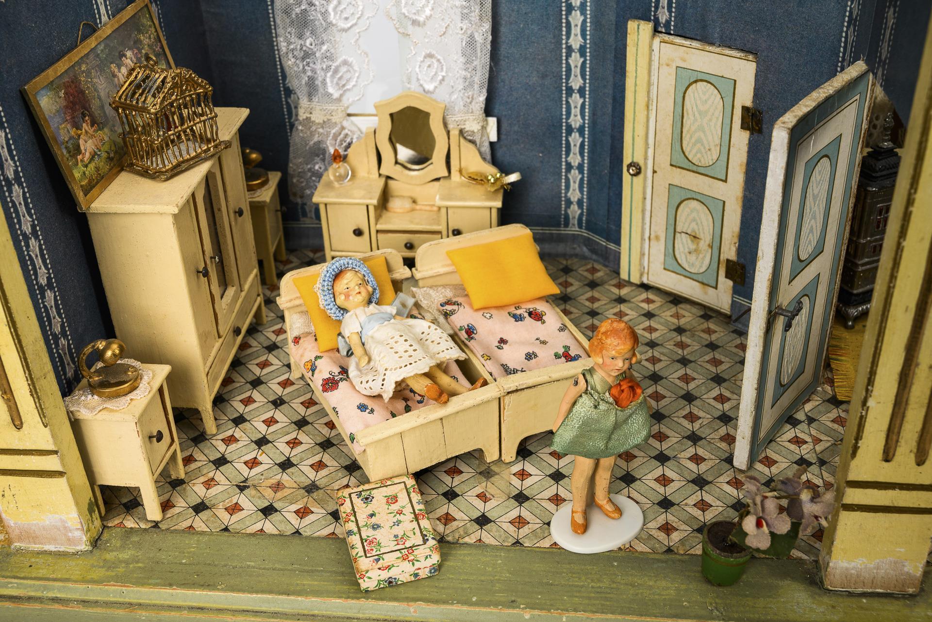 Two-roomed room with glazed windows and 2 movable doors. Furnished as a bedroom with white painted furniture and as a dining room with dark brown furniture and pewter stove. In addition, 3 small plates with defects. Worn, reworked and repapered.