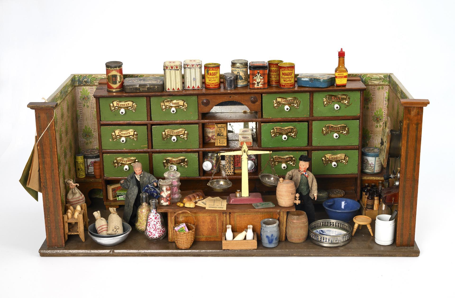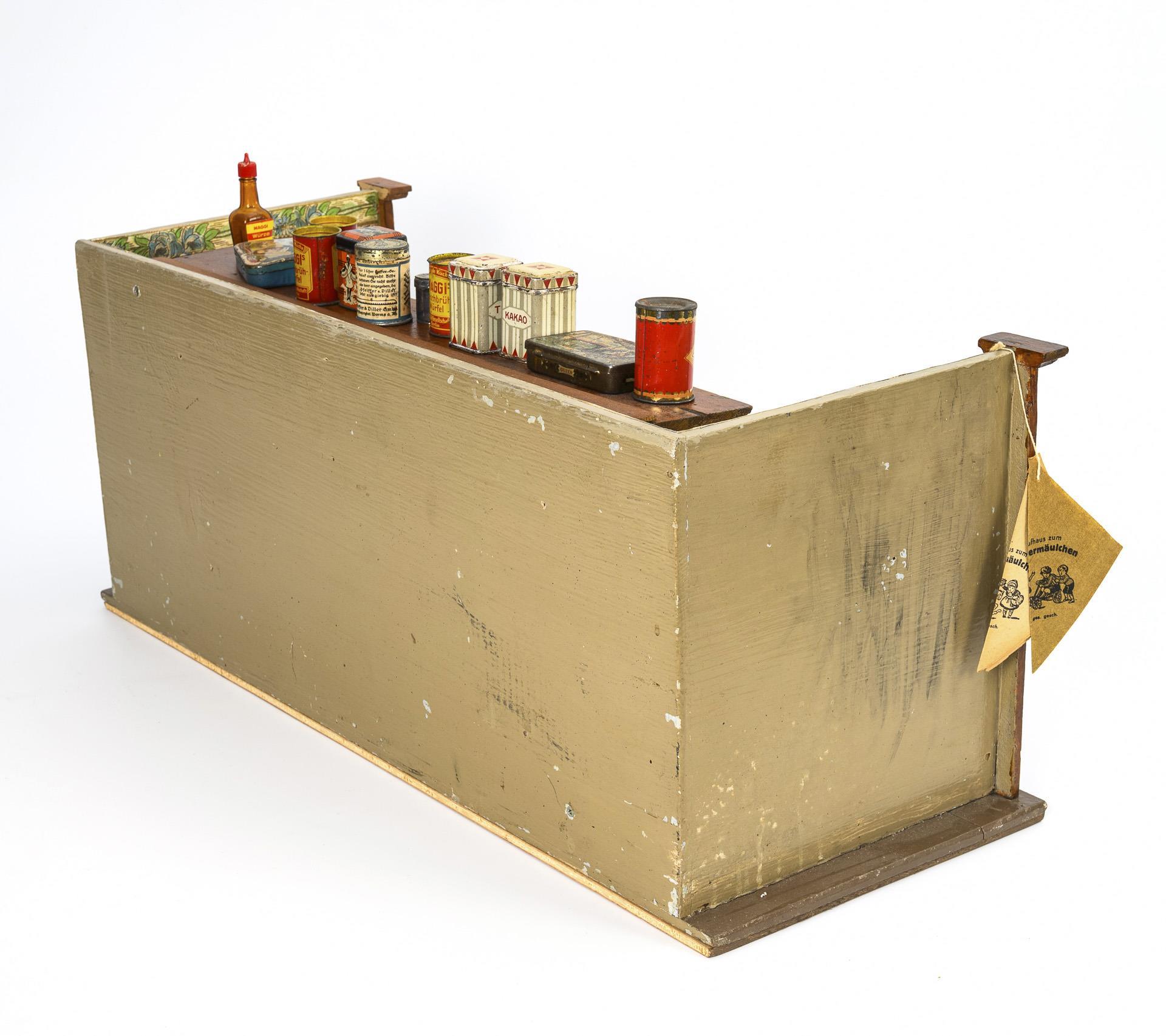 1-room cabinet with display shelf, loose counter, tin scales, tin cans and other accessories. Shelf with 12 green drawers and open section with mirrored back wall. 2 felt-clad bending dolls as woman and man, L 11/14 cm. Worn, with traces of age.