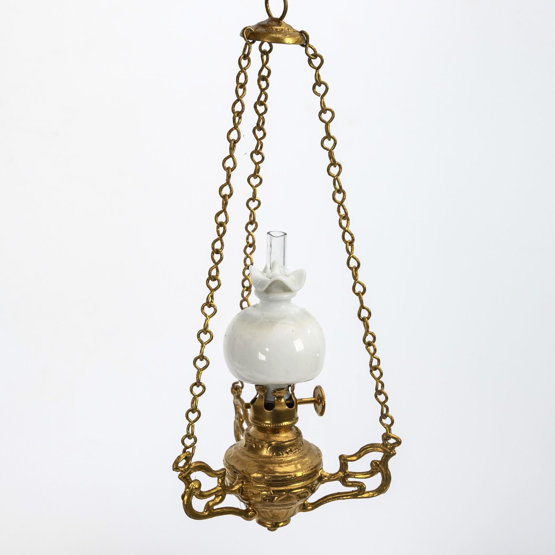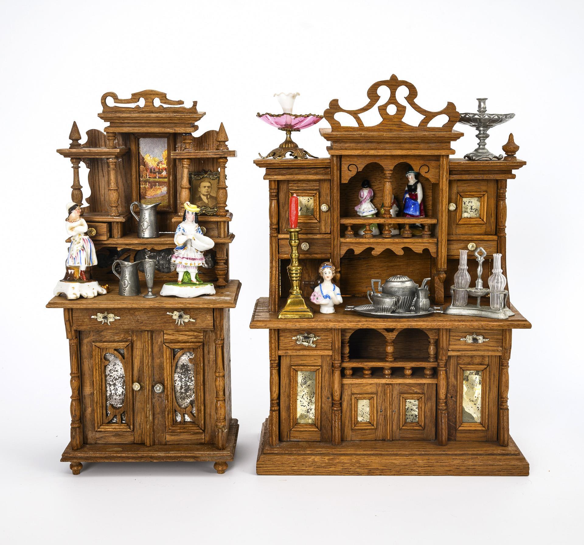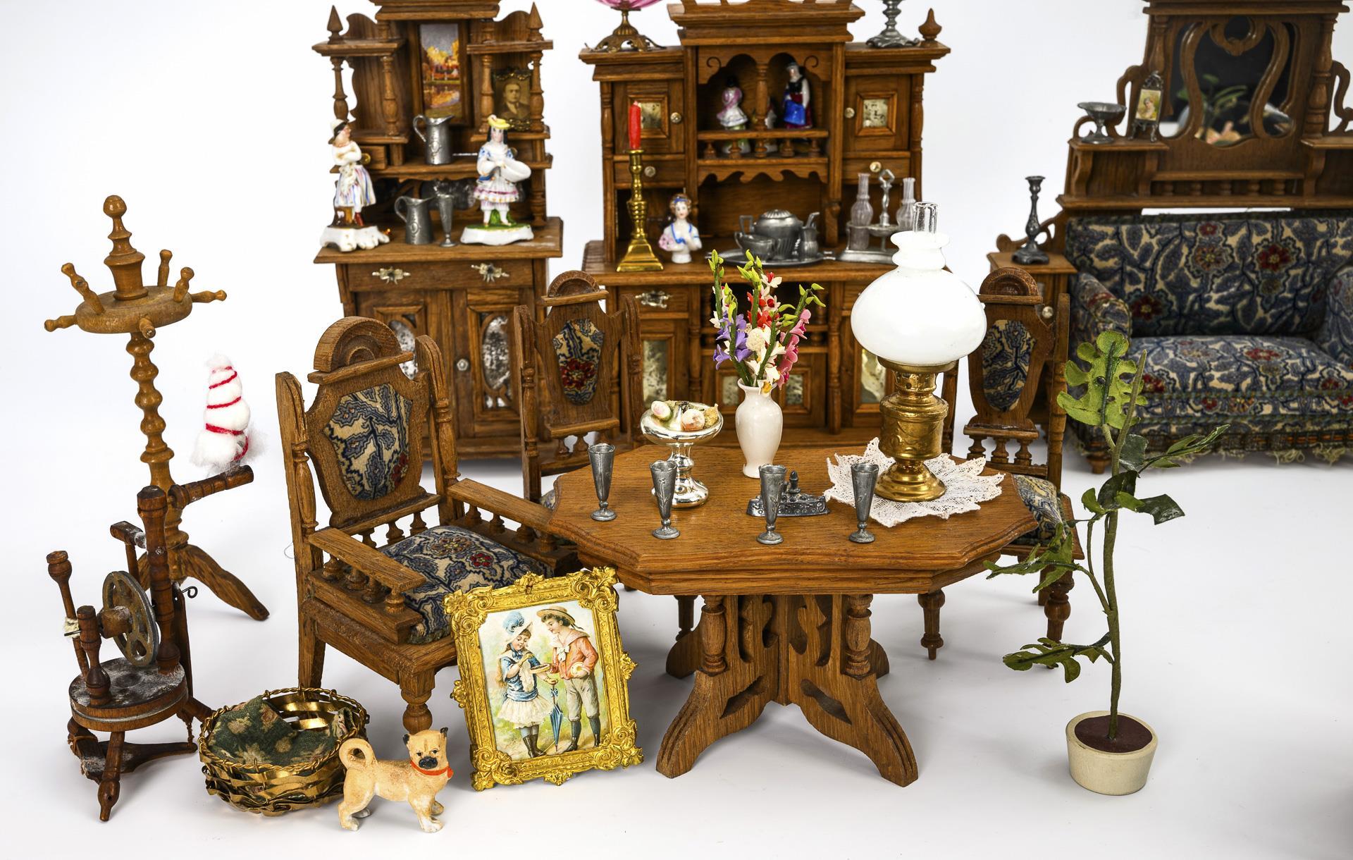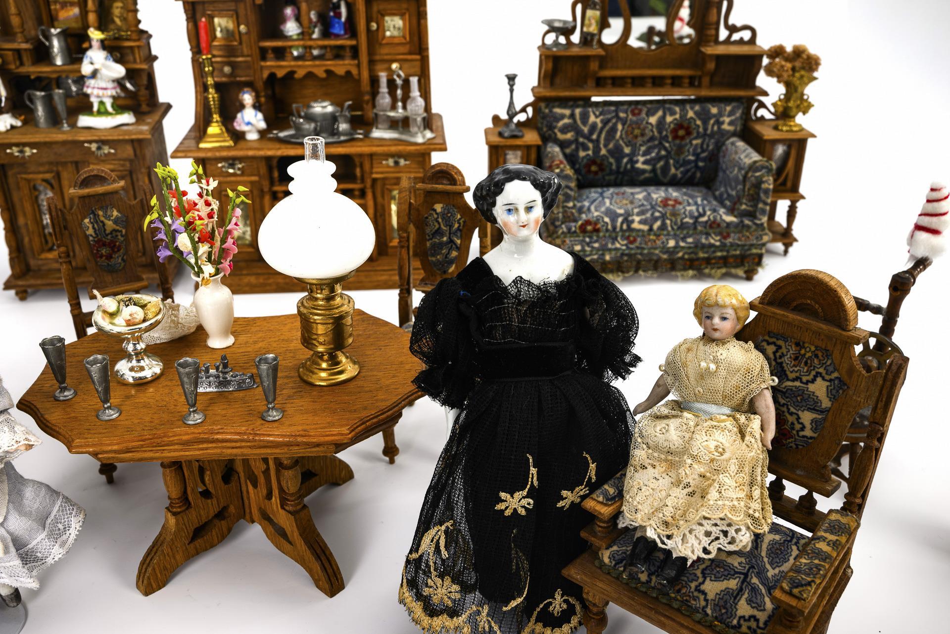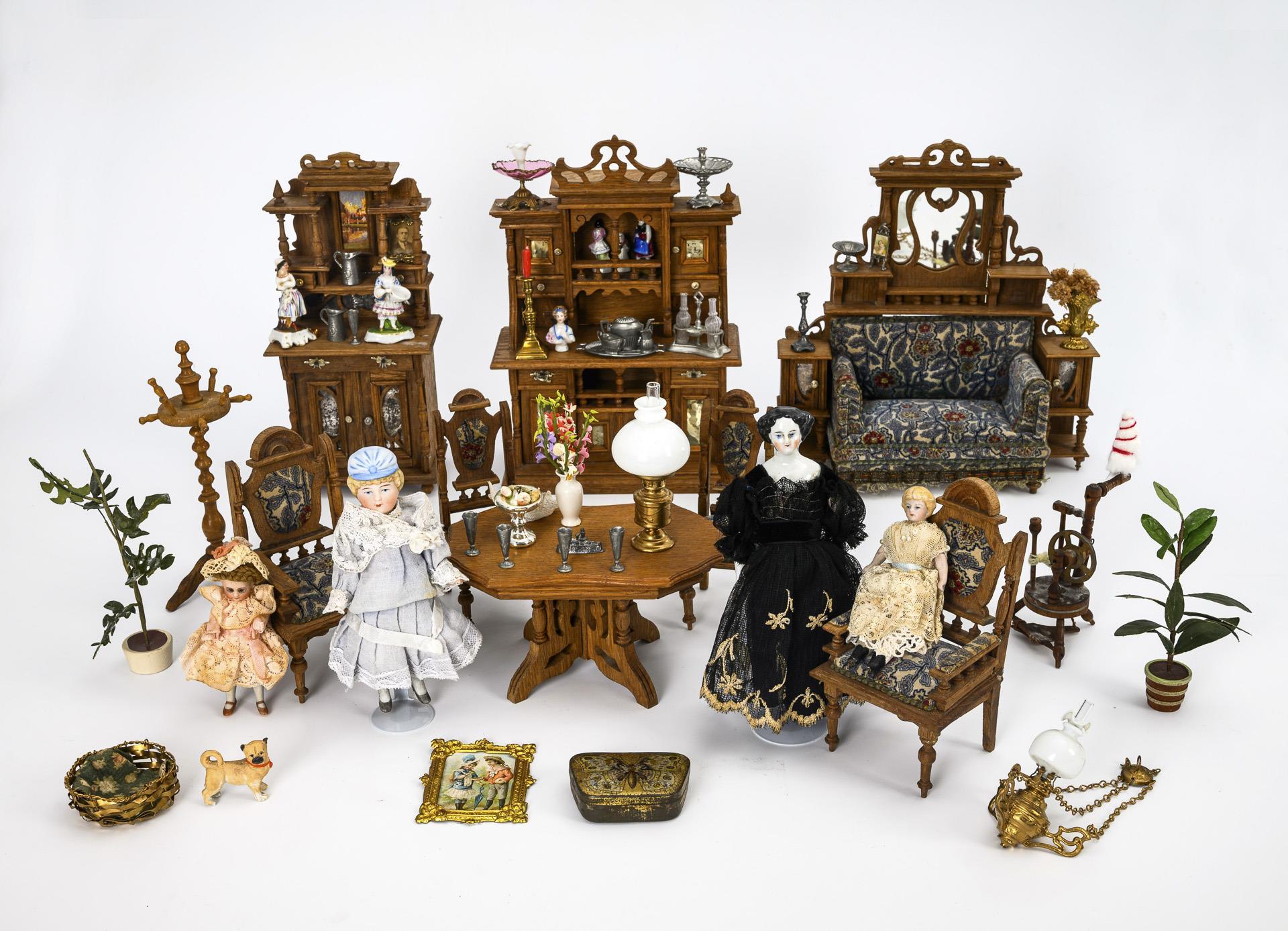 Great period living room furnishings with 9 pieces of furniture, numerous accessories, 2 kerosene lamps, 4 dolls and 1 bisque porcelain pug. With defects and areas of repair.