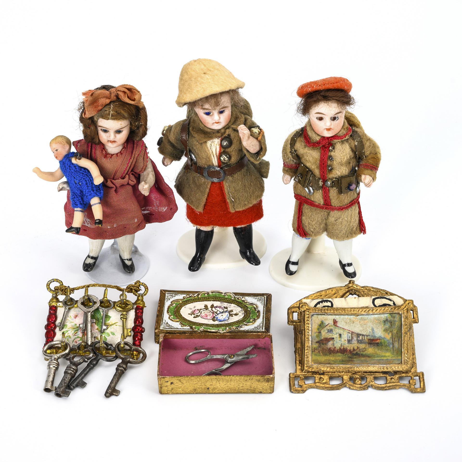 3 whole bisque dolls with fixed head, glass eyes, mohair hair, old clothes and painted shoes. L approx. 9 cm each. Comes with a 4.5 cm doll. Also key board with keys, cardboard box with scissors and brass wall holder.