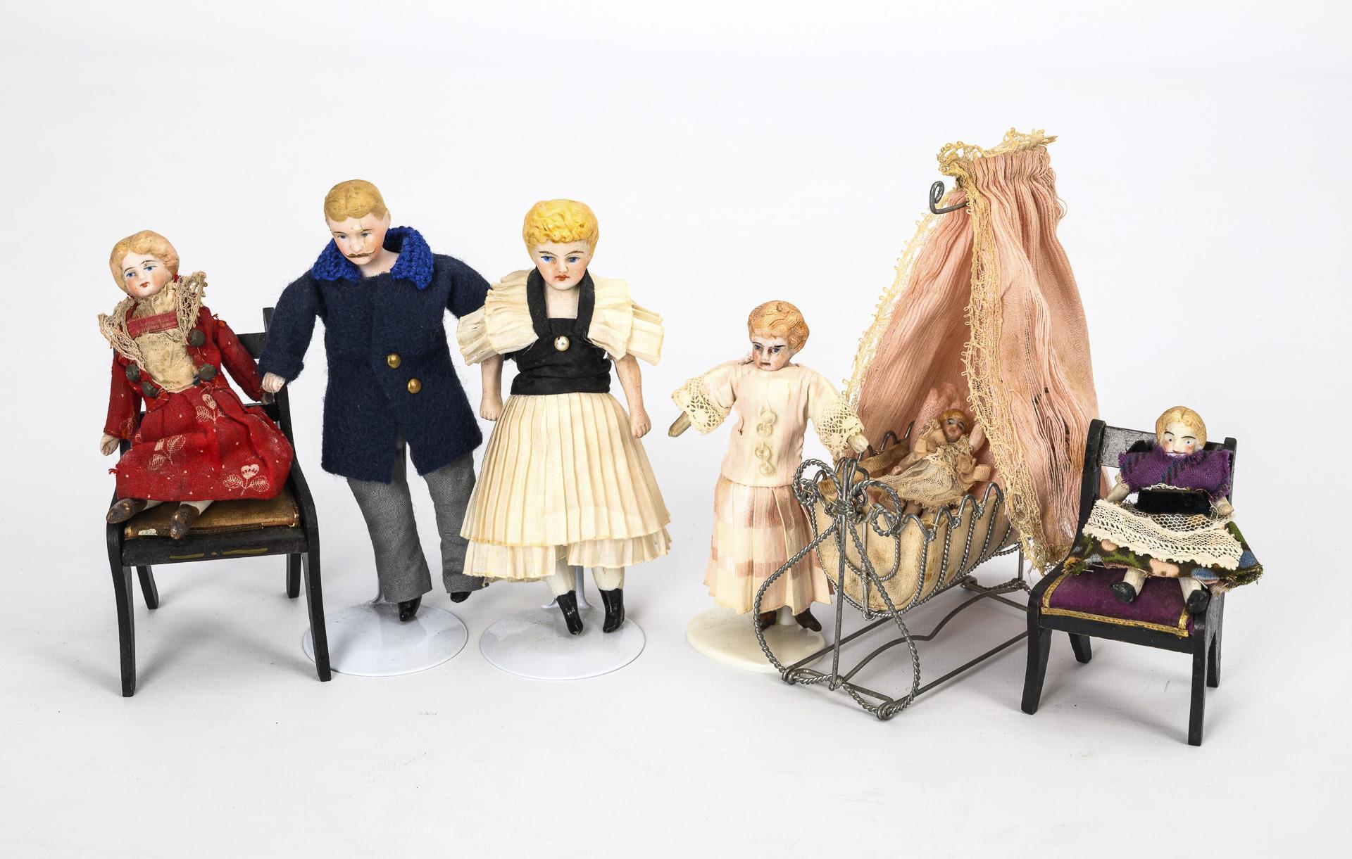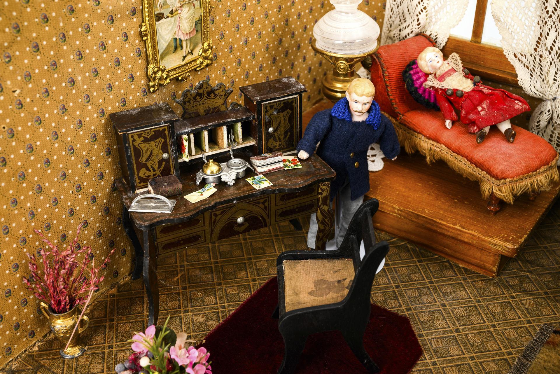 Simple 1-room cabinet with glazed window. Furnished with 5 gold stencilled furniture, chaise longue, fitted nesting table, marble table, 6 chairs and cradle. Plus 6 small plates, 5 gold plate frames and some accessories. Signs of age, minor defects.
