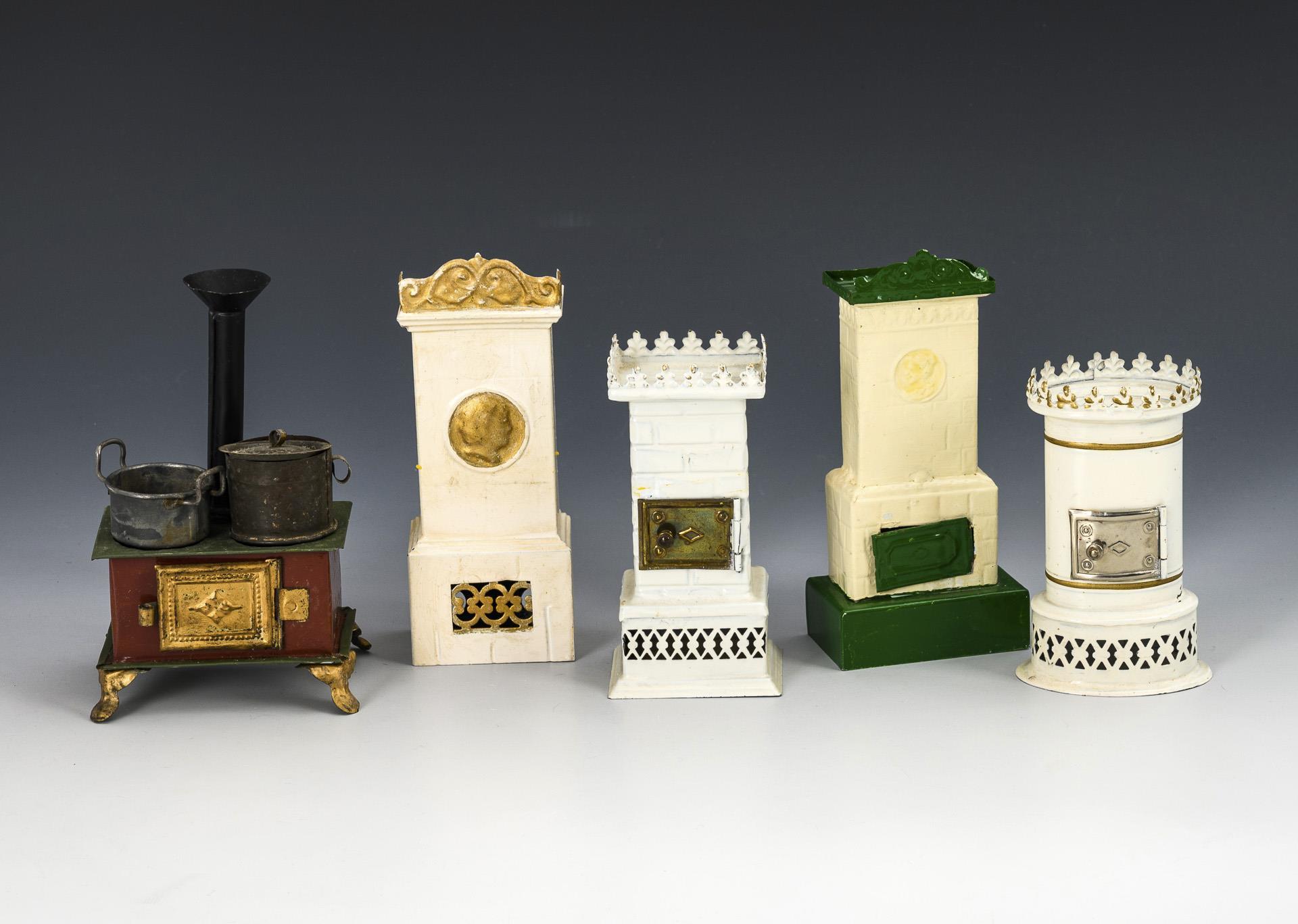 4 different, white painted tiles for the doll's house. Plus 1 small tin stove with chimney and 2 cooking stoves. Signs of age, partly repainted.