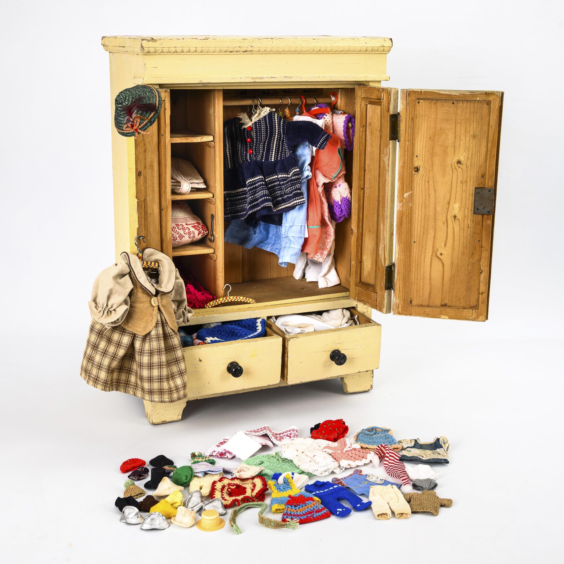 2-door wardrobe with oval mirror and 2 drawers. Inside 9 dresses on hangers as well as numerous items of clothing such as hats, stockings, underwear etc. Signs of age, dry tears, lock does not work.