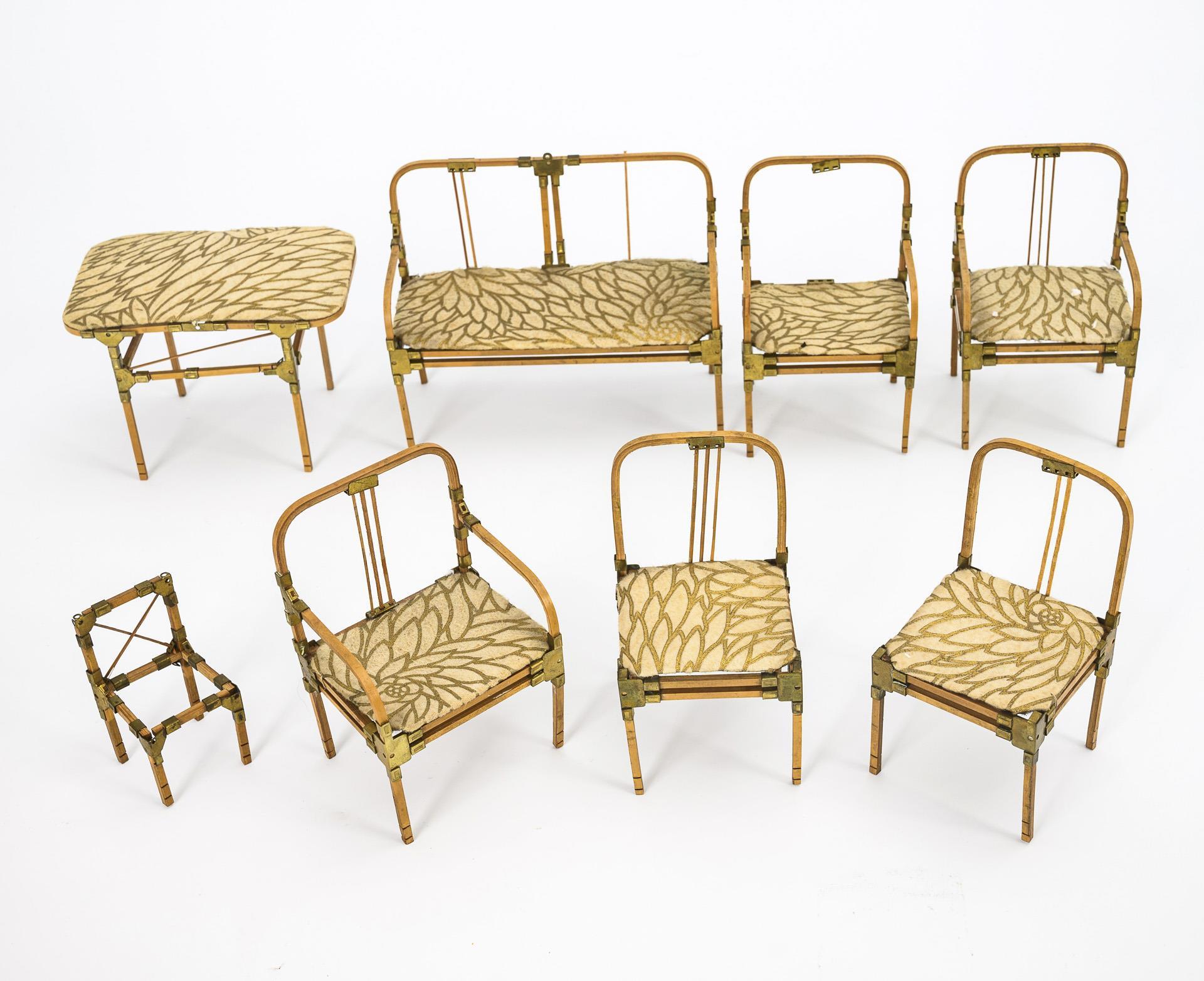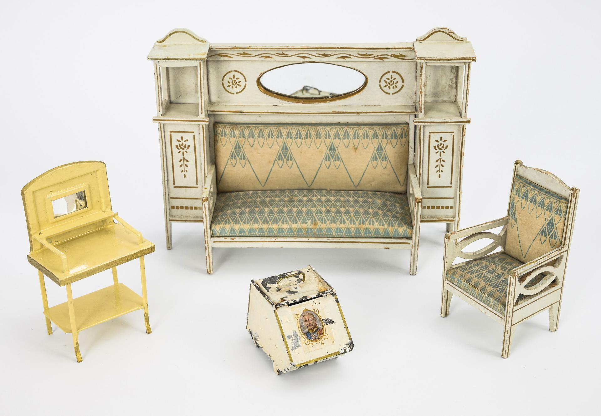 Decorative sofa with white-painted frame and oval mirror (17 x 23.5 x 7.5 cm), matching armchair / 8-piece suite with bench, table and chairs (H 7 - 11.5 cm). Includes washstand and coal box made of sheet metal. In an additional cardboard box "Qualitäts-Puppenmöbel", with glued lid.