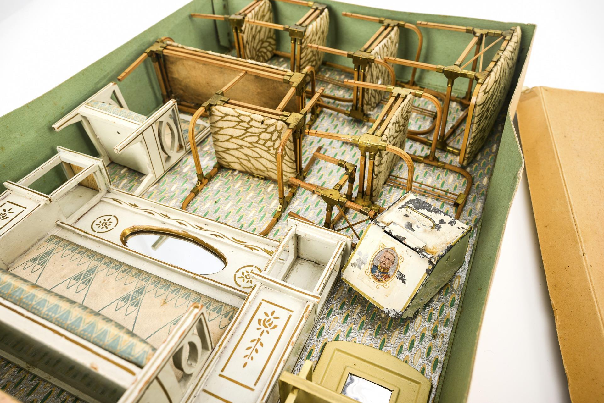 Decorative sofa with white-painted frame and oval mirror (17 x 23.5 x 7.5 cm), matching armchair / 8-piece suite with bench, table and chairs (H 7 - 11.5 cm). Includes washstand and coal box made of sheet metal. In an additional cardboard box "Qualitäts-Puppenmöbel", with glued lid.