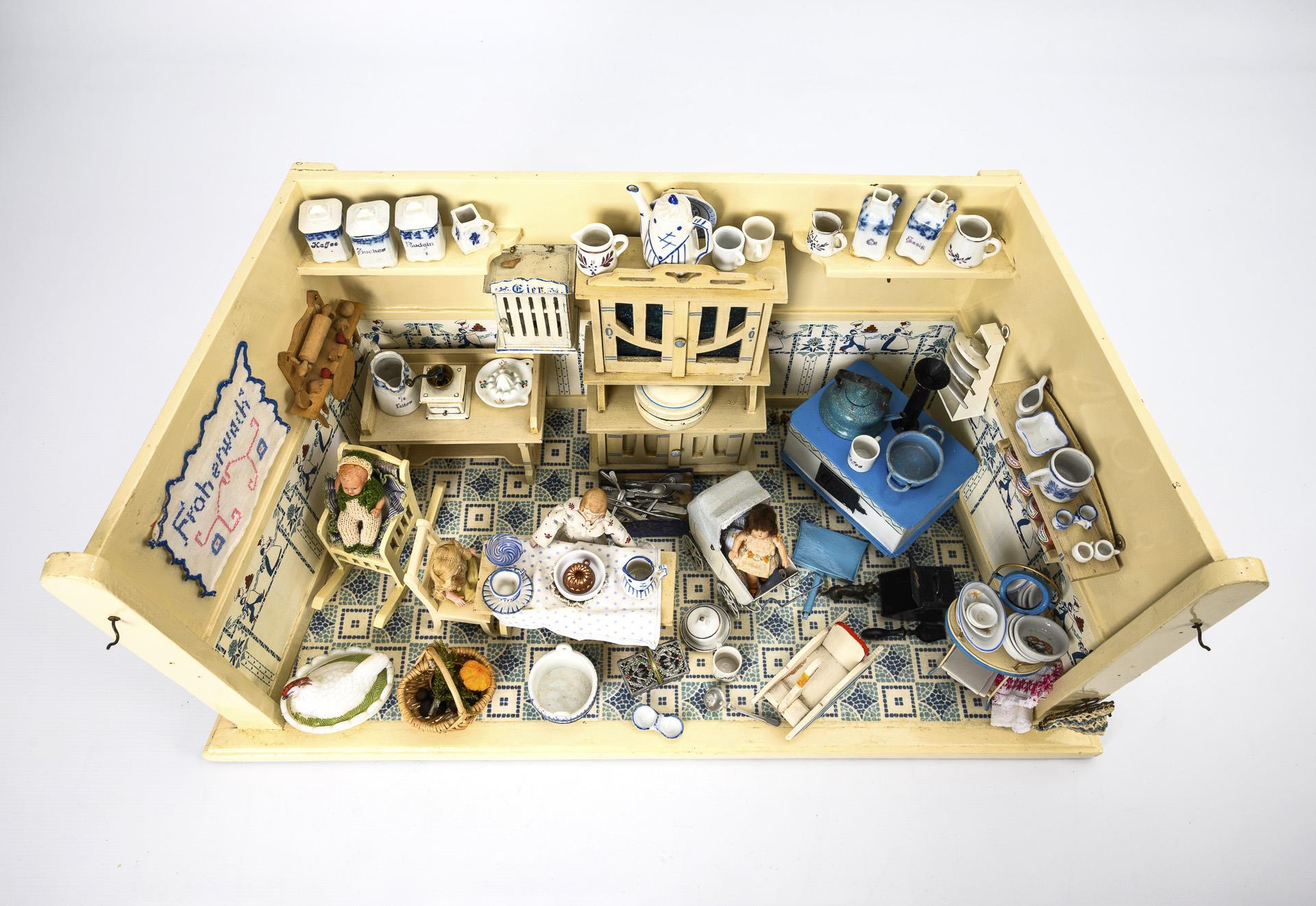 Trapezoidal one-room house with blue and white furnishings, including tin stove, kitchen buffet, sideboard, tin egg cupboard, rocking chair and children's rocker. Richly equipped with various accessories, plus 4 small pots. Few signs of age and minor defects.