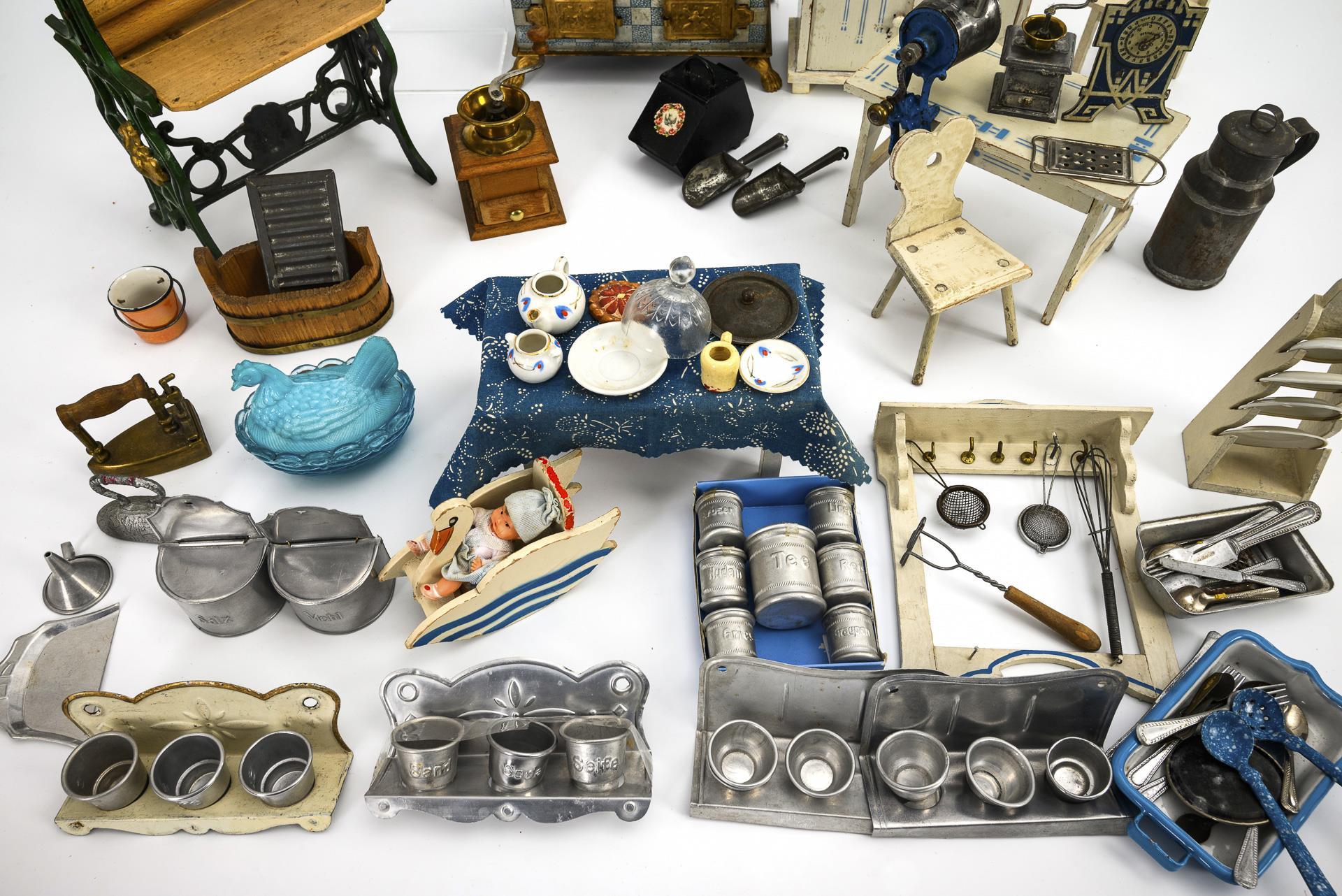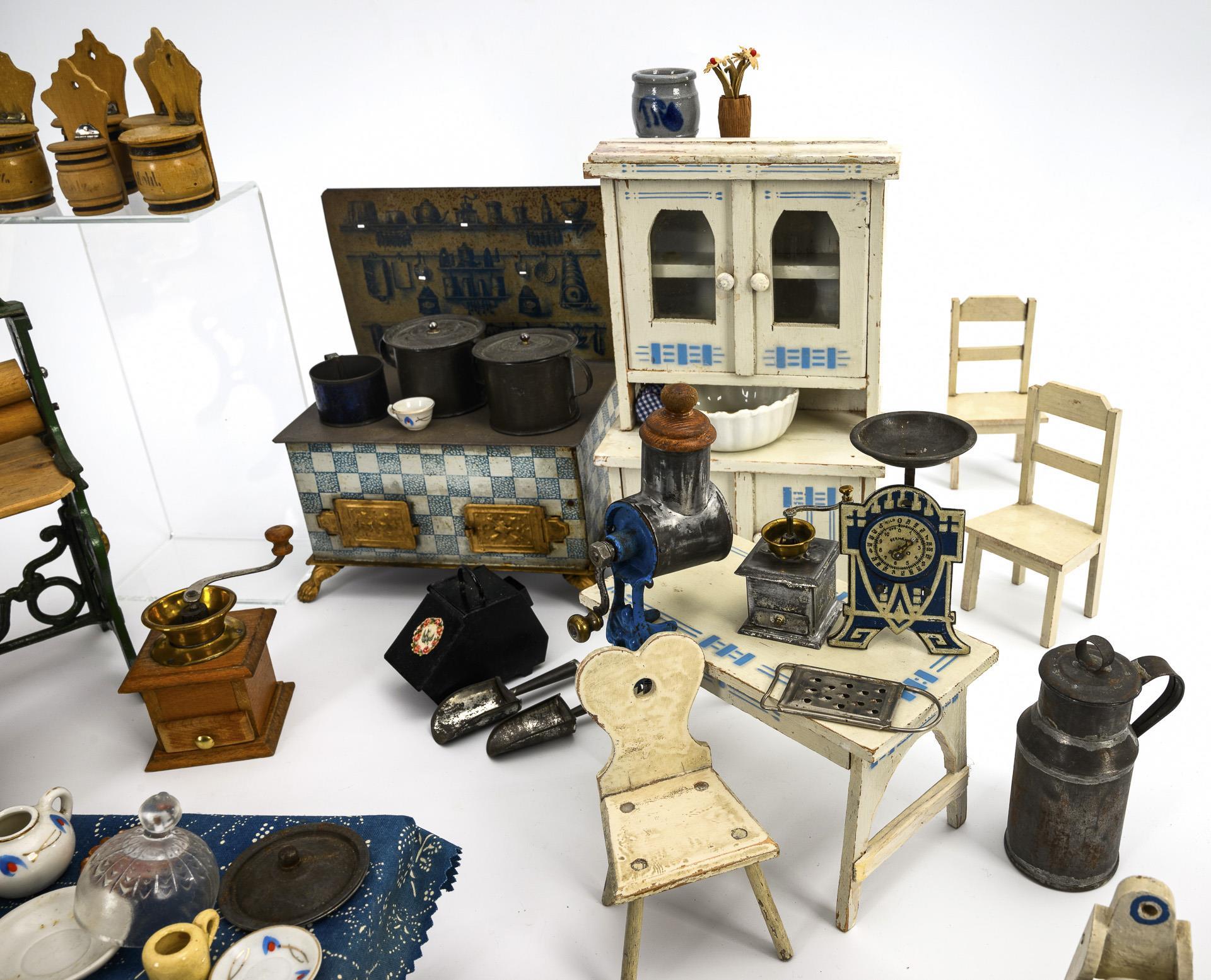 9 pieces of white-painted kitchen furniture, some with blue spray decoration, blue and white lithographed tin stove, English mangle "The Lion Mangle" with green-painted cast iron frame. Plus accessories made of sheet metal, wood, glass etc. Signs of age, minor defects.