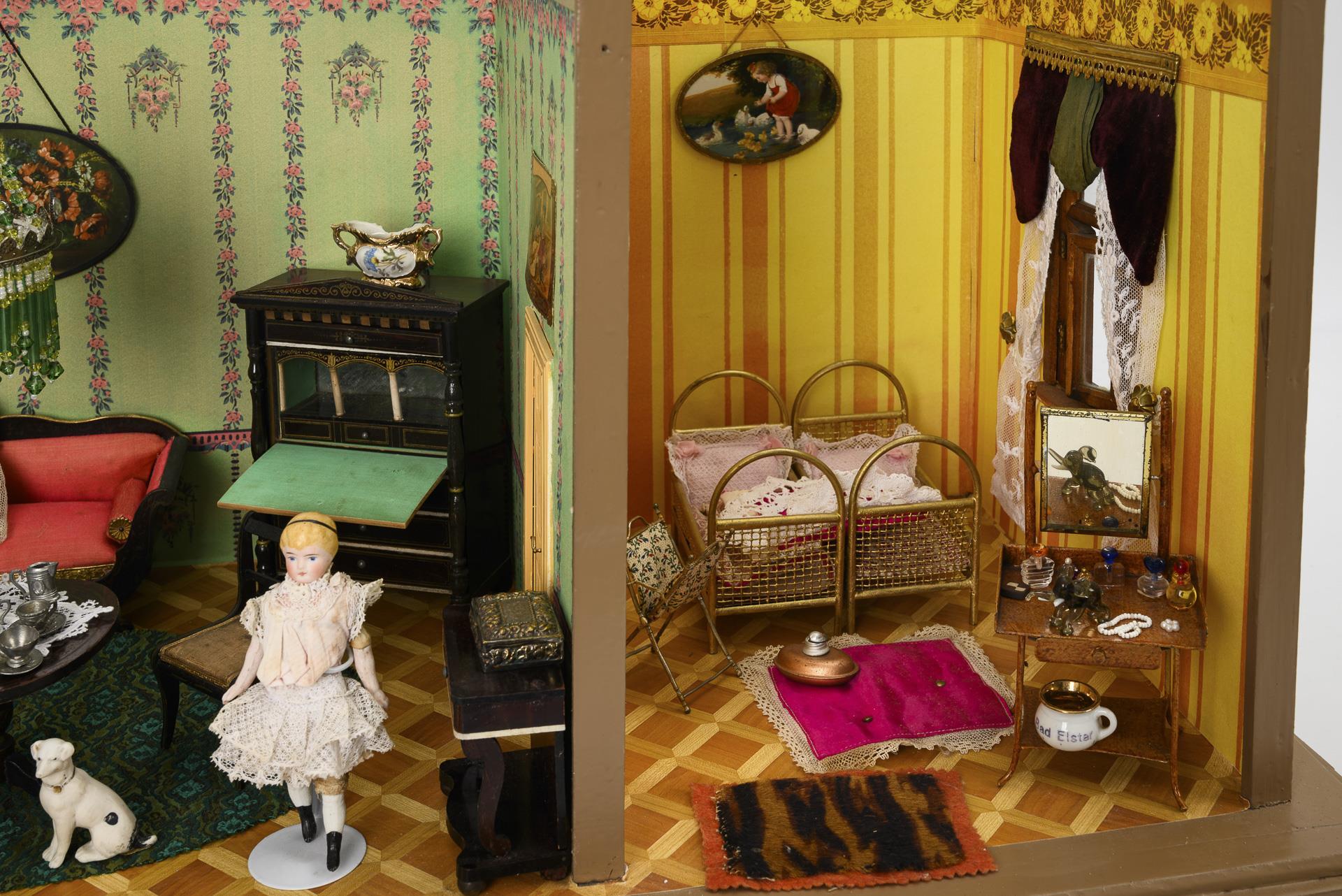 2-room housing with 3 windows, curtains, movable intermediate door and loosely set pedestal in the bay window. Living room furnished with chandelier, dark furniture, including beautiful Boulle-style secretary and tiger skin carpet. Bedroom with tin dressing table and 2 golden wire beds. With 3 dolls. Worn, signs of age, small defects.