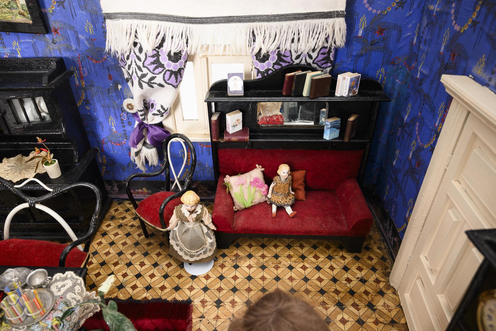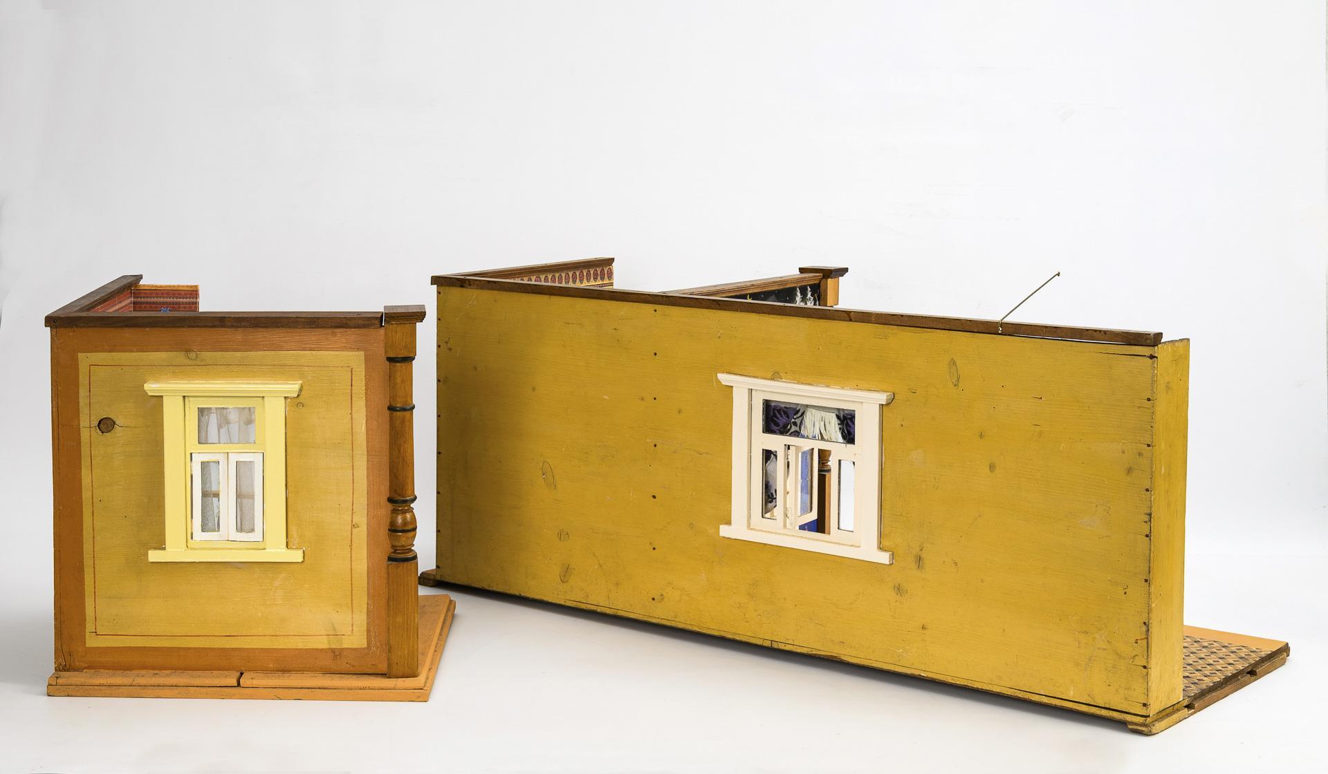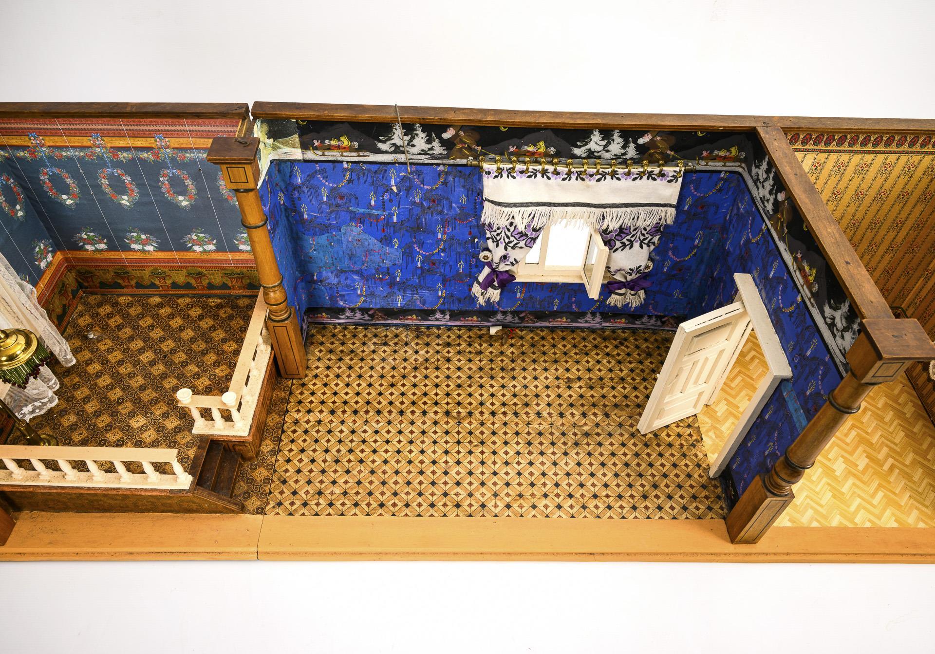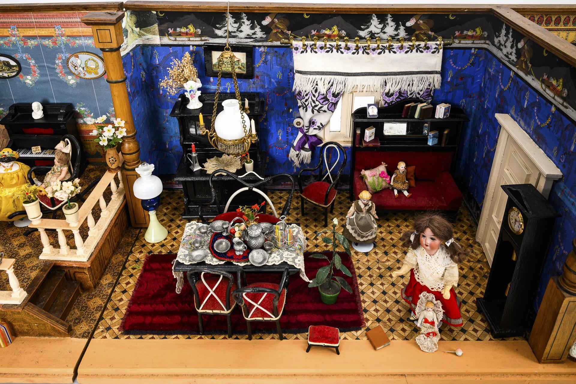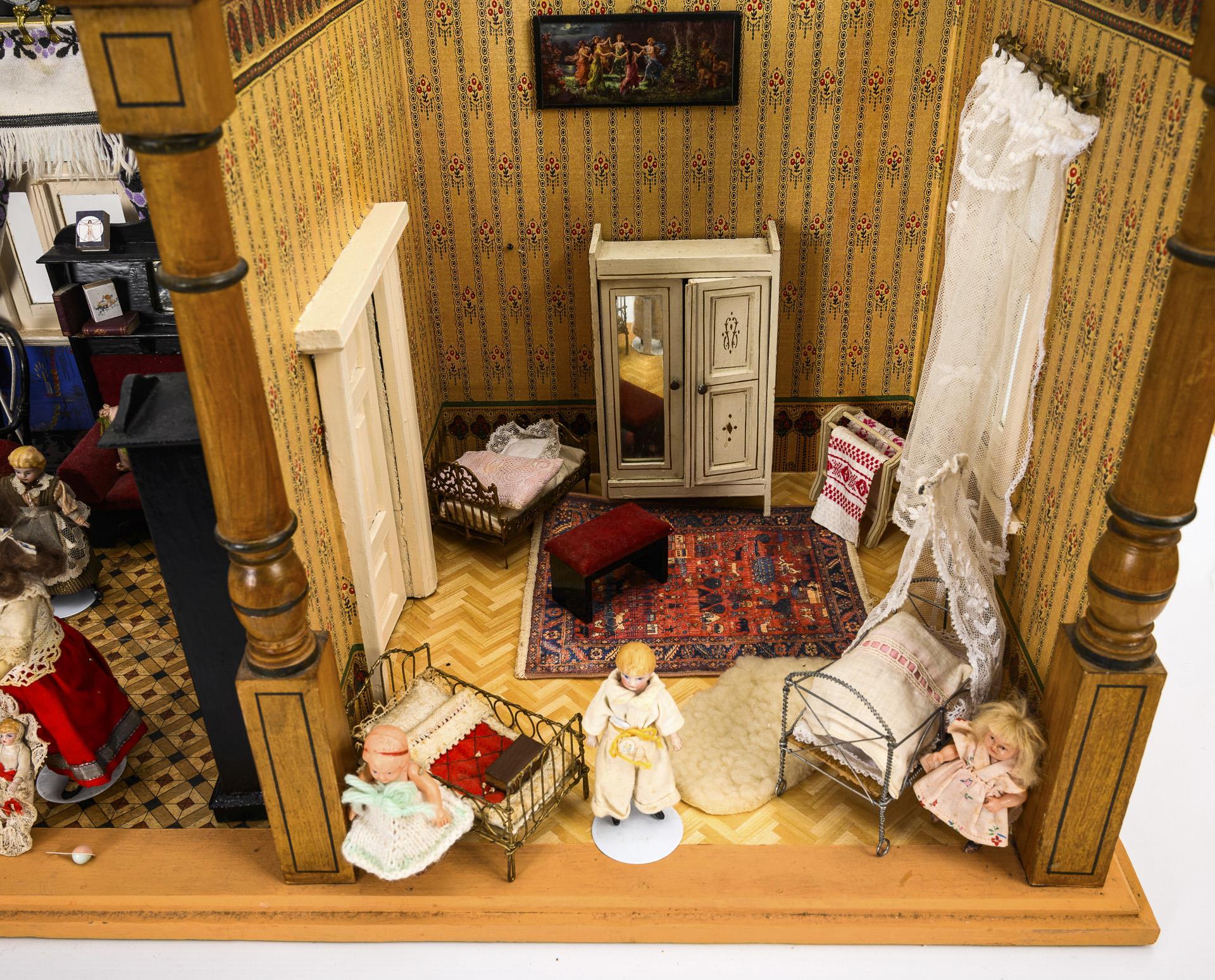 Exceptionally large doll's house with removable platform element, 3 glazed windows, curtains and lamps. Parlor furnished with dark period furniture, grandfather clock and piano. Bedroom with white wardrobe and 3 metal beds. With rich accessories and 9 small pots. Some signs of age and small defects.