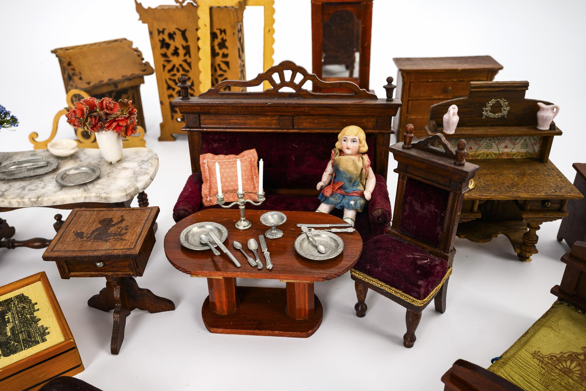 Various living room furniture, including Wilhelminian style furniture, burgundy upholstered sofa, matching chairs, marble table. Various gray glazed Art Nouveau bedroom furniture. Plus 3 all-bisque and 1 celluloid dolls as well as some parts accessories. Signs of age, small defects, areas of repair.