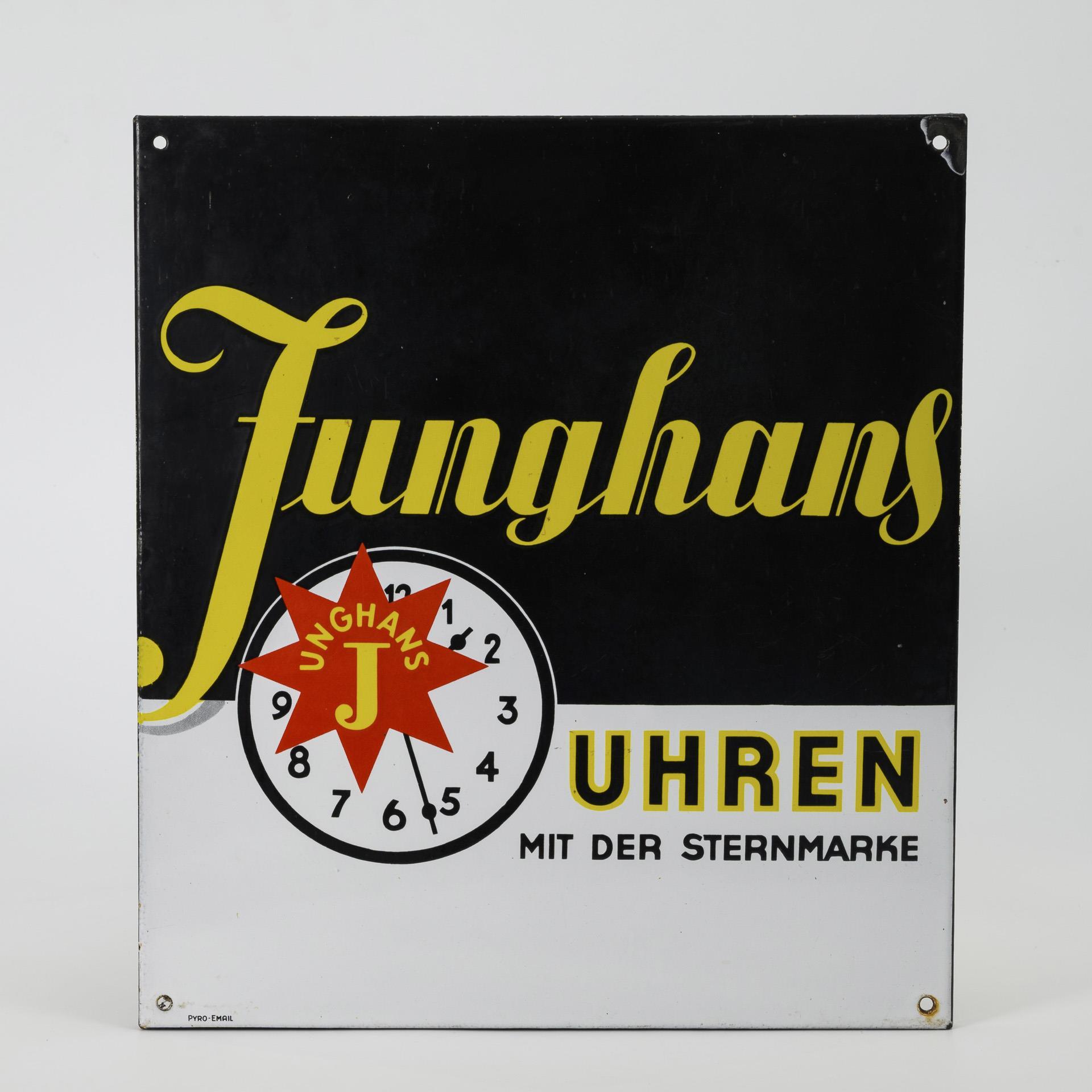 Rectangular advertising sign: "Junghans Uhren mit der Sternmarke". Enamel chipping on one corner, otherwise hardly any signs of age/use.