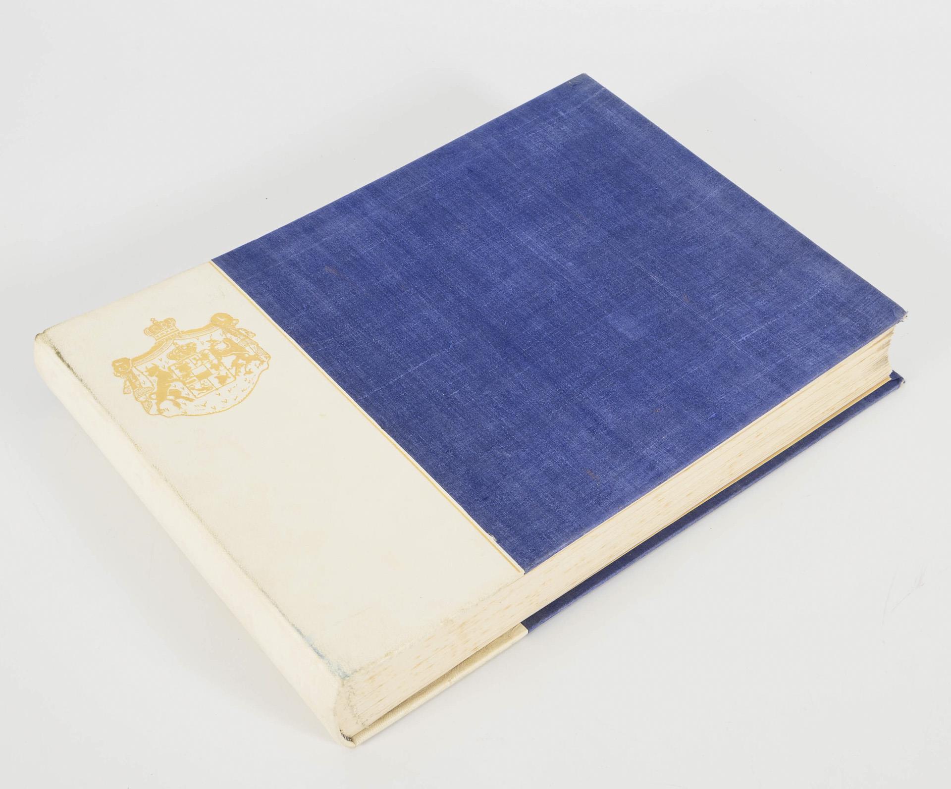 Illustrated book in white half leather with gold embossed coat of arms. Slight signs of wear, cut slightly foxed.