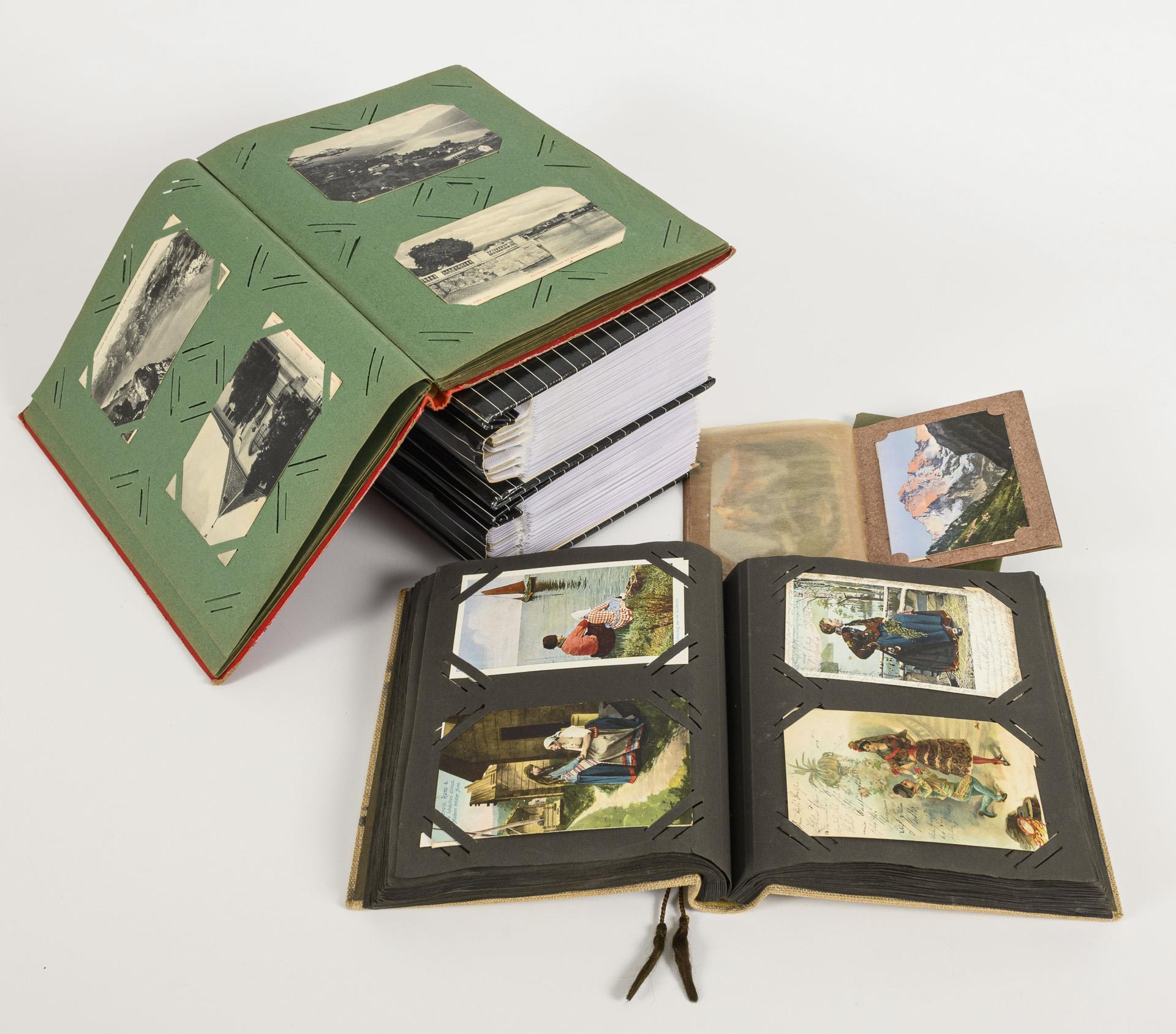 Approx. 360 postcards, West Germany, Baden-Württemberg and Bavaria, including lithographs and "Greetings from ..." / Approx. 372 postcards from Germany, partly lithographs. Both in recent striped albums. (34 x 19 cm). / Postcard album Trachten: Approx. 100 postcards with traditional costumes, very nice, collected album, circa 1900/1920. light linen binding, (25 x 22 cm) / 3 postcard albums Switzerland with approx.120 postcards. Around 1900. 70 black and white postcards in red album with violets, signs of use. (34 x 23 cm). / 2 identical greenish brochure albums with gold print "Photochromie, Nenke & Ostermaier Dresden, Vertreter Burchard Zürich" with inserted colored cards, (16 x 12 cm).