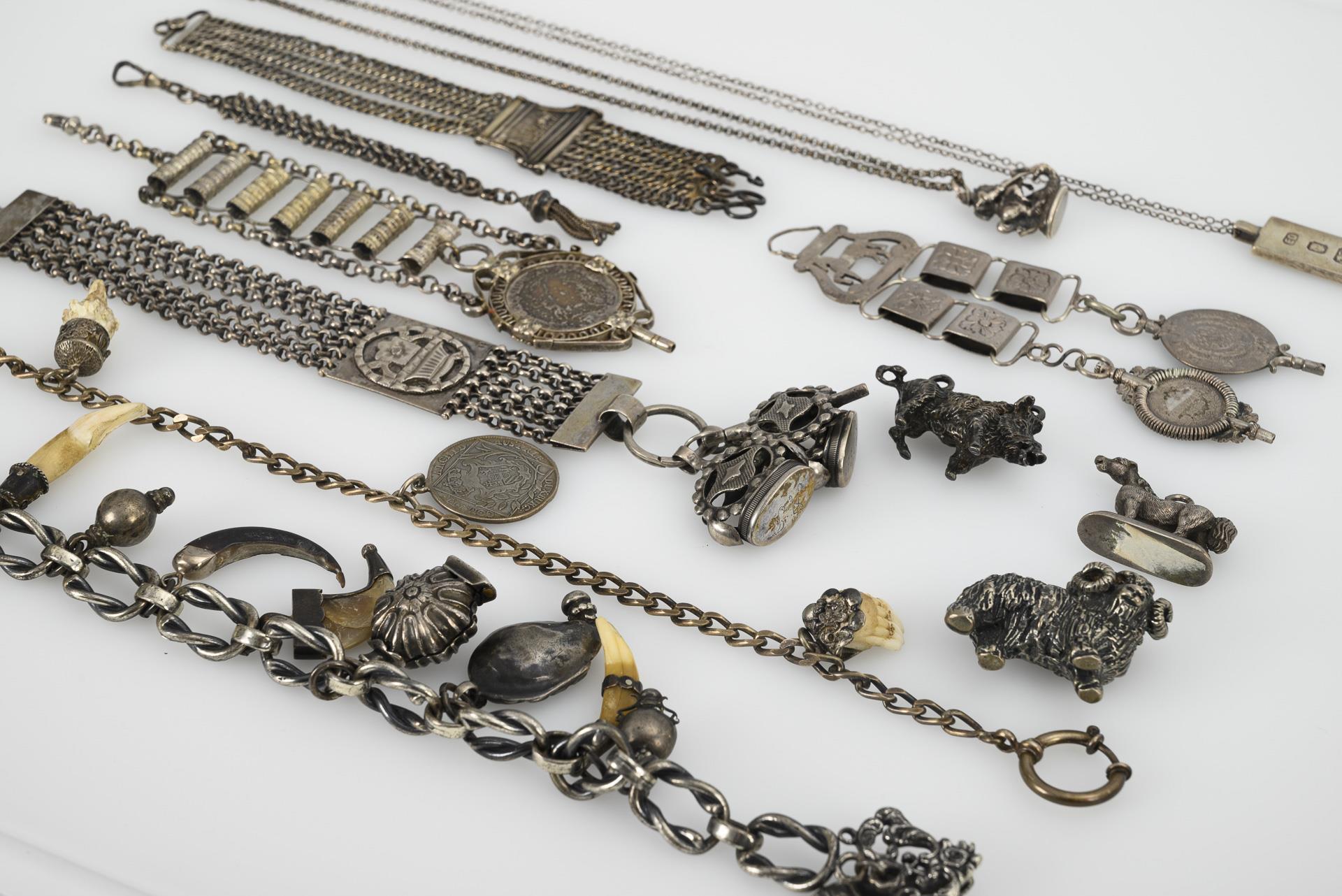 12 parts. 5 châtelaines partly with silver coins, 2 charivari with teeth, horns and claws, 3 animal pendants for charivari, 1 pea chain with rider, 1 chain with hallmarked silver plaque.