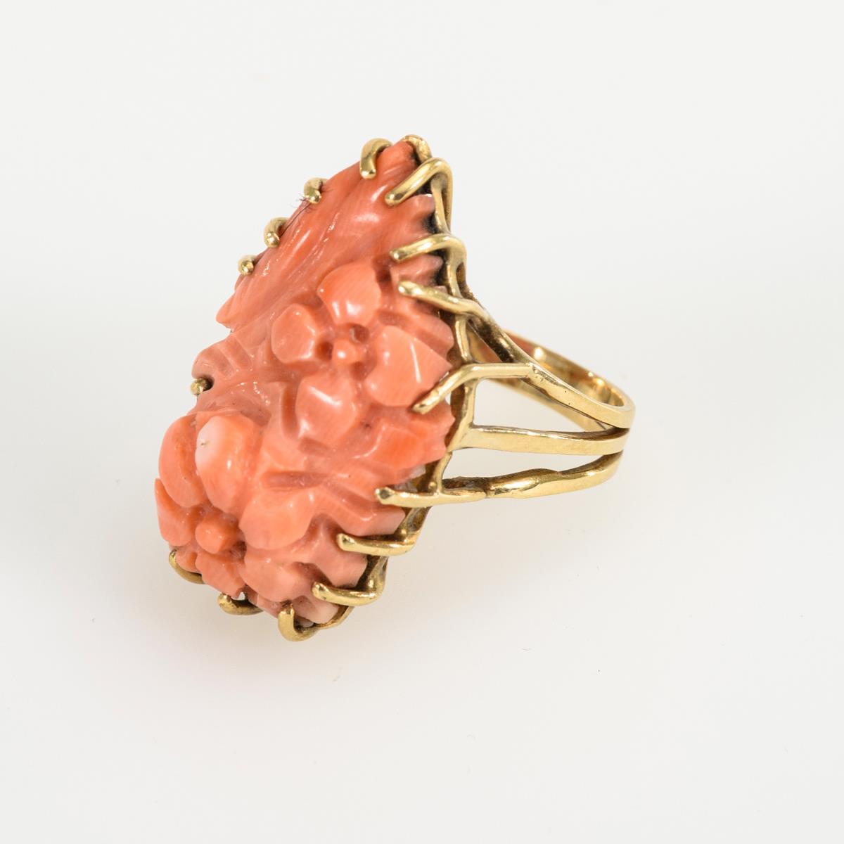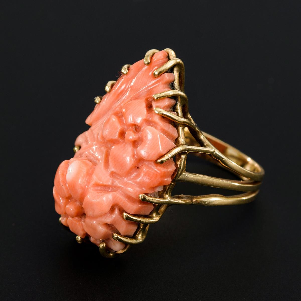 Lachsfarbene, geschnittene Korallenblüten in Krappenfassung. Mittlere Schiene..