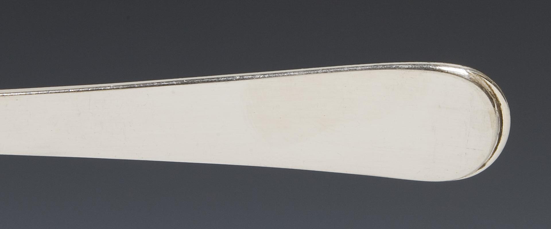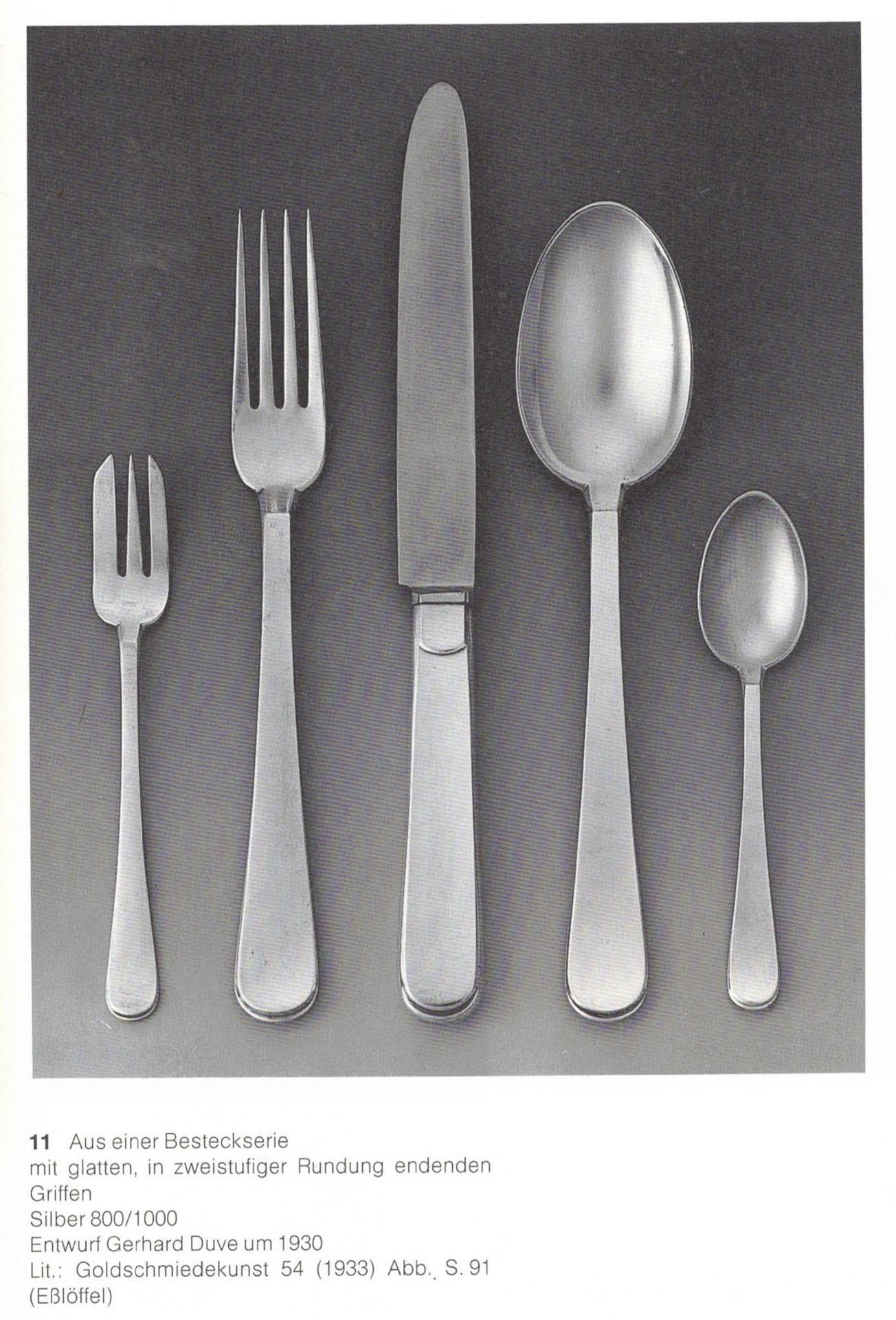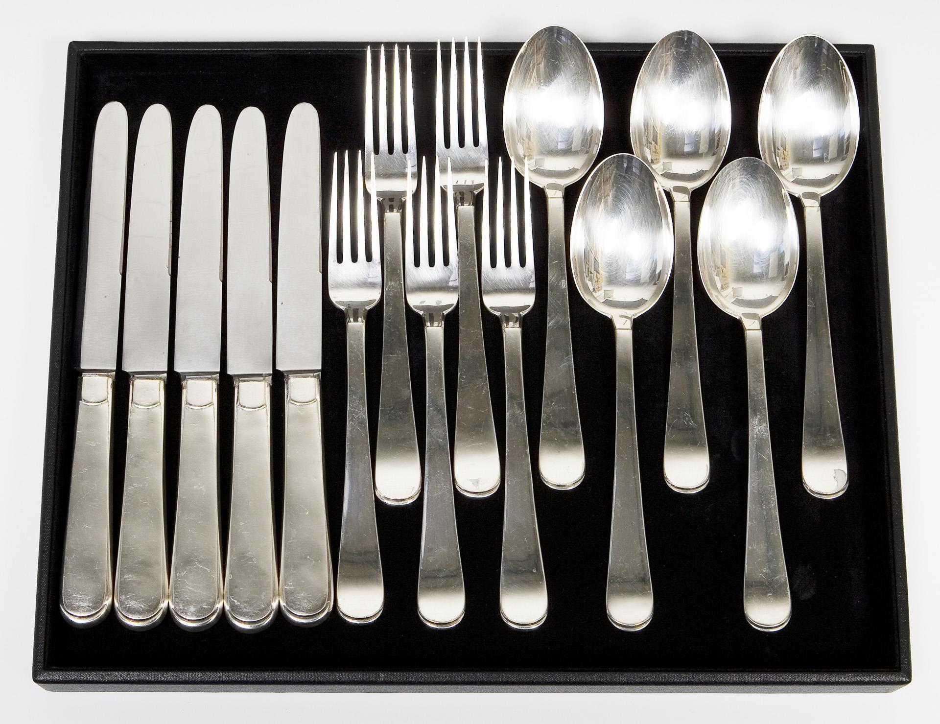 Model by Gerhard Duve (1899-1977), circa 1930. 15 pieces: 5 knives, 5 forks, 5 tablespoons. Timeless smooth shape with two-step rounding at the end, knives with stainless steel blades. Hallmarks: Crescent and crown, fineness, factory mark.