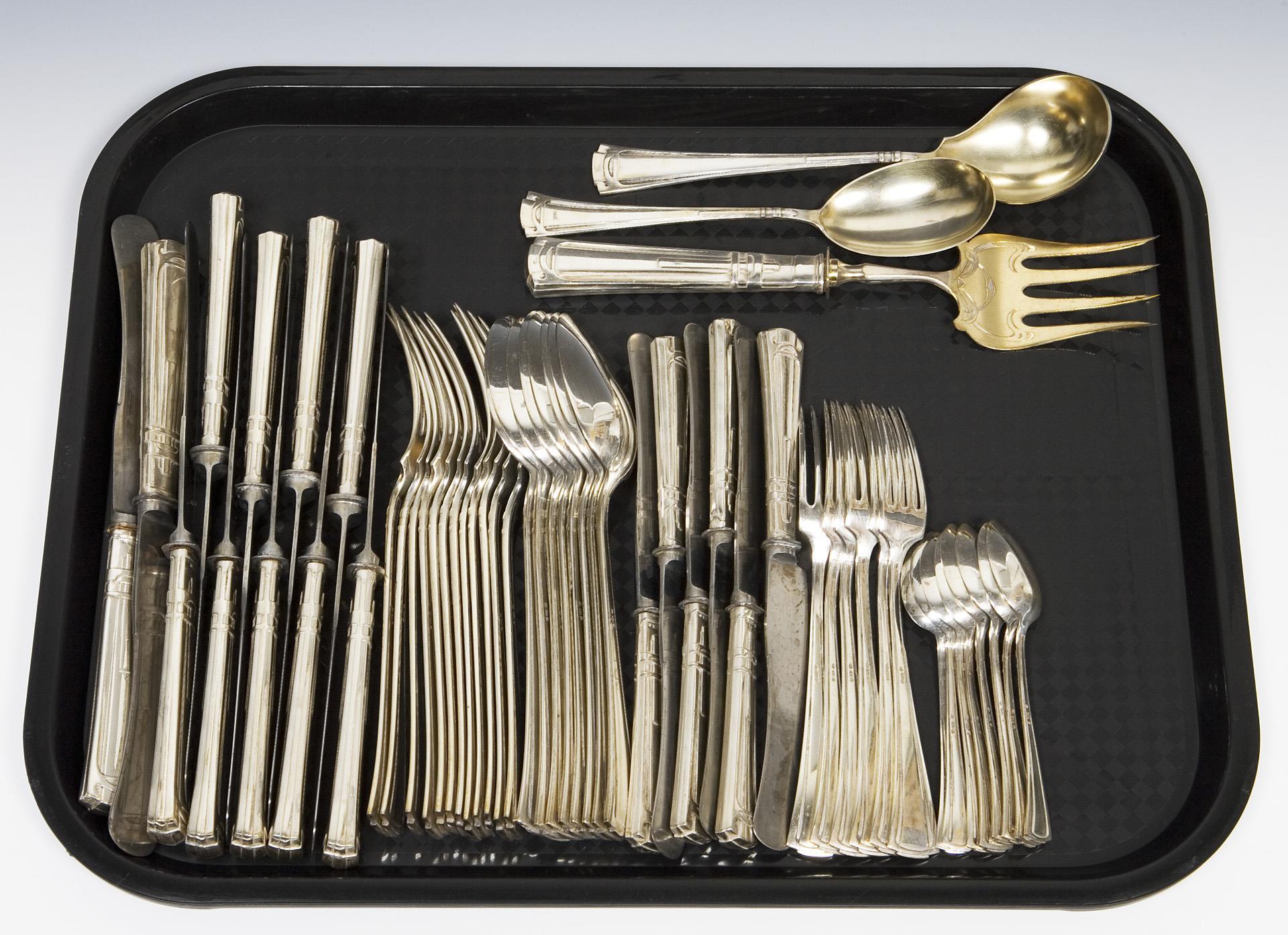 54 pieces: 11 knives, 12 forks, 8 tablespoons, 8 coffee spoons, 6 dinner knives, 6 dinner forks, 1 ladle, 1 serving spoon, 1 serving fish fork. Geometric relief, knives with steel blades. Hallmarks: Crescent and crown, fineness, factory mark. Steel blades with marks.