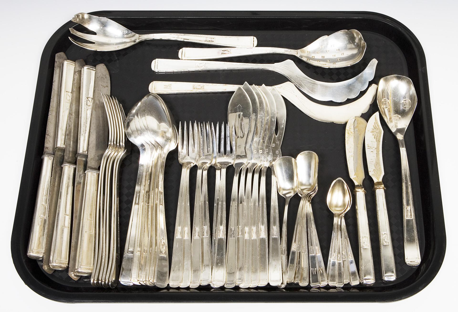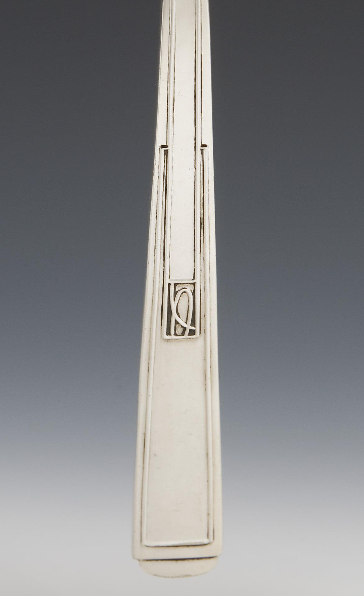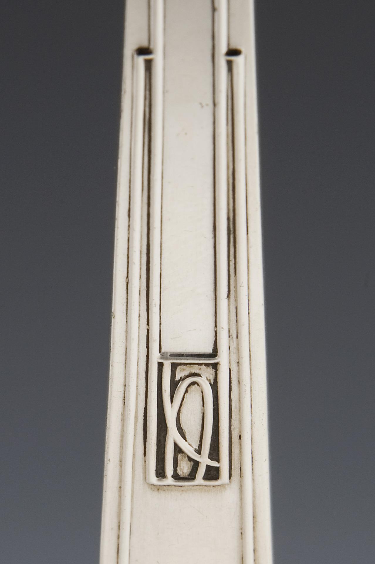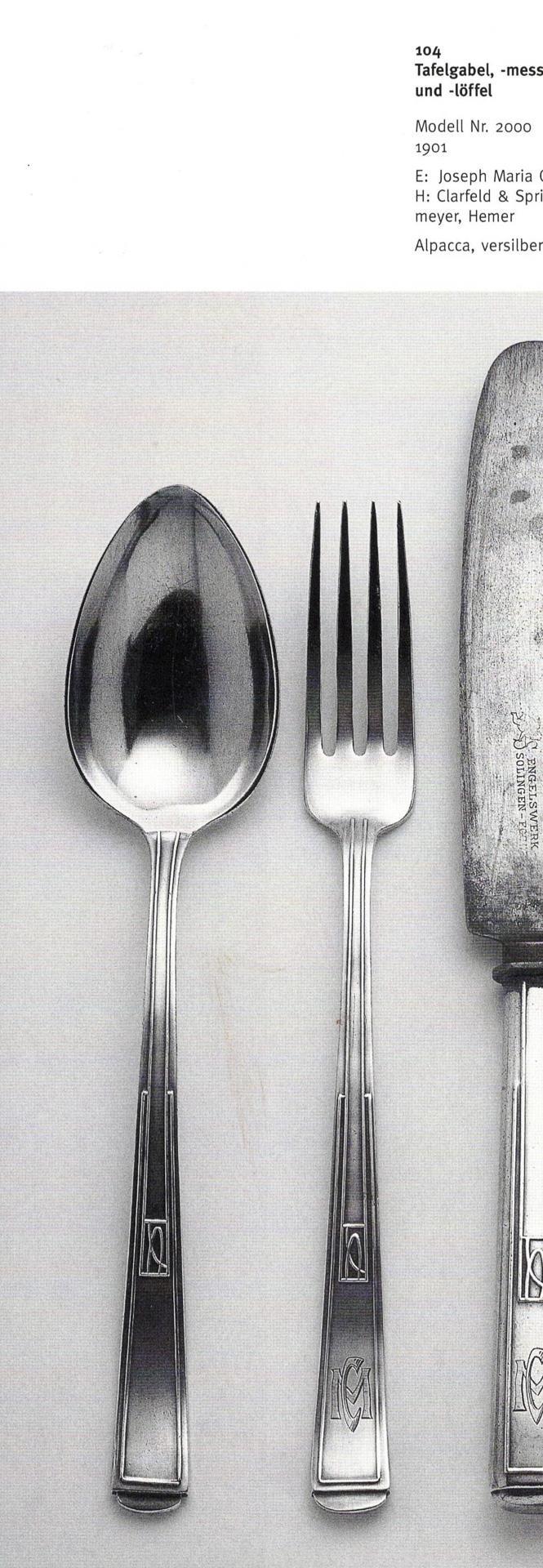 Other manufacturers: 11 x C. B. Schröder, Düsseldorf, 1 x Ludwig Ziech, Hamburg, 2 x A. Buse & Söhne, Zwickau. Model by Joseph Maria Olbrich, model year: 1901. 48 pieces: 5 knives, 6 forks, 6 tablespoons, 6 fish forks, 6 fish knives, 6 ice cream spoons, 2 ice cream servers, 6 mocha spoons, 2-piece salad servers, 1 serving spoon, 1 butter knife, 1 cheese knife. Tapered profiled handles with ligatured artist's monogram JO in a rectangle, original steel blades. Partially engraved monograms: 3 x on the back GM, 12 x on the front A, 7 x on the front W. Hallmarks: Factory marks, fineness mark. 17 pieces without hallmarks.