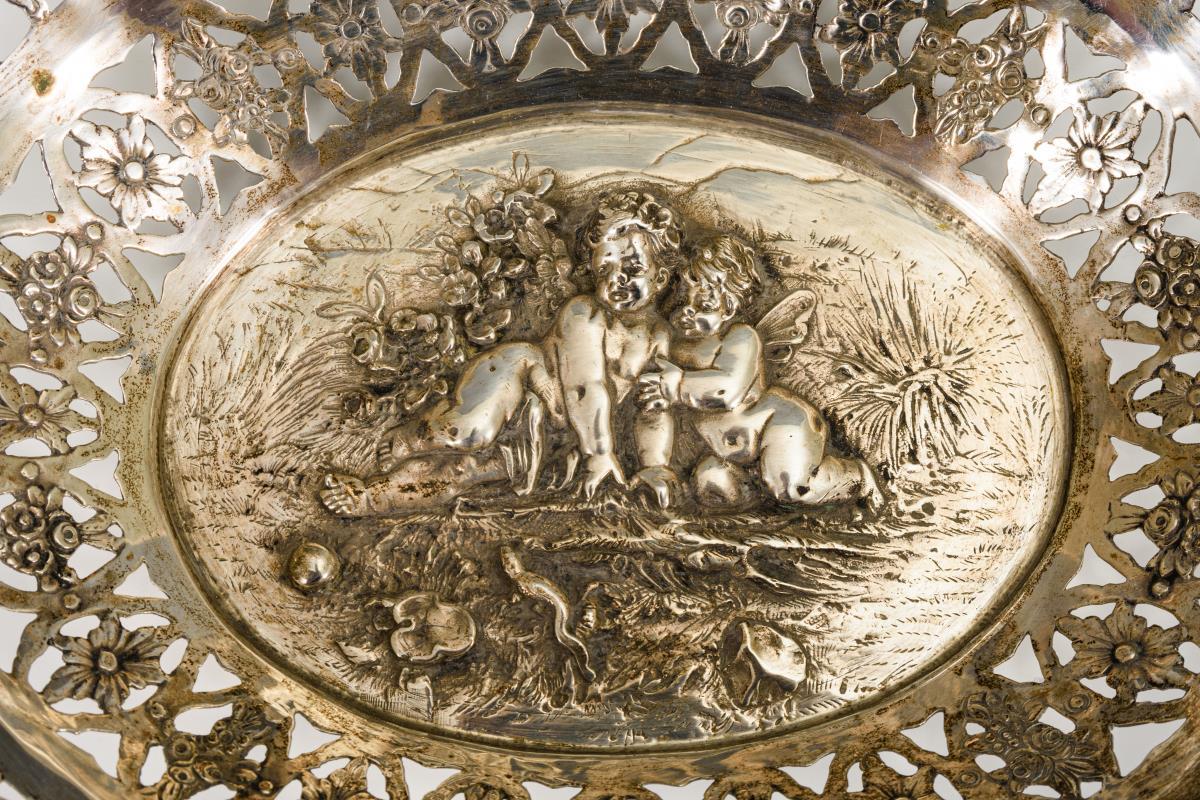 A 835 im Oval gepunzt. 1. H. 20. Jh. Deutschland. Silber. 6,5 x 29,5 x 22,5 cm. 370 g. Reliefiert, mit Putten und Blütengirlanden..