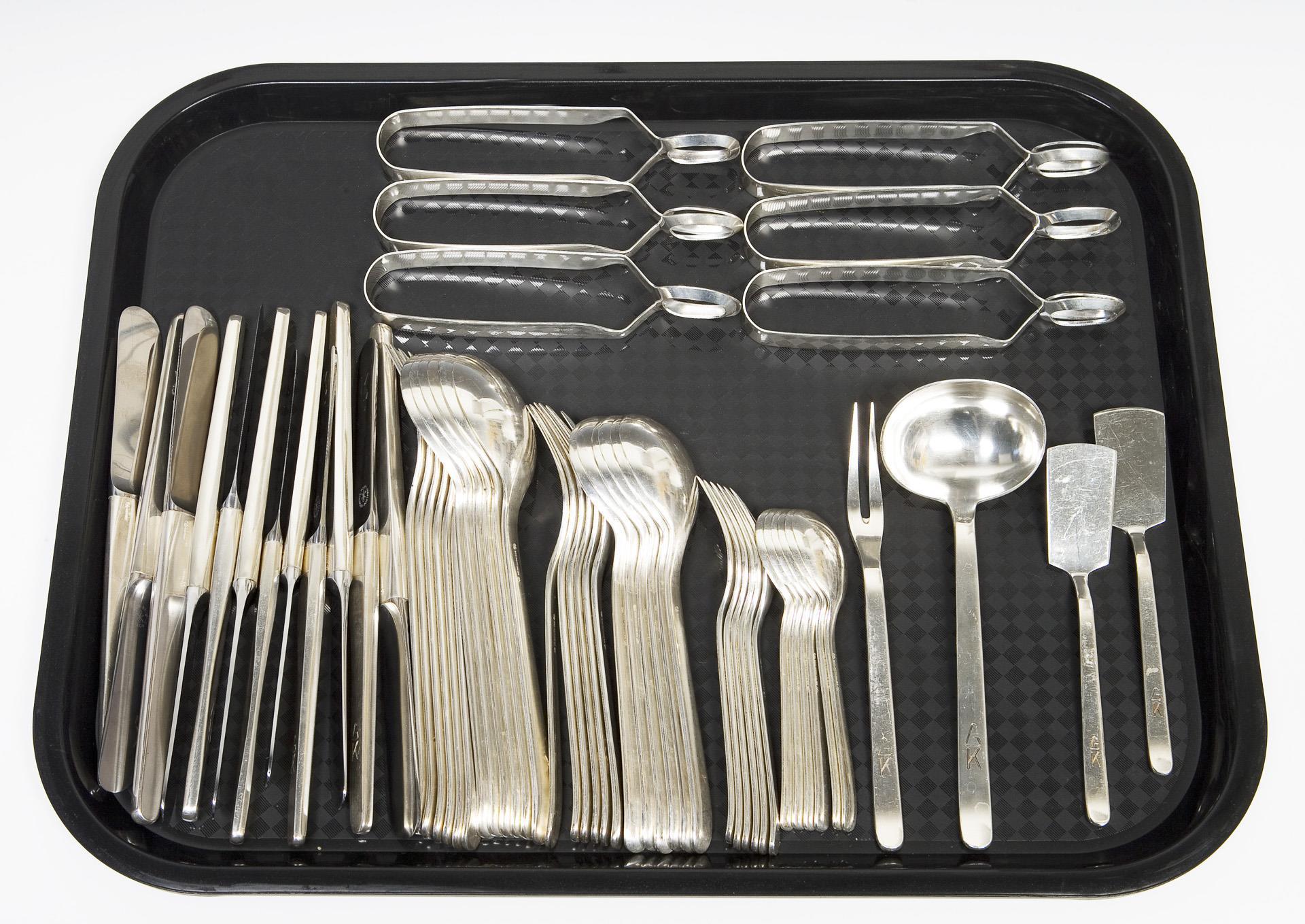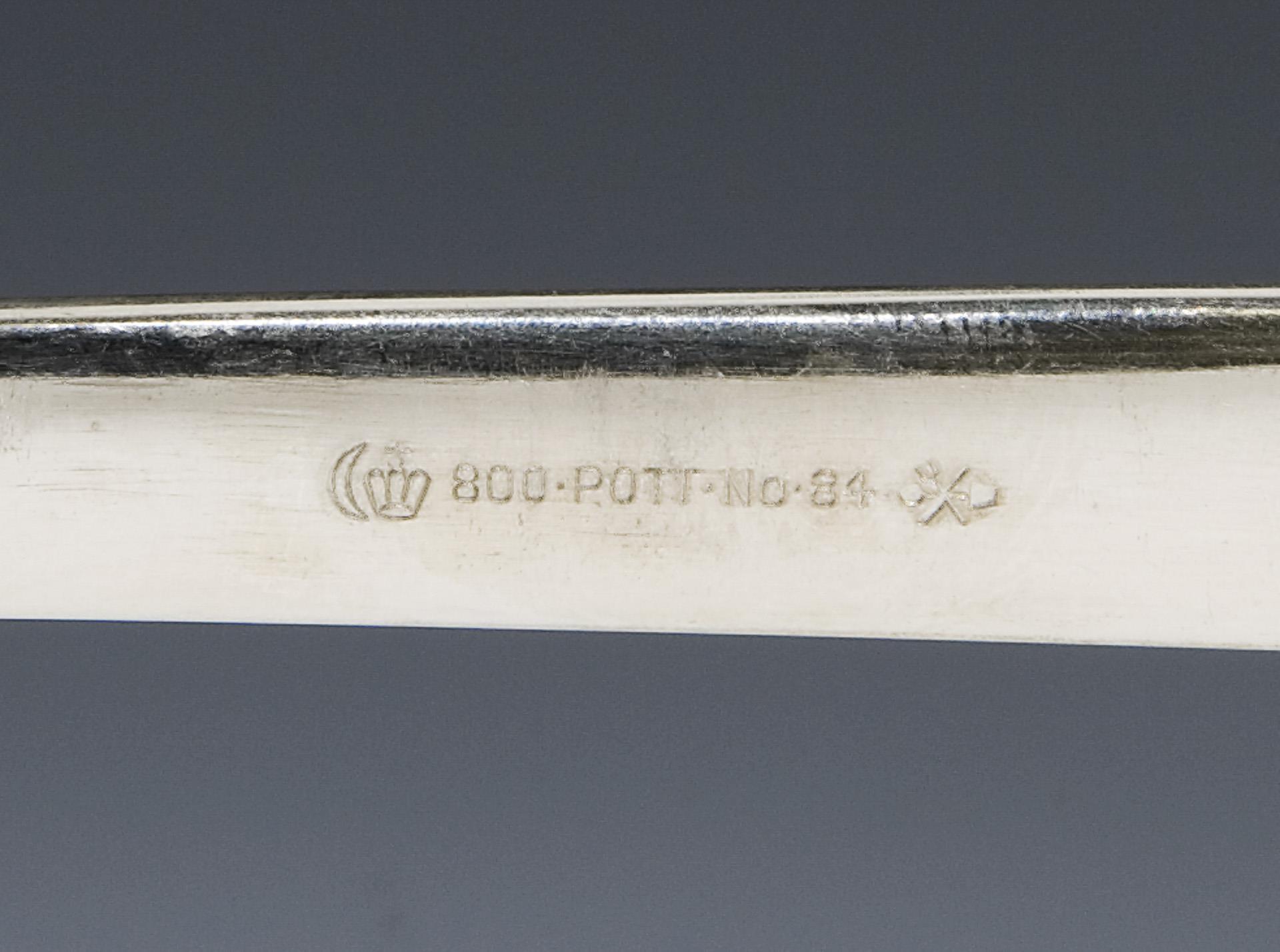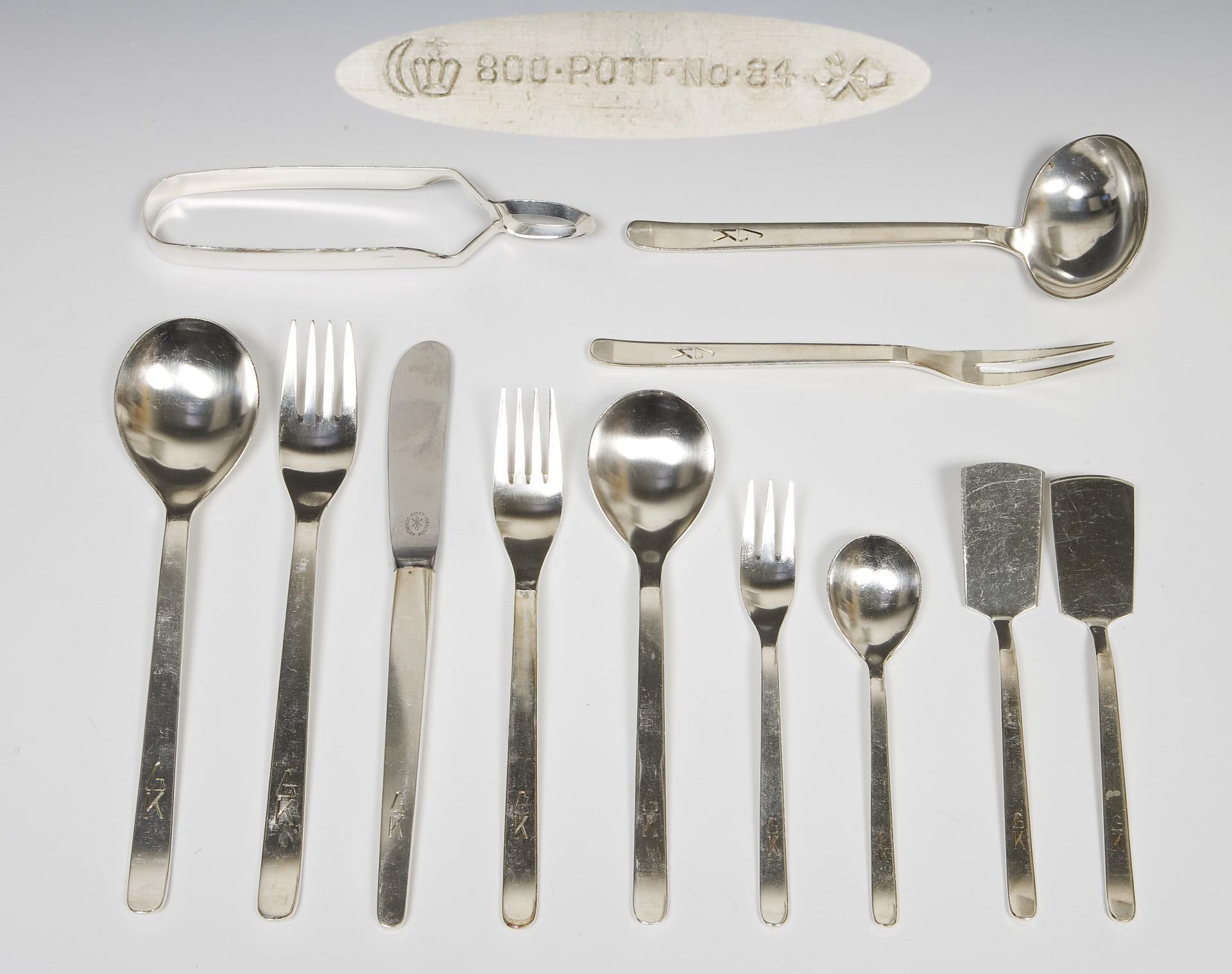 Model by Carl Pott 1952, the so-called "Kanzlerbesteck". Cutlery pattern no. 84. 58 pieces: 12 knives, 6 forks, 6 tablespoons, 6 dinner forks, 6 dinner spoons, 6 cake forks, 6 coffee spoons, 1 serving fork, 1 gravy ladle, 2 pie servers, 6 snail tongs. Design classics, solid, high-quality work, engraved monogram GK, knives with stainless steel blades. In addition to Ludwig Erhard's Chancellery, almost all German embassies were equipped with this cutlery. Hallmarks: Crescent and crown, fineness, factory mark.