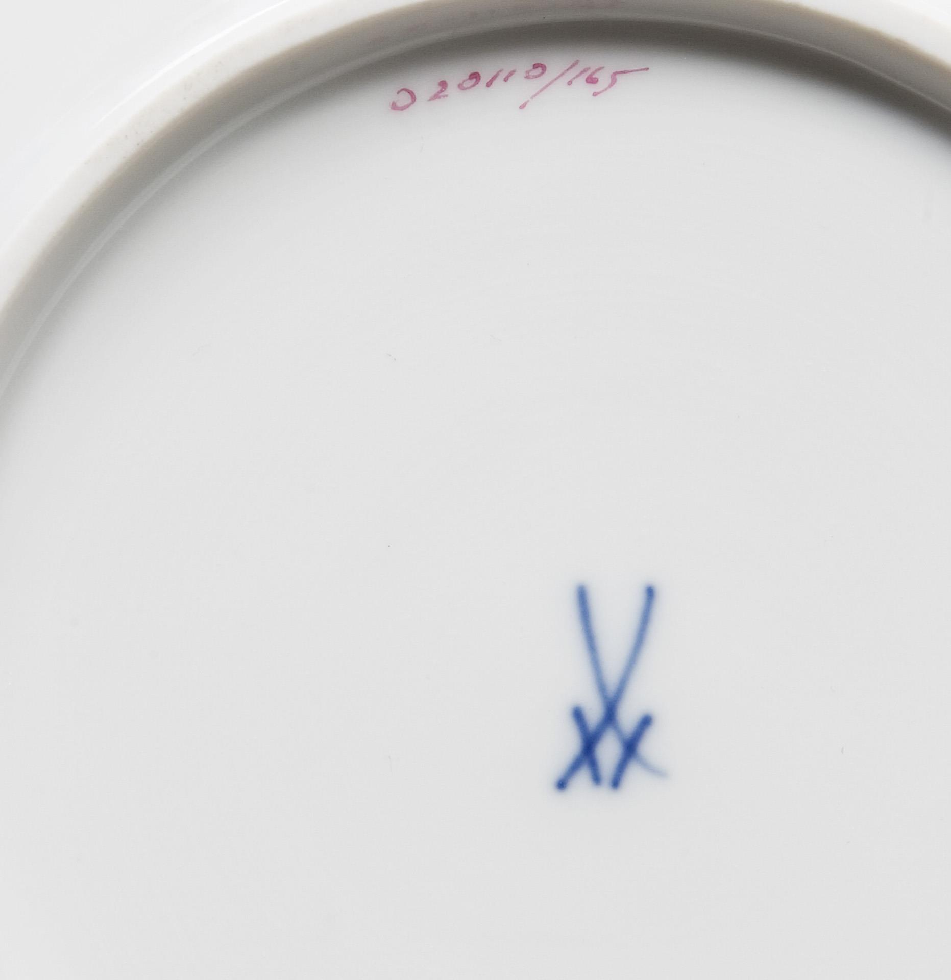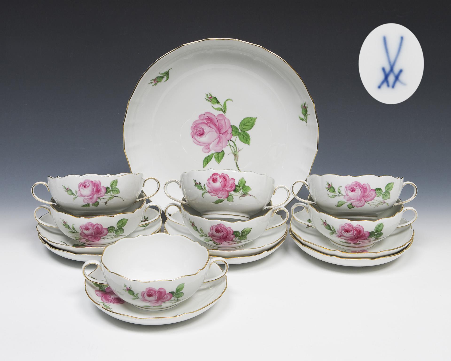 "New cut-out" shape, colored painting, gold staffage, "Red Rose" decoration. Press marks, painter's marks, sword marks, bowl 1992. One rim minimally bumped.