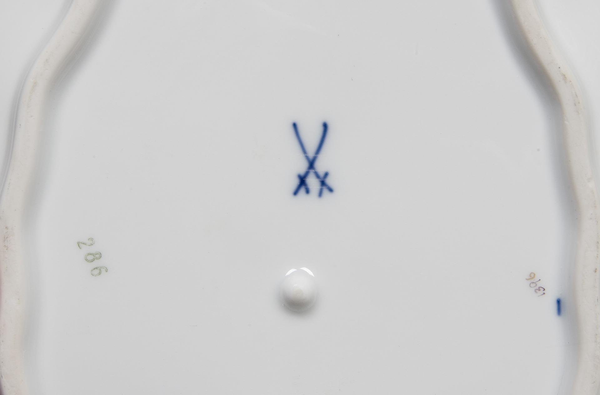 24 pieces: Teapot, milk jug, sugar bowl, rechaud, tea light holder, 6 cups, 6 saucers, 6 dessert plates, pastry bowl. "Neue Ausschnitt" form, colored painting, gold decoration, "Rote Rose" decoration. Press marks, painter's marks, sword marks, six sword marks with dot, pastry dish painted four times, dessert plate 1924-1934.