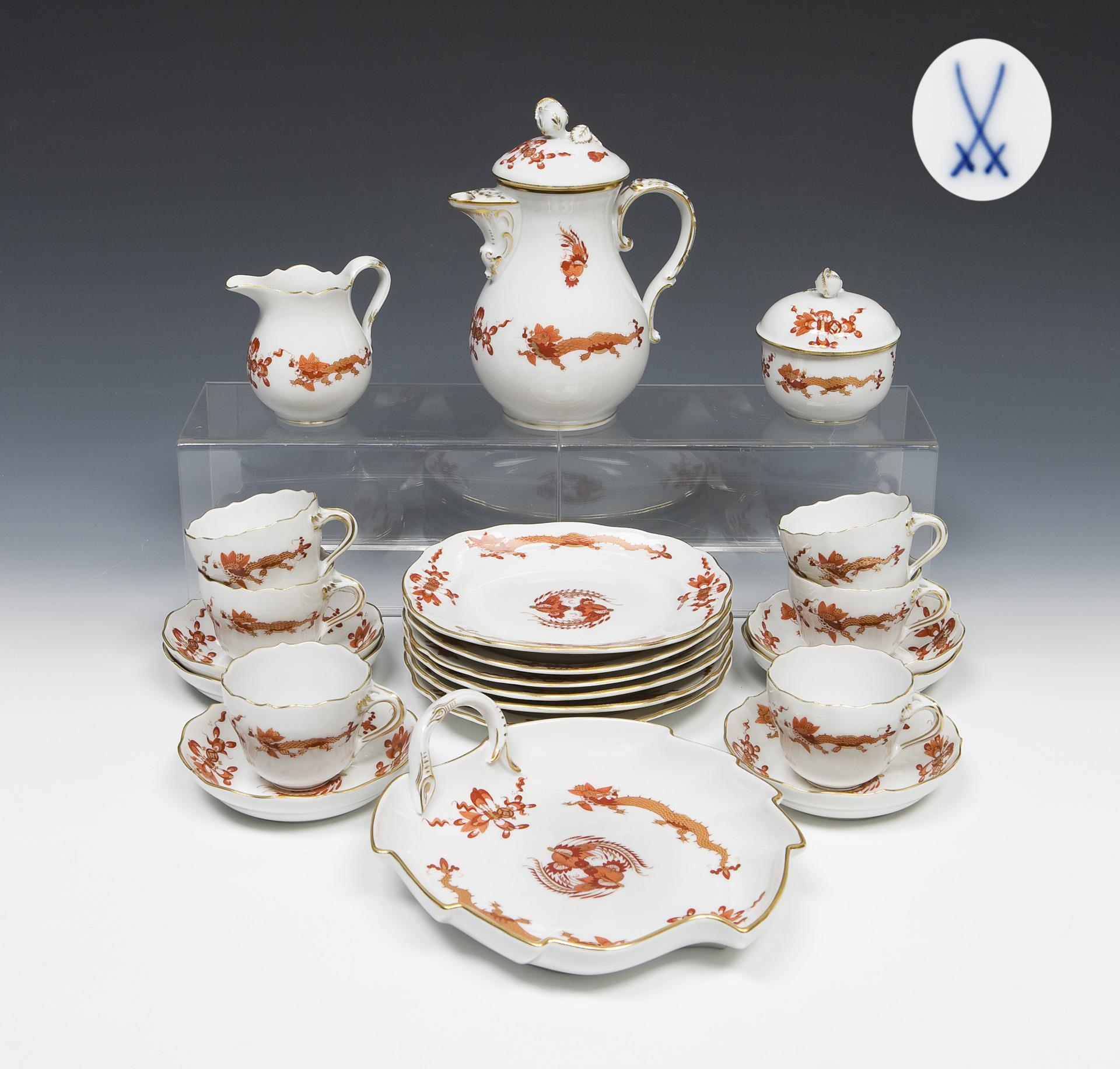 "New cut-out" shape, Camaieu painting in iron red, shaded gold, gold painted, "dragon decoration". 22 pieces: Demitasse pot, milk jug, sugar bowl, pastry bowl in leaf shape, 6 demitasse cups, 6 saucers, 6 dessert plates. Press marks, painter's marks, sword marks, dessert plates 1935-1947, painted four times. One rose minimally bumped.