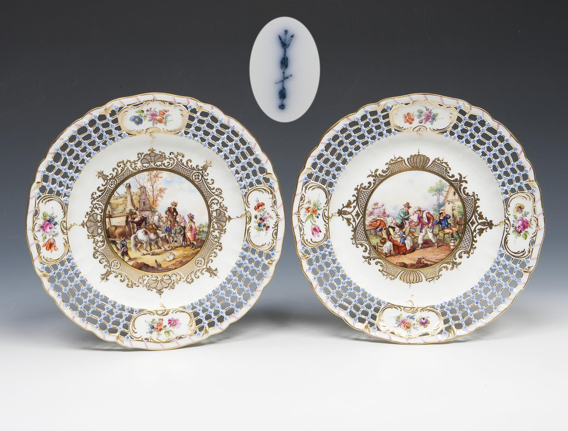 Model and painting based on the Meissen model, the open-worked flag with applied, blue painted forget-me-not flowers and four relief cartouches. Colored painting with flower bouquets in the cartouches, black contoured wide gold reserves with latticework in the mirror, fine colored genre painting after old master paintings, gold staffage. Press marks, blue sceptre marks painted once.