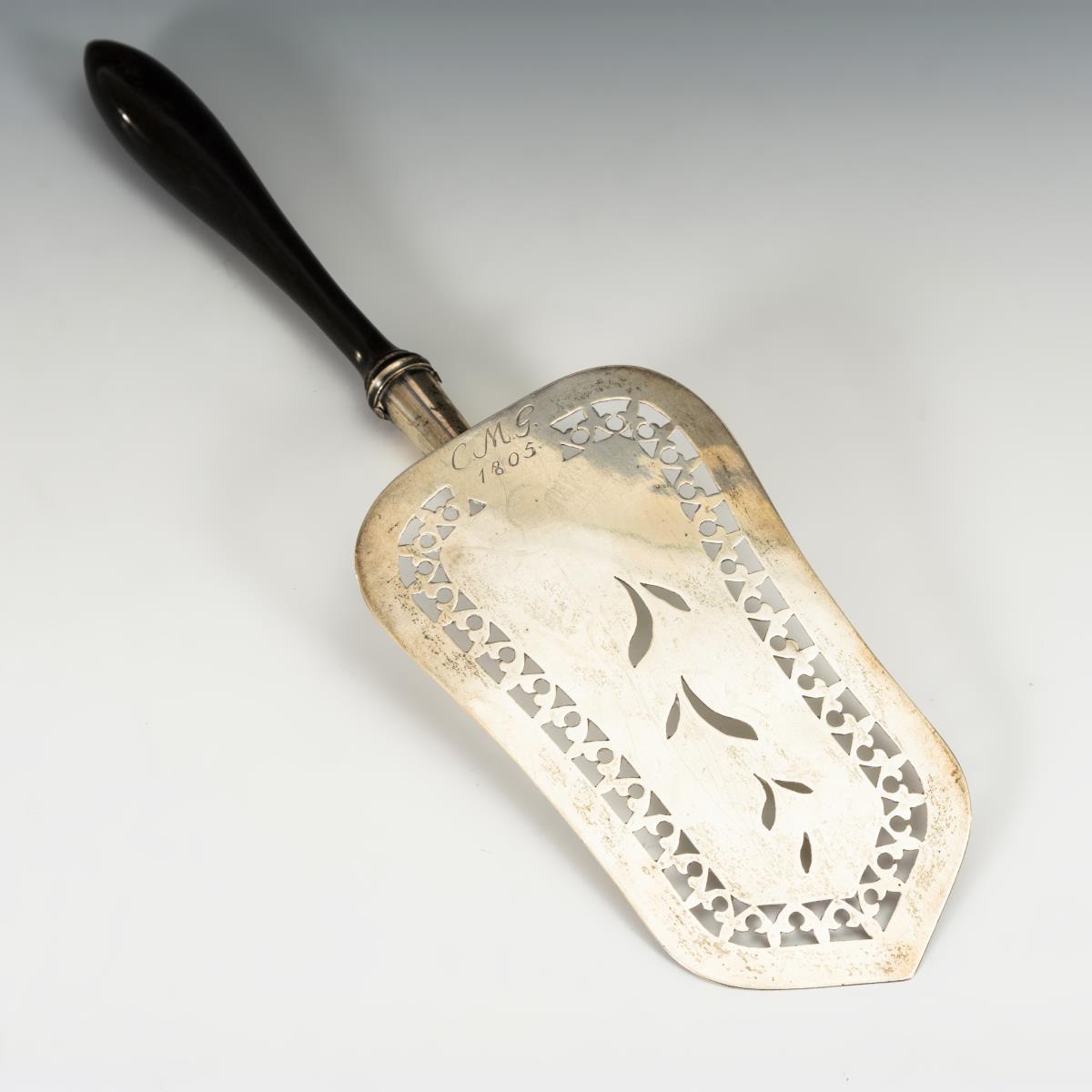 Meisterzeichen LGM/12 Lot gepunzt. 1. H. 19. Jh. Deutschland. L 31,5 cm. 128 g (mit Griff). Floral durchbrochen gestalteter Heber mit ebonisiertem Holzgriff, verso graviert "C.M.G. 1805". Griff leicht gelockert, leichte Gebrauchsspuren..