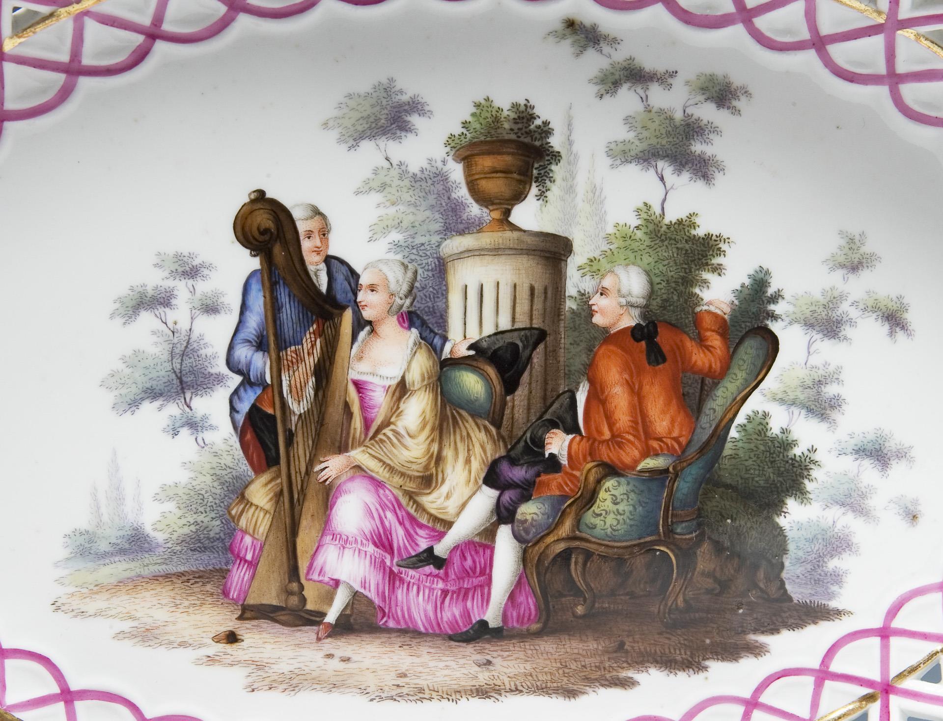 The open-worked banner with four relief cartouches and color-painted flower bouquets. The mirror with a large area of fine color painting with an elegant genre scene "Courtly Society in the Park", painted purple and gold. Press mark, crossed swords mark painted twice. Glaze defects, stand ring minimally bumped.