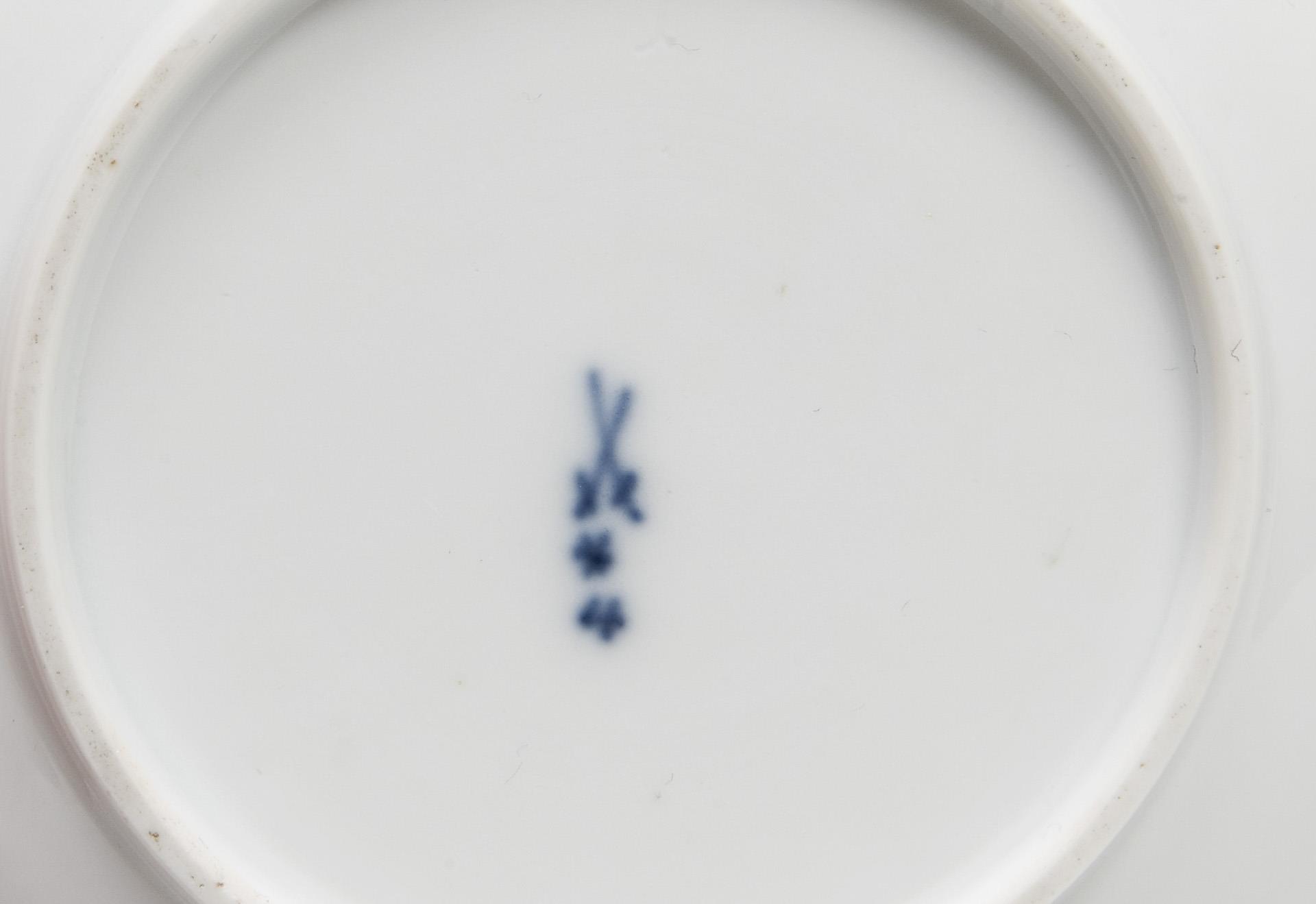 Cobalt blue rims, colorful painting with three different genre scenes after designs by Jean Antoine Watteau (1684-1721). Hemispherical cup with curved ear handle, domed lid with sculptural flower pommel, smooth rims. Impression marks, sword marks with star and painter's mark 4.
