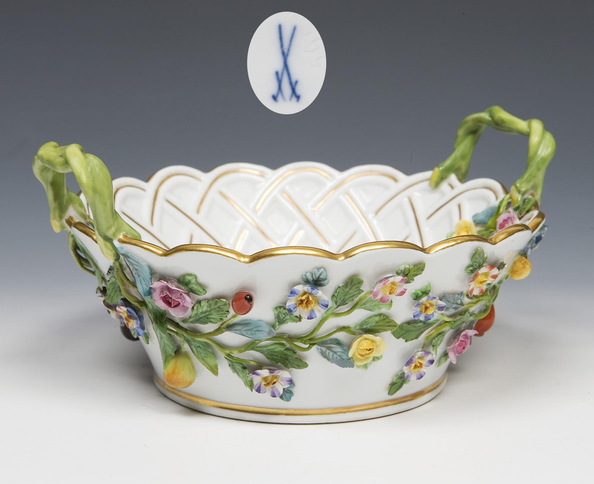 Handled basket with sculptural flower covering. Meissen.