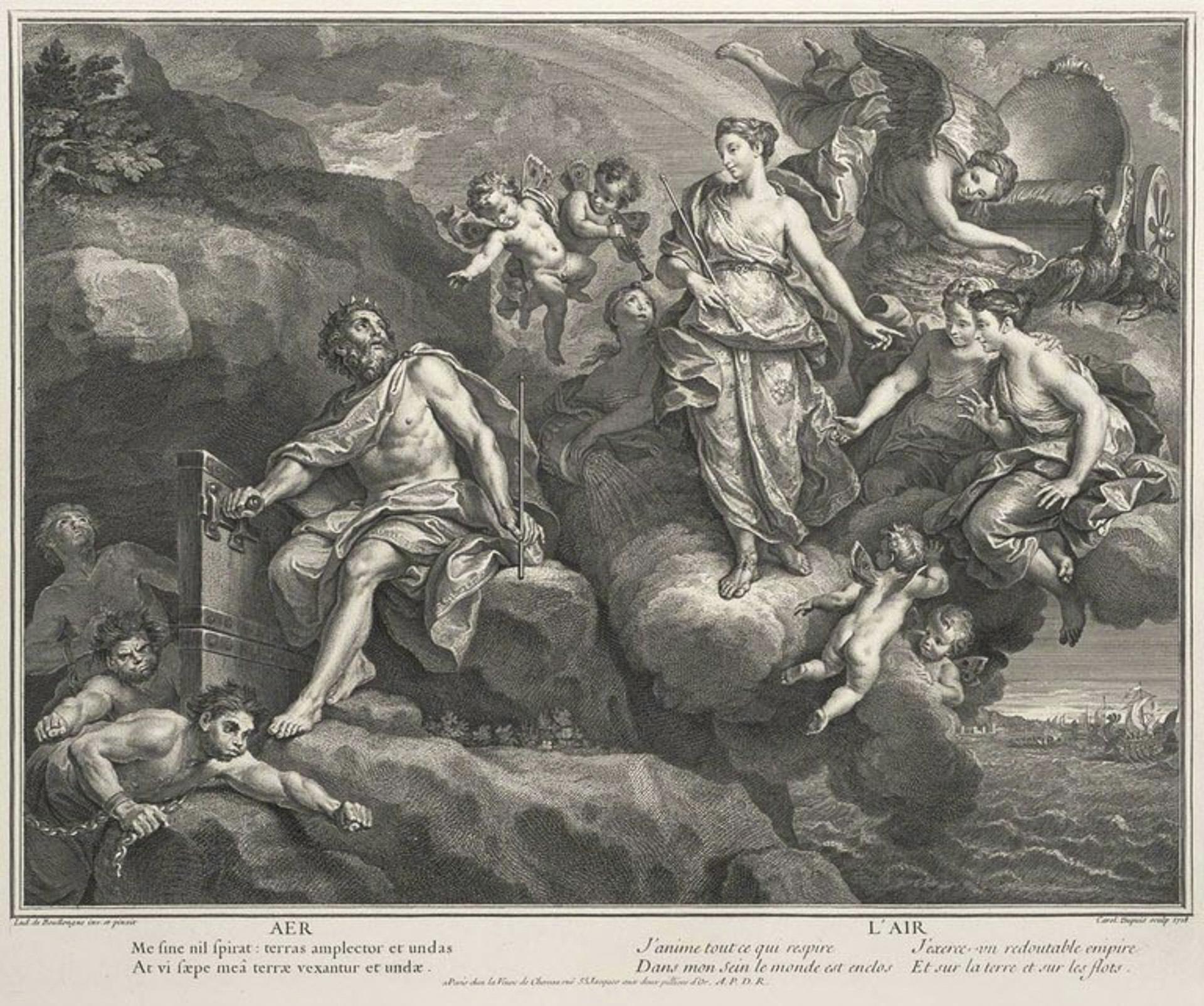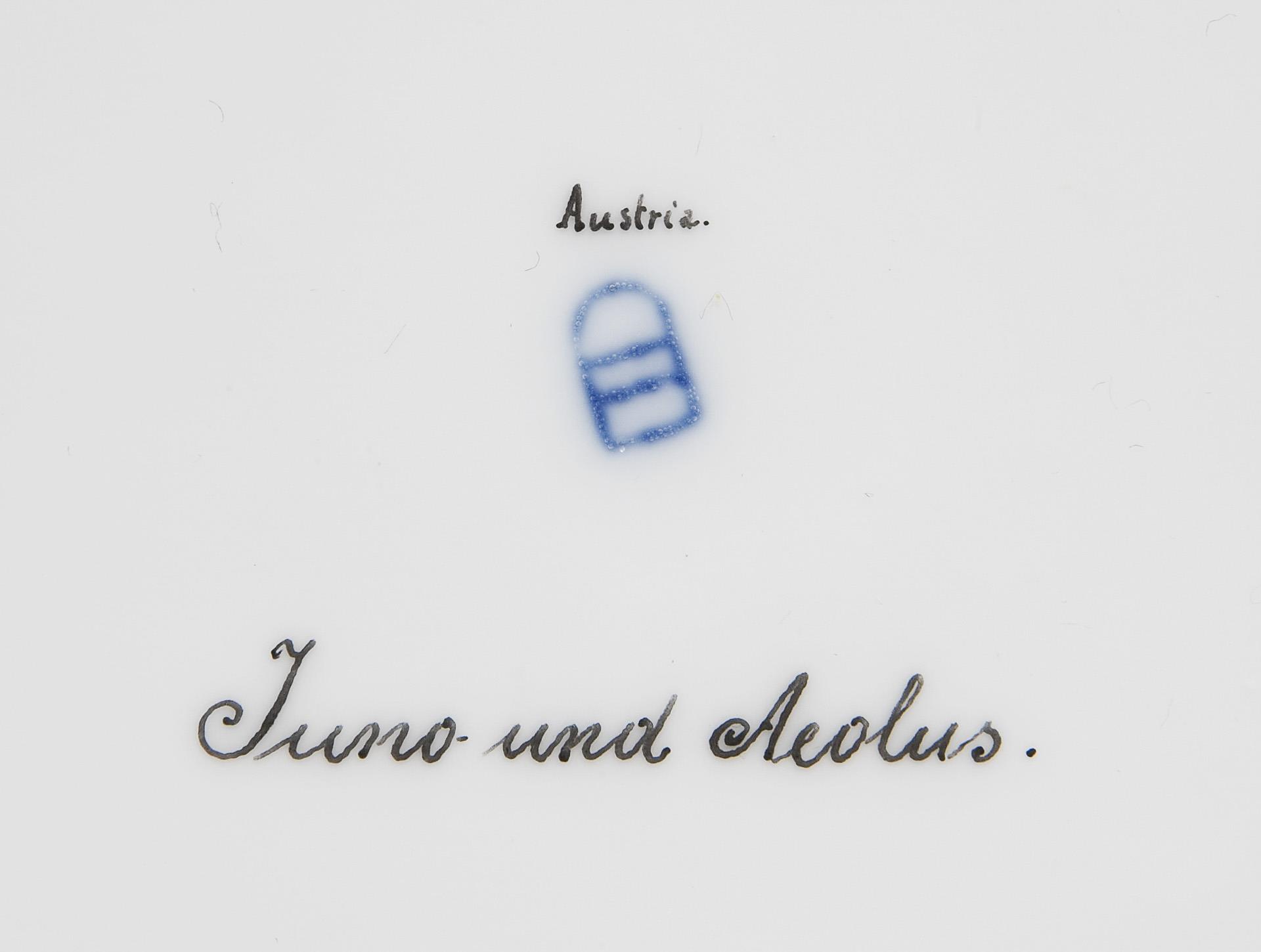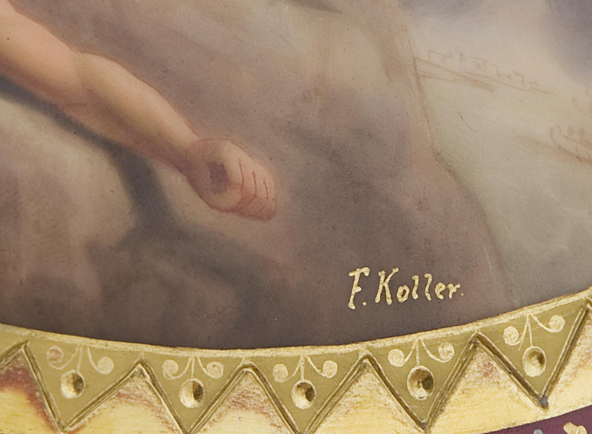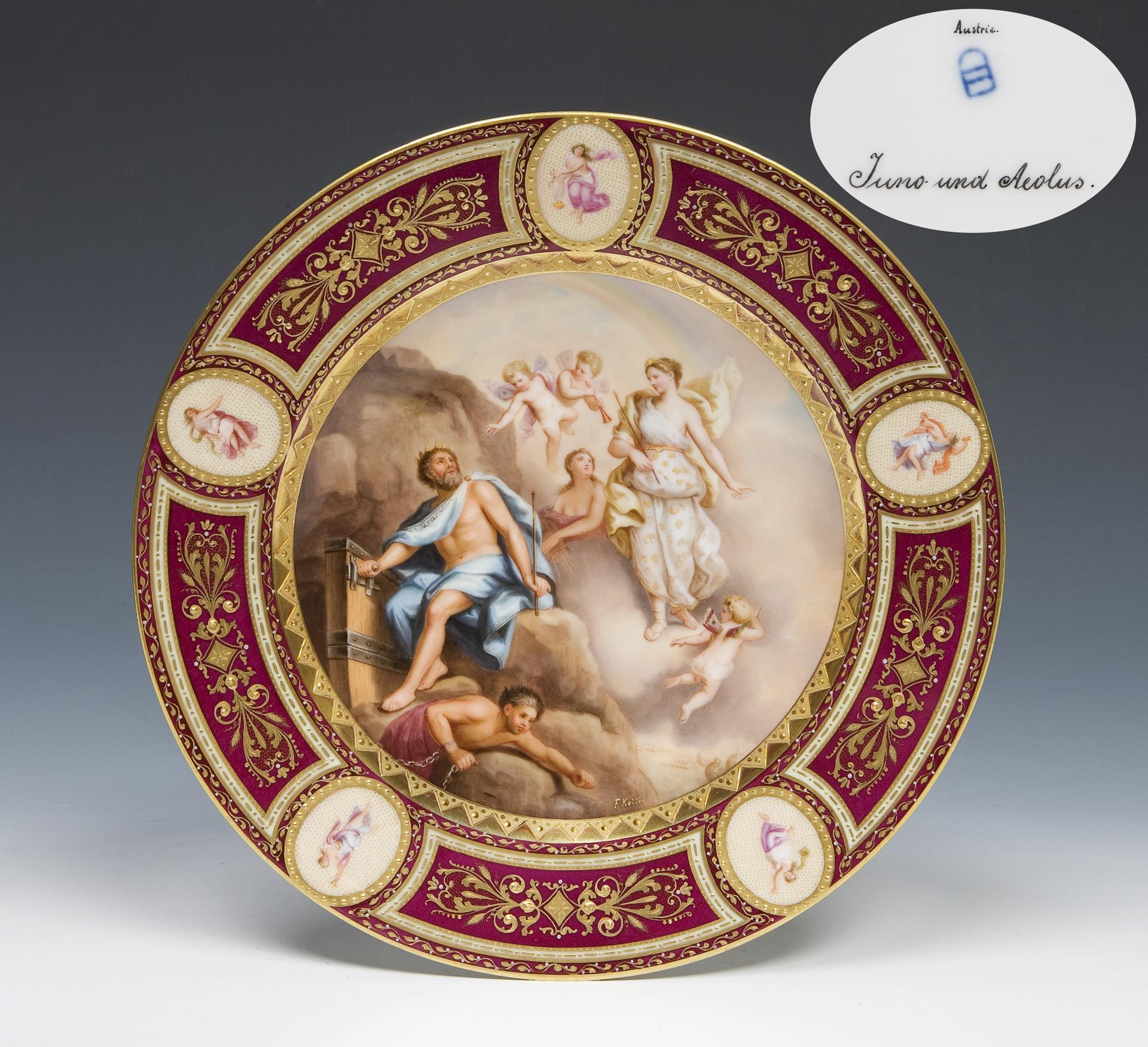 Rich ornamental decoration in relief gold over purple fond reserves in the old Viennese style. In the mirror very fine colored painting F. Koller signed, "Juno and Aeolus" after a painting by Louis de Boullogne (1654 Paris - 1733 Paris). Painting detail of allegory "The Air" from a series "The Four Elements". Nymphs floating on the banner in five oval reserves. Pseudo-bandage mark, black title with addition Austria.