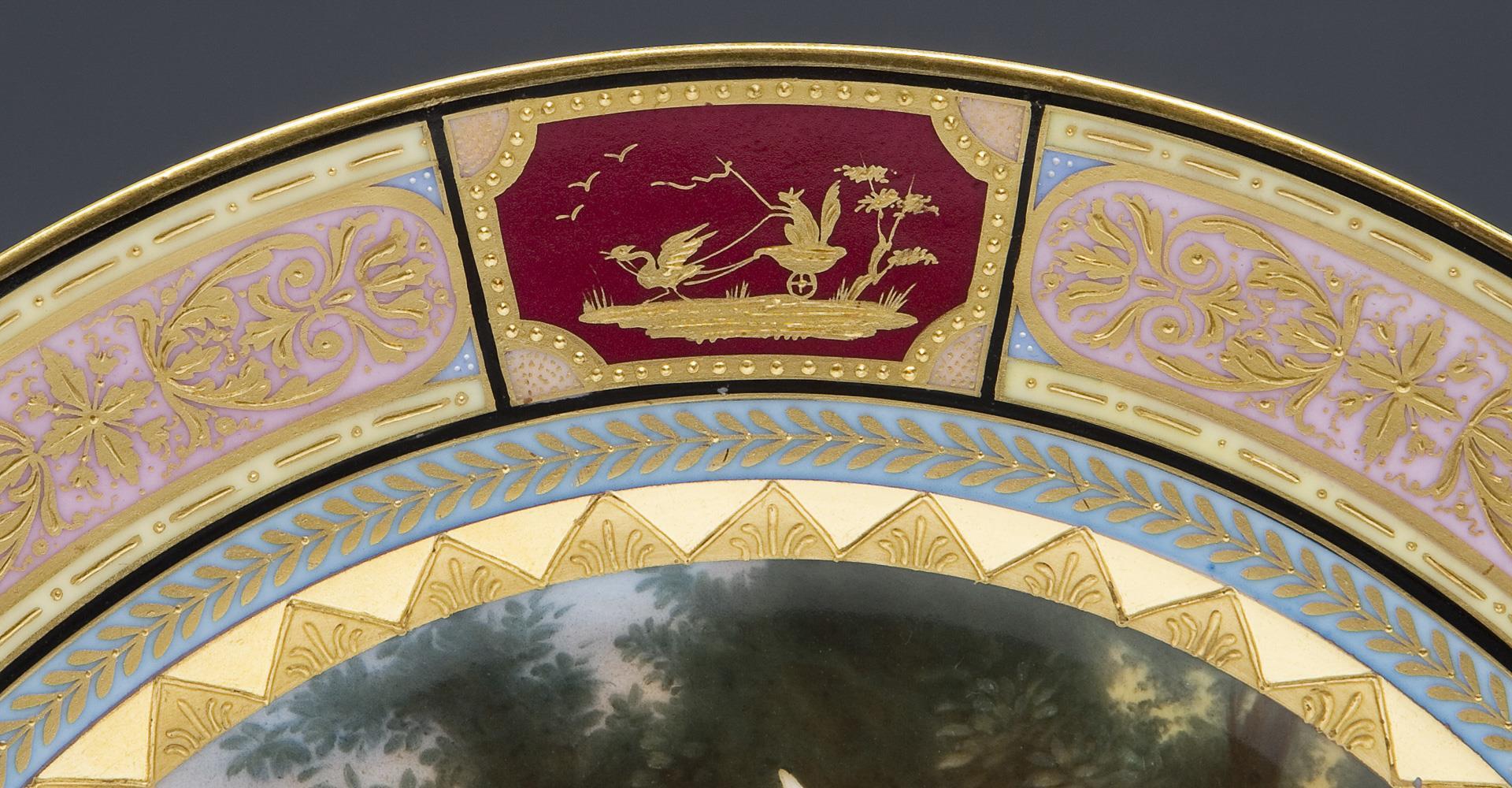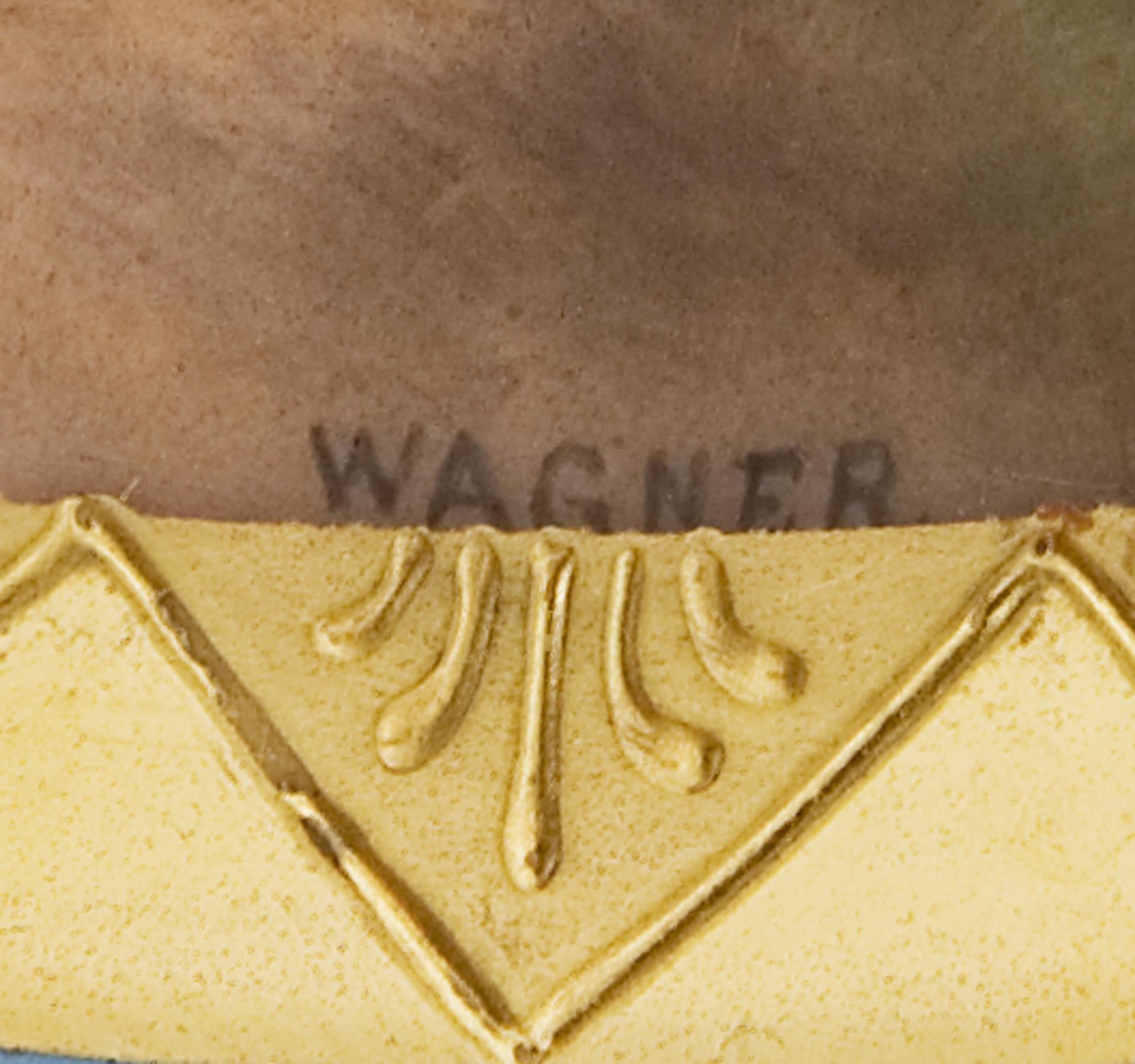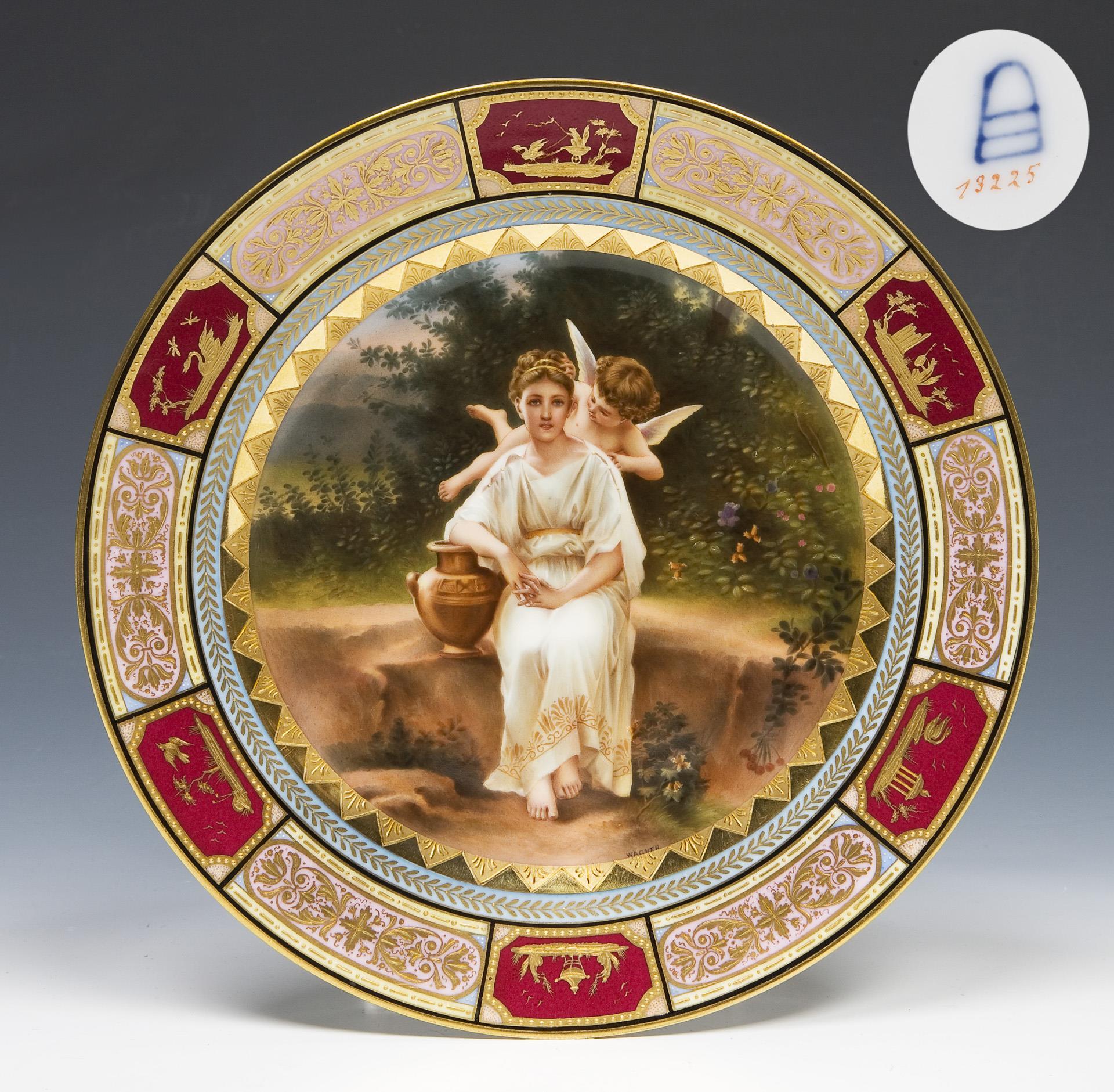 Rich ornamental decoration with landscape islands and floral elements in gold relief over colored fond reserves in the old Viennese style. Very fine colored painting in the mirror, signed by Wagner, "Liebesgeflüster" after a painting by Adolphe William Bouguereau (1825 La Rochelle - 1905 La Rochelle). The original hangs in the Museum of Art in New Orleans. Pseudo-bandage mark, red painter's number.