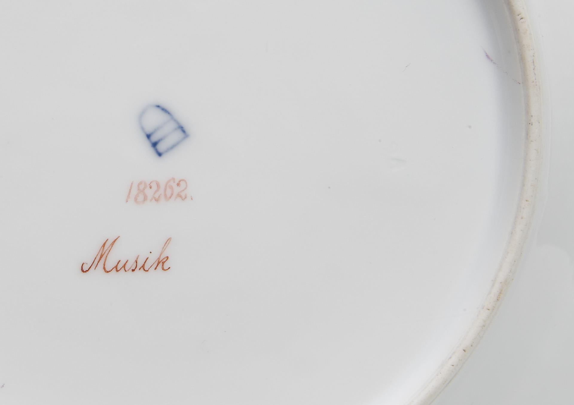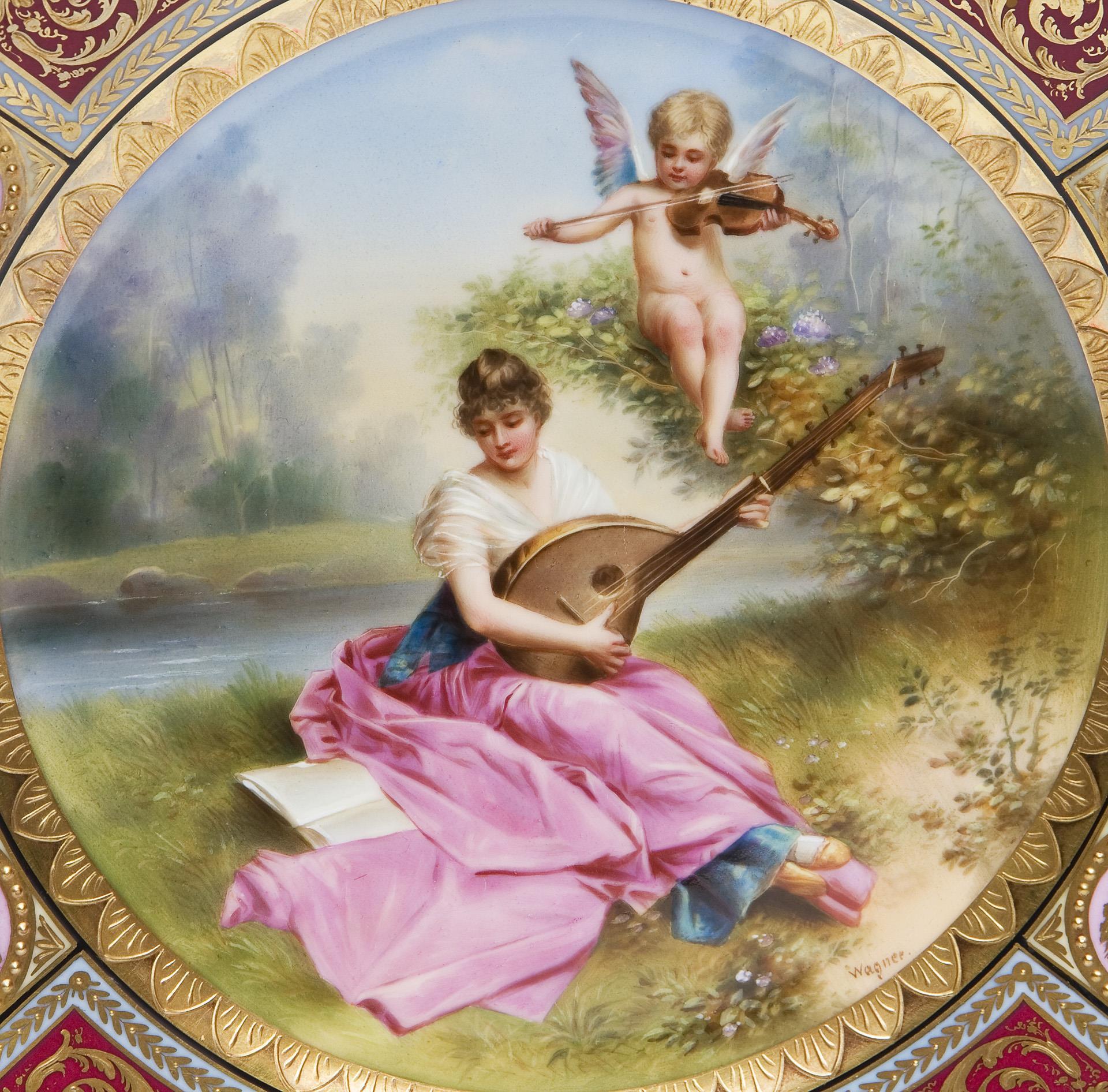 Rich ornamental decoration with landscape islands in gold relief over colored fond reserves in the old Viennese style. Very fine colored painting in the mirror, Wagner signed "Allegorie-Die Musik" after a painting by Vojtêch Hynais (1854 Vienna - 1925 Prague). Pseudo-binding mark, red title, red painter's number.